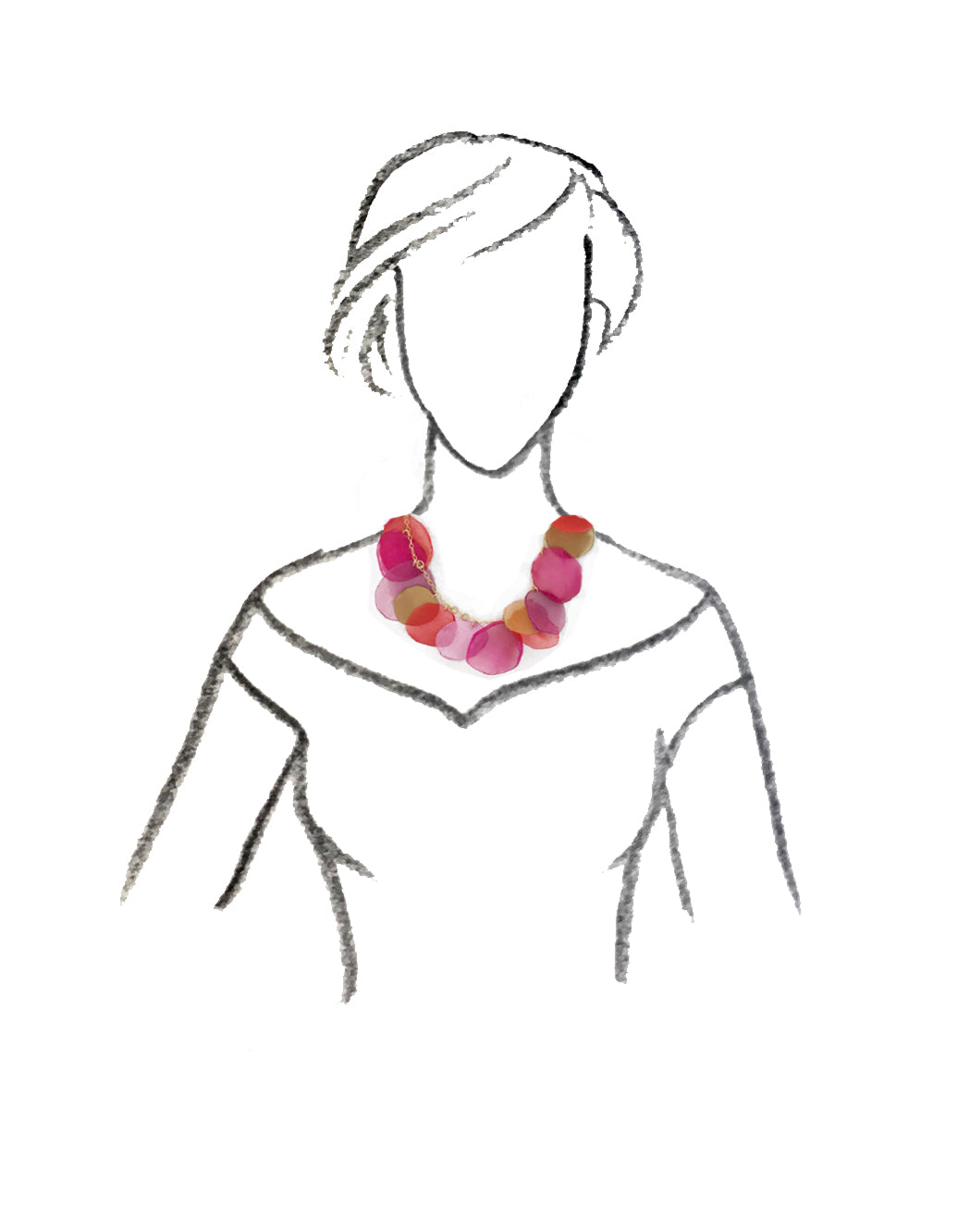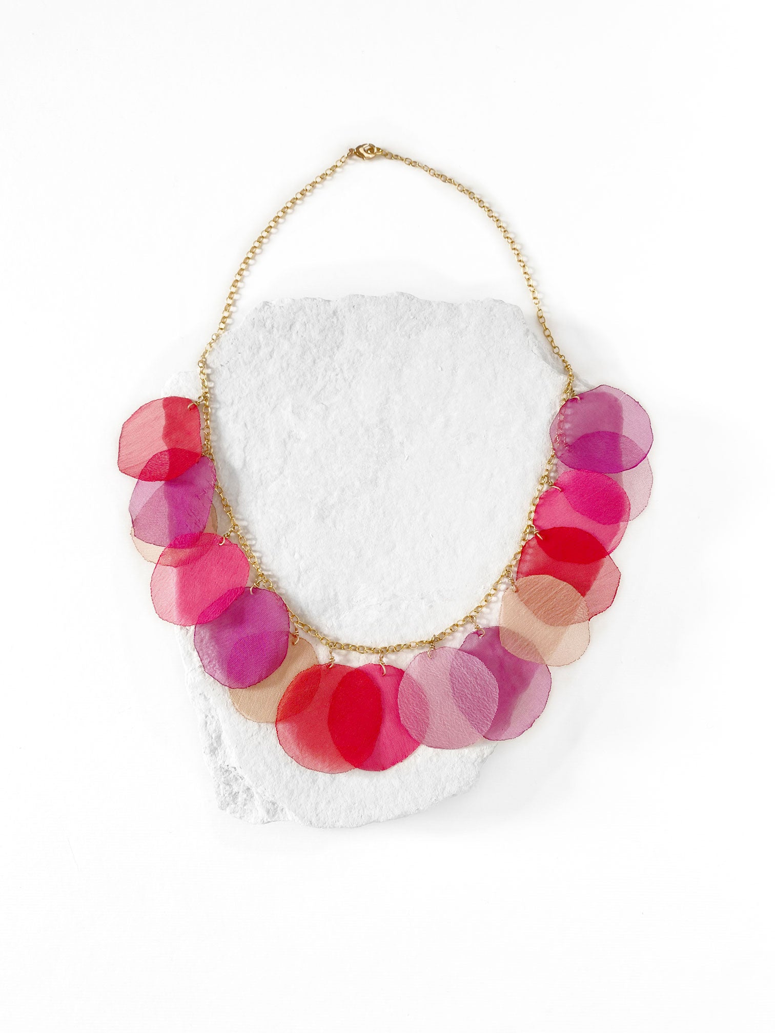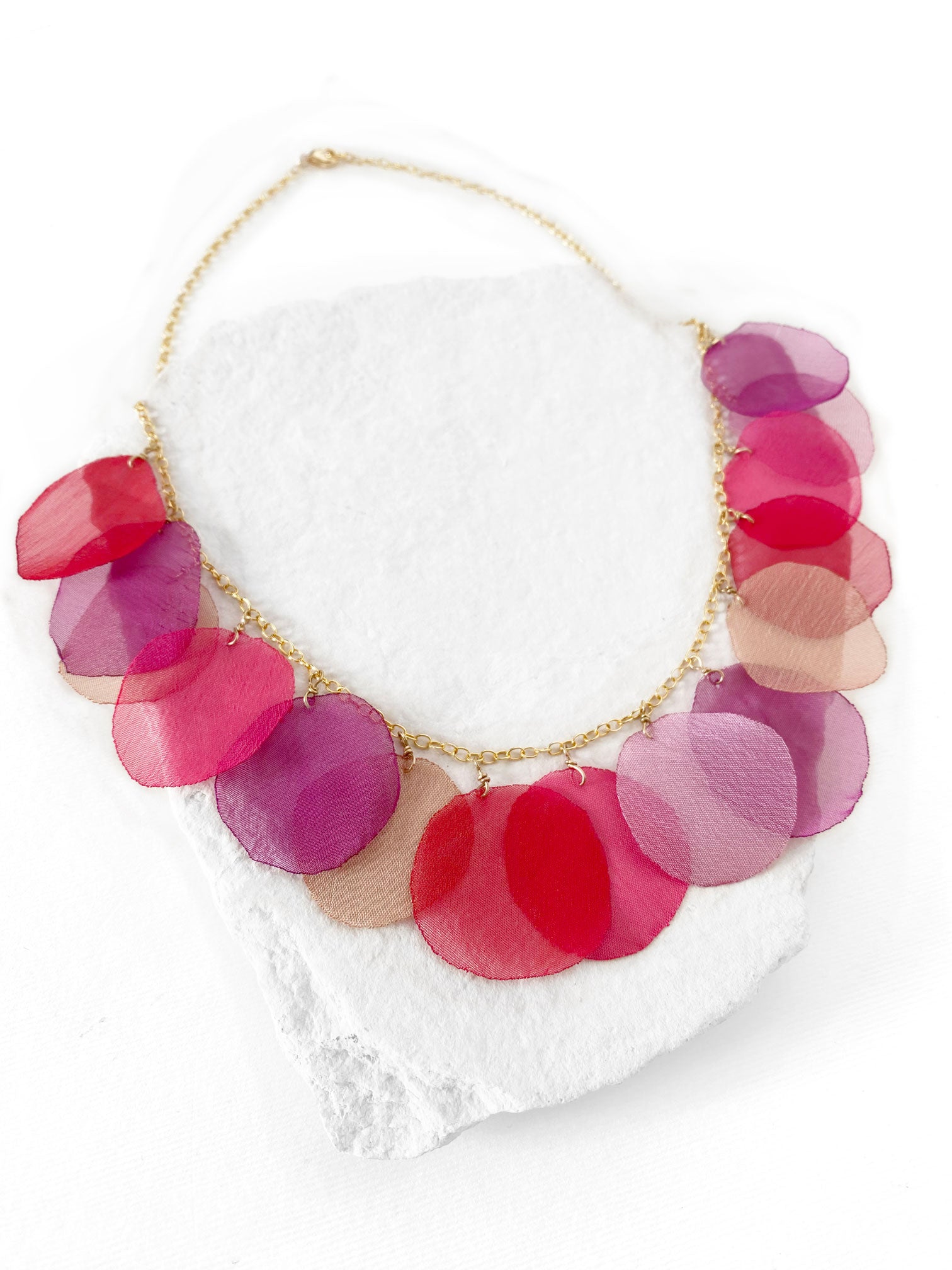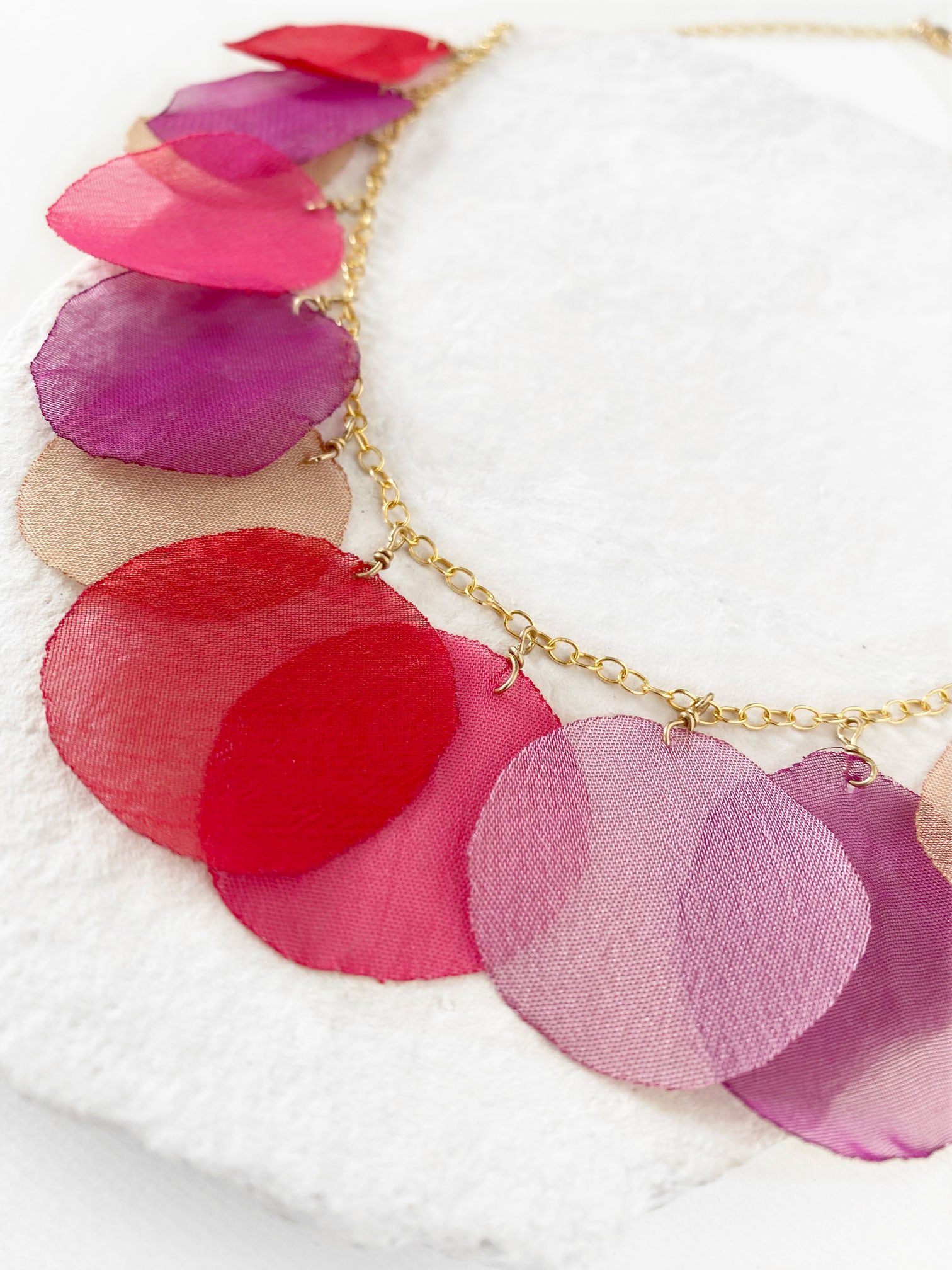 Gold plated chain necklace with applications of semi-translucent fabric petals in pink, red and ocher tones. Gold plated brooch. Complement your look with this necklace inspired by the lightness, joy and elegance of flowers.