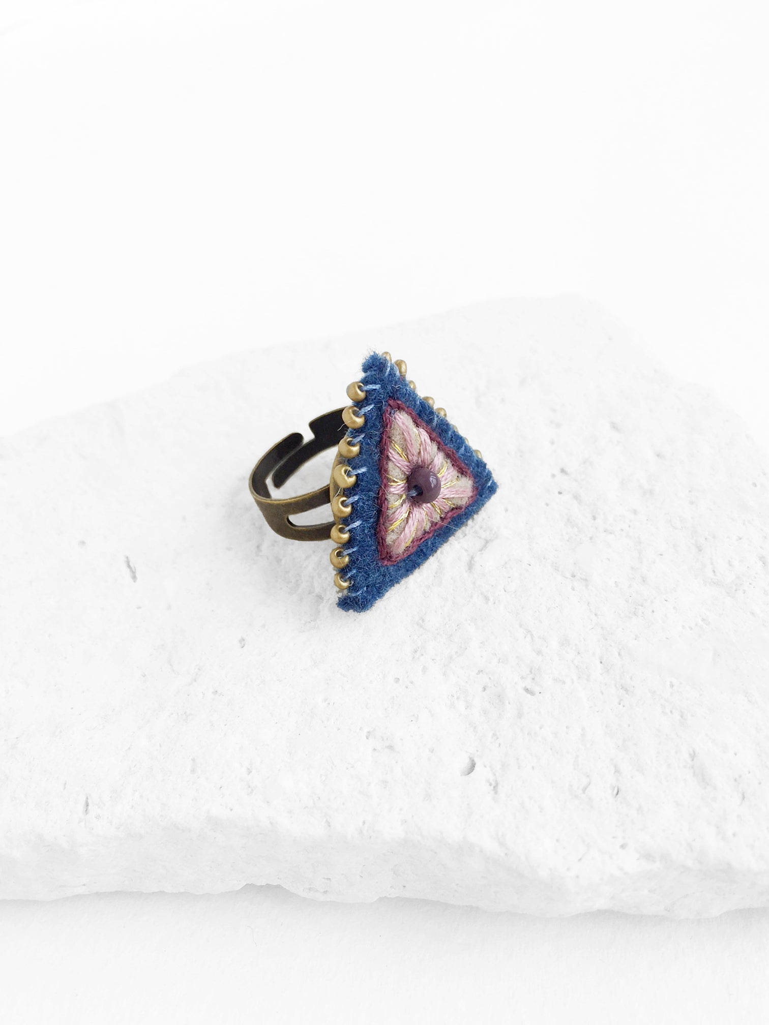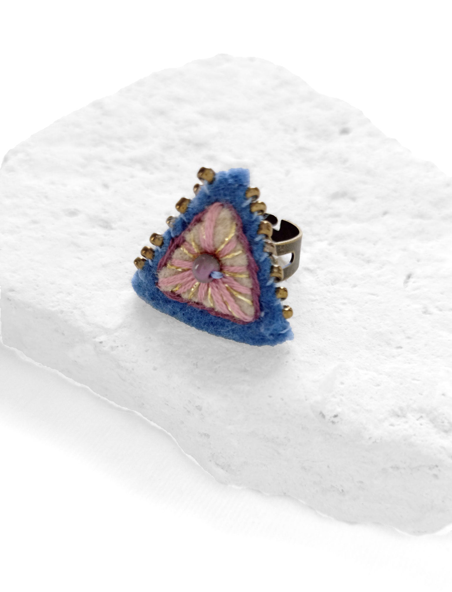 Anillo con figura textil triangular, bordada a mano con hilo de algodón color lila, azul e hilo metálico dorado, sobre fieltro color azul mezclilla. Pieza montada sobre base metálica.