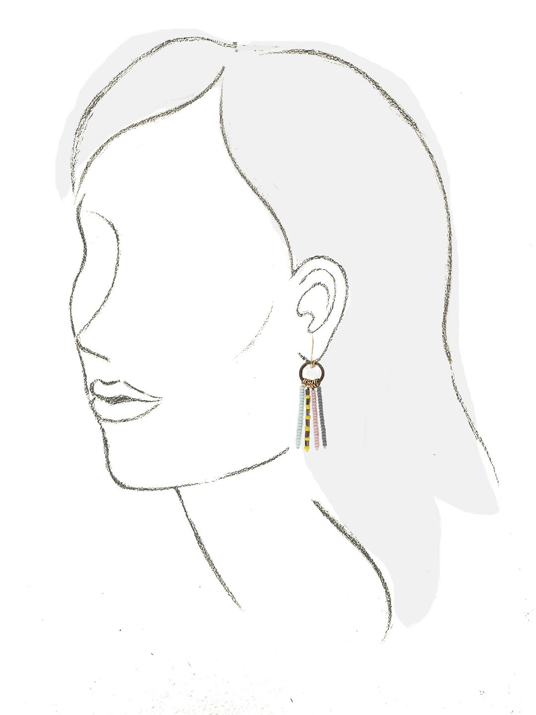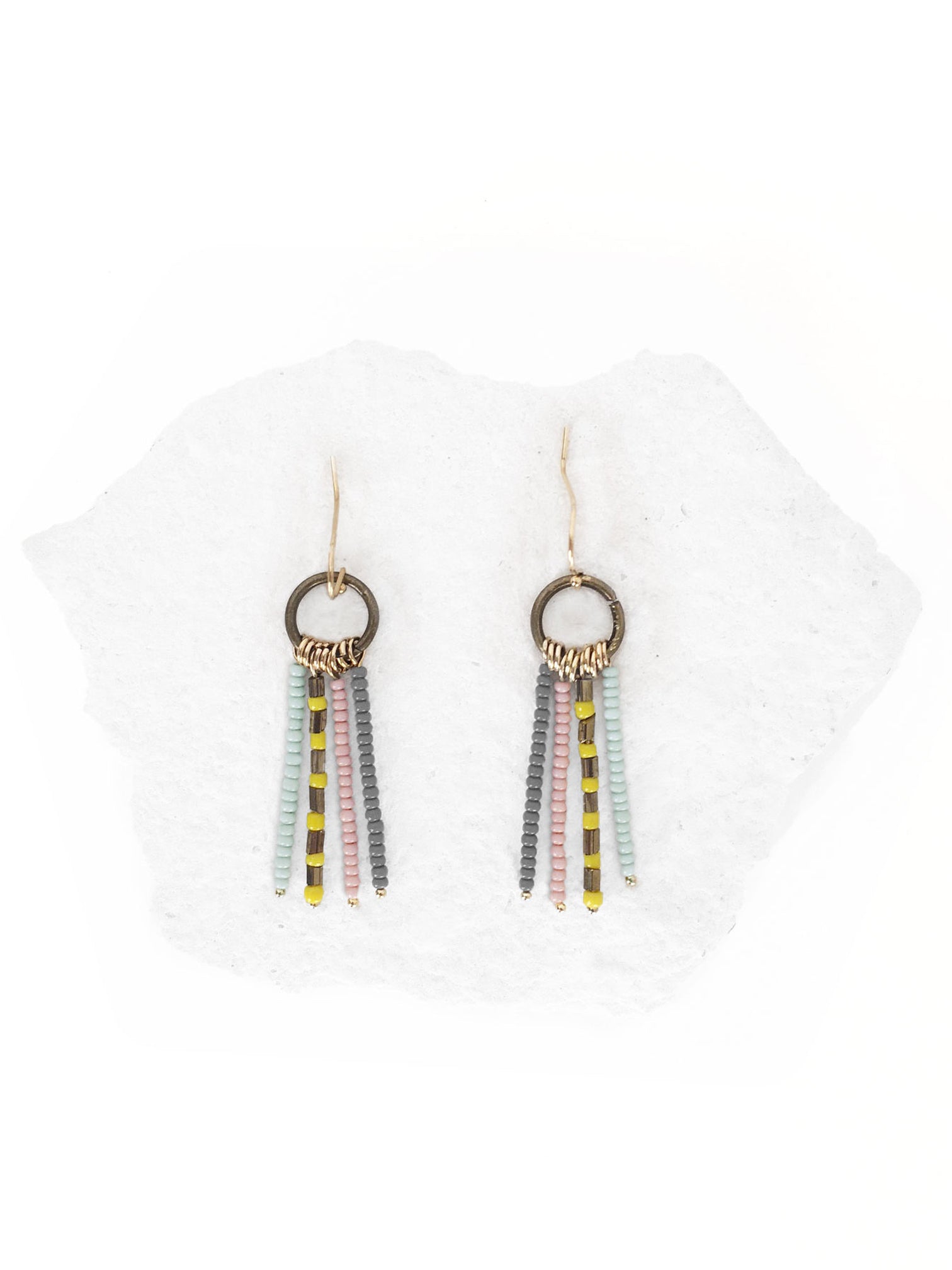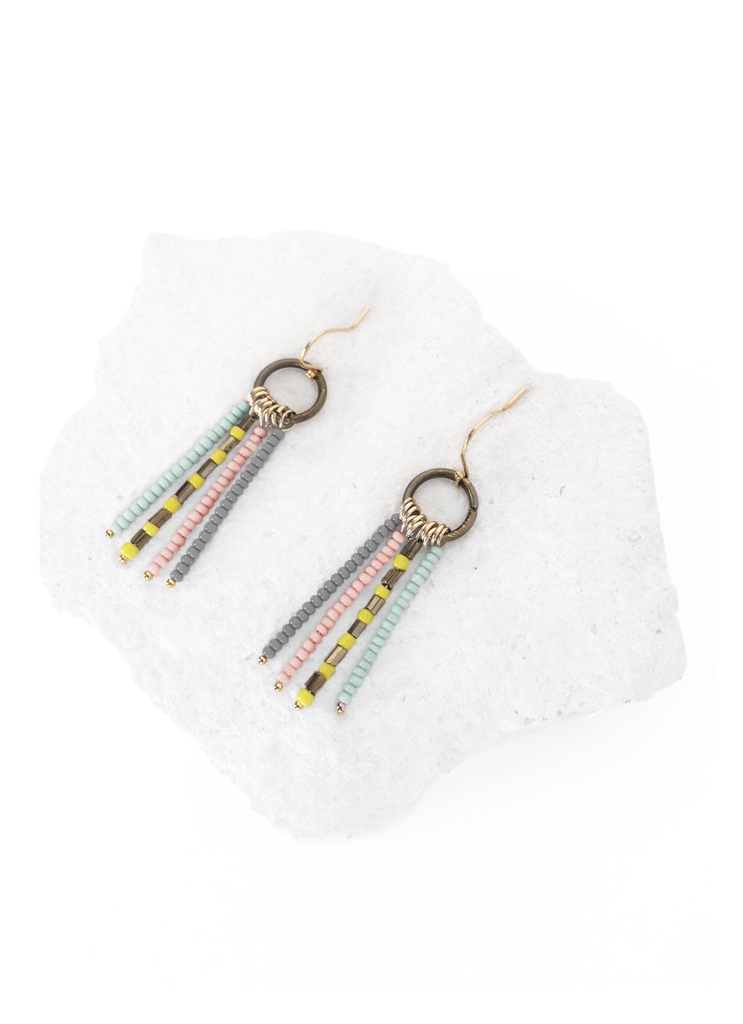 Aretes de alfileres de chapa de oro con cuentas de vidrio color rosa, gris, verde, amarillo y dorado, engarzados en aro redondo de metal. Gancho de chapa de oro. Inspirados la princesa Cleopatra y en el hábito de auto cuidado que tenía para resaltar su belleza.