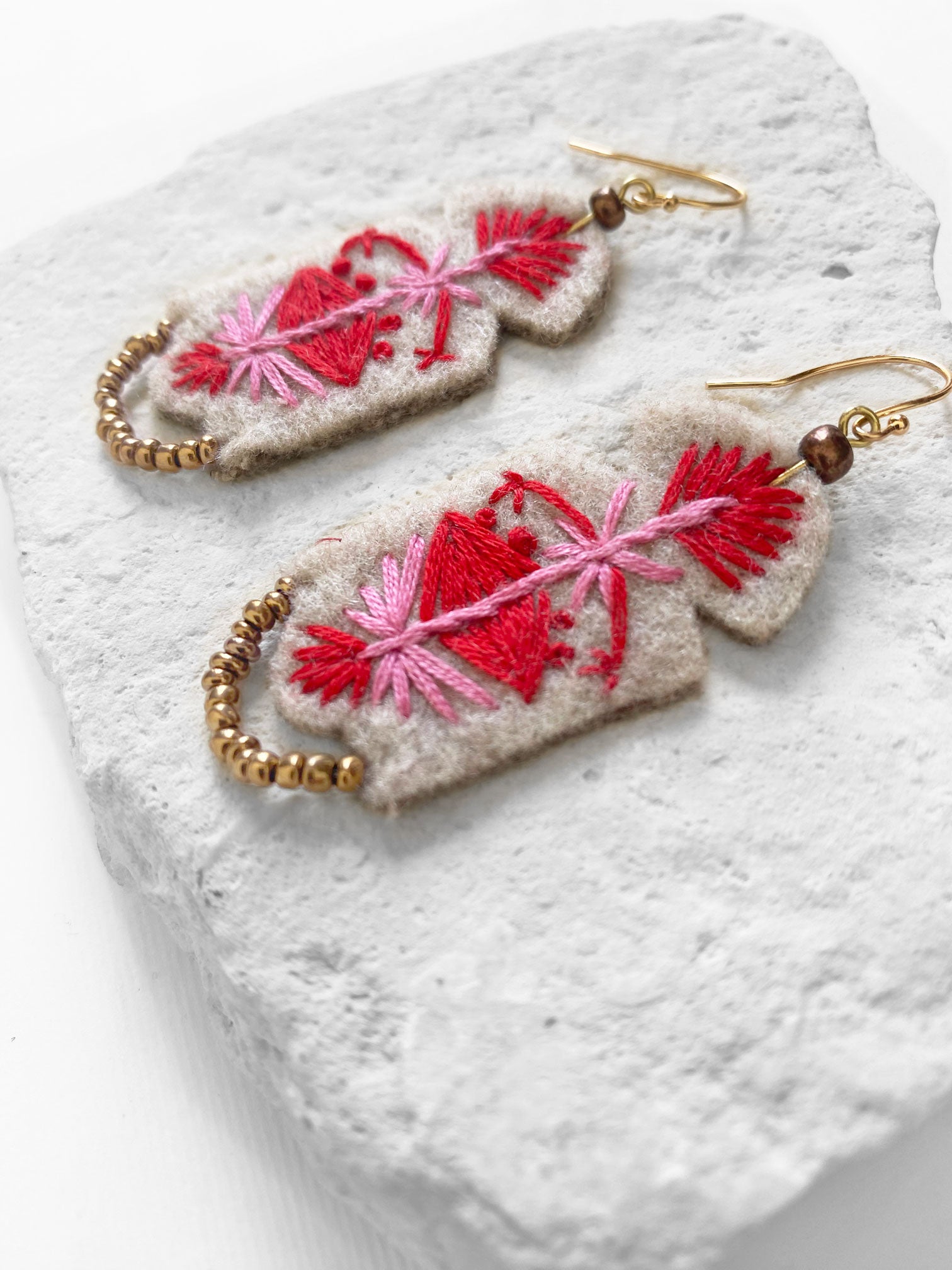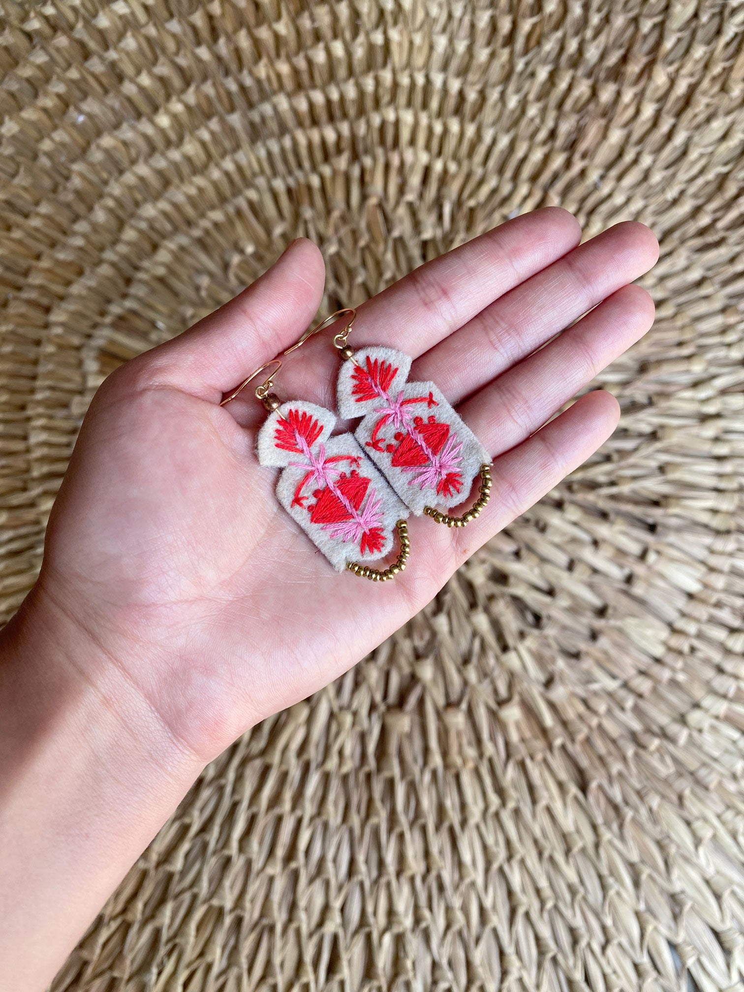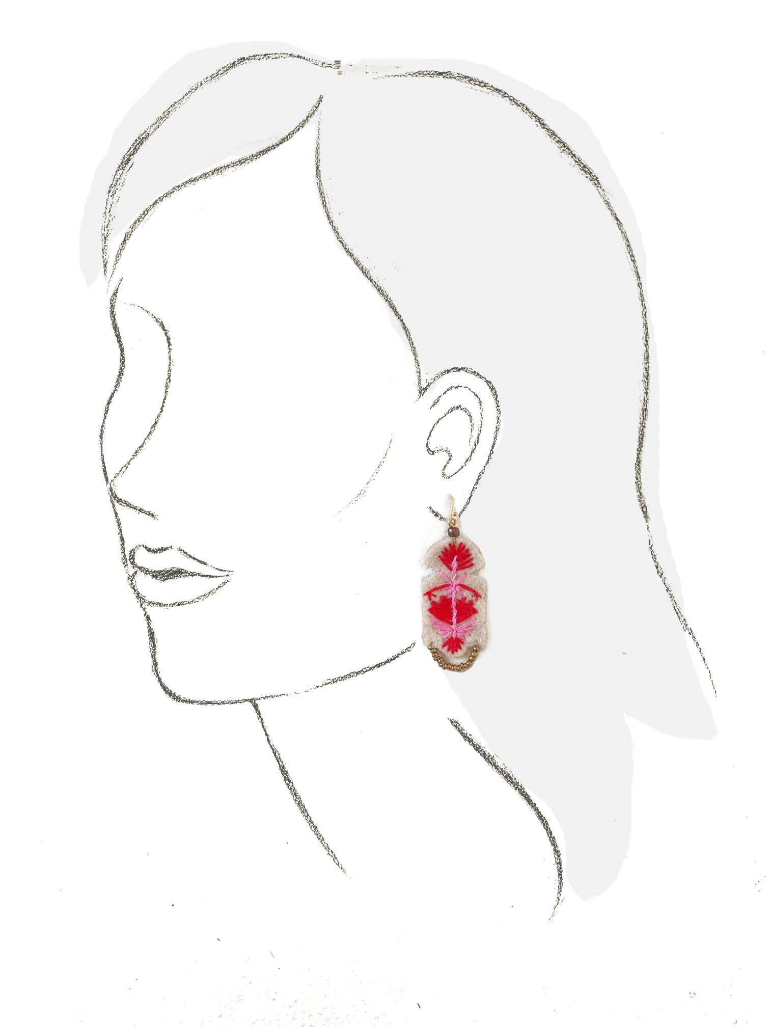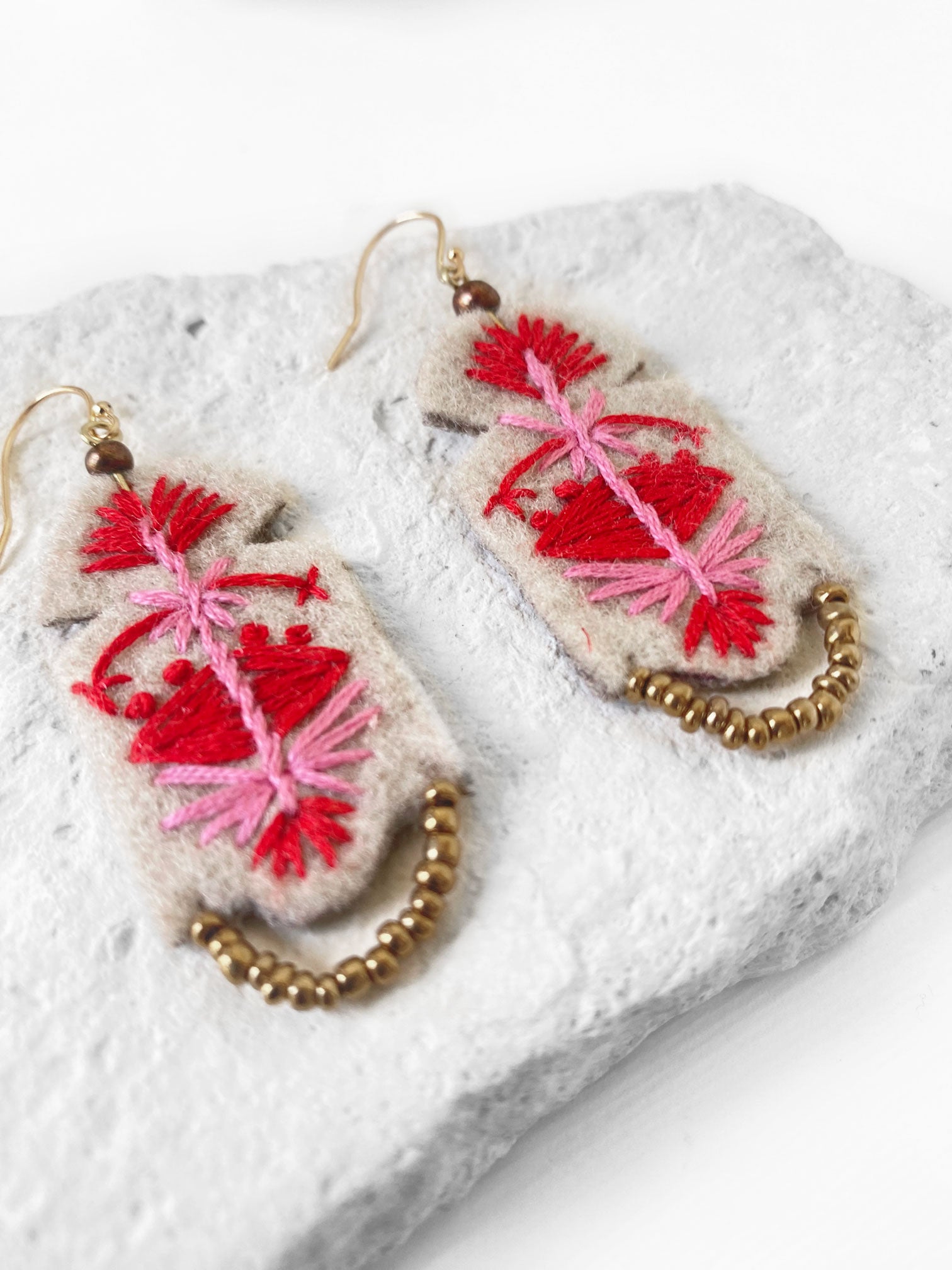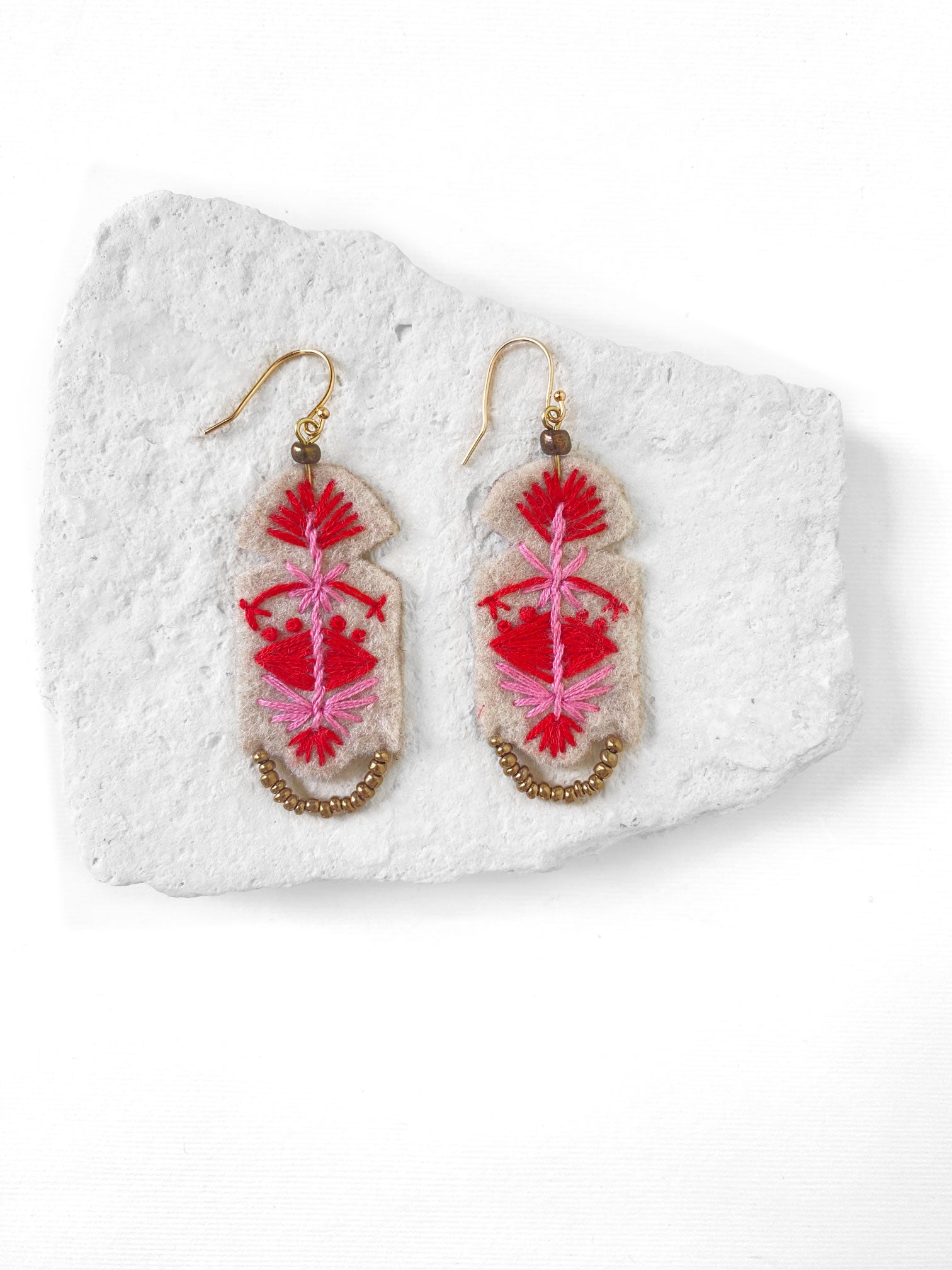 Aretes bordados a mano con hilo de algodón color rosa y rojo, sobre fieltro color crema con cuentas de vidrio color oro viejo. El nombre de Alina significa atractiva y graciosa. Hace referencia a estos aretes que tienen mucho detalle, simetría balanceada y un toque de magia.
