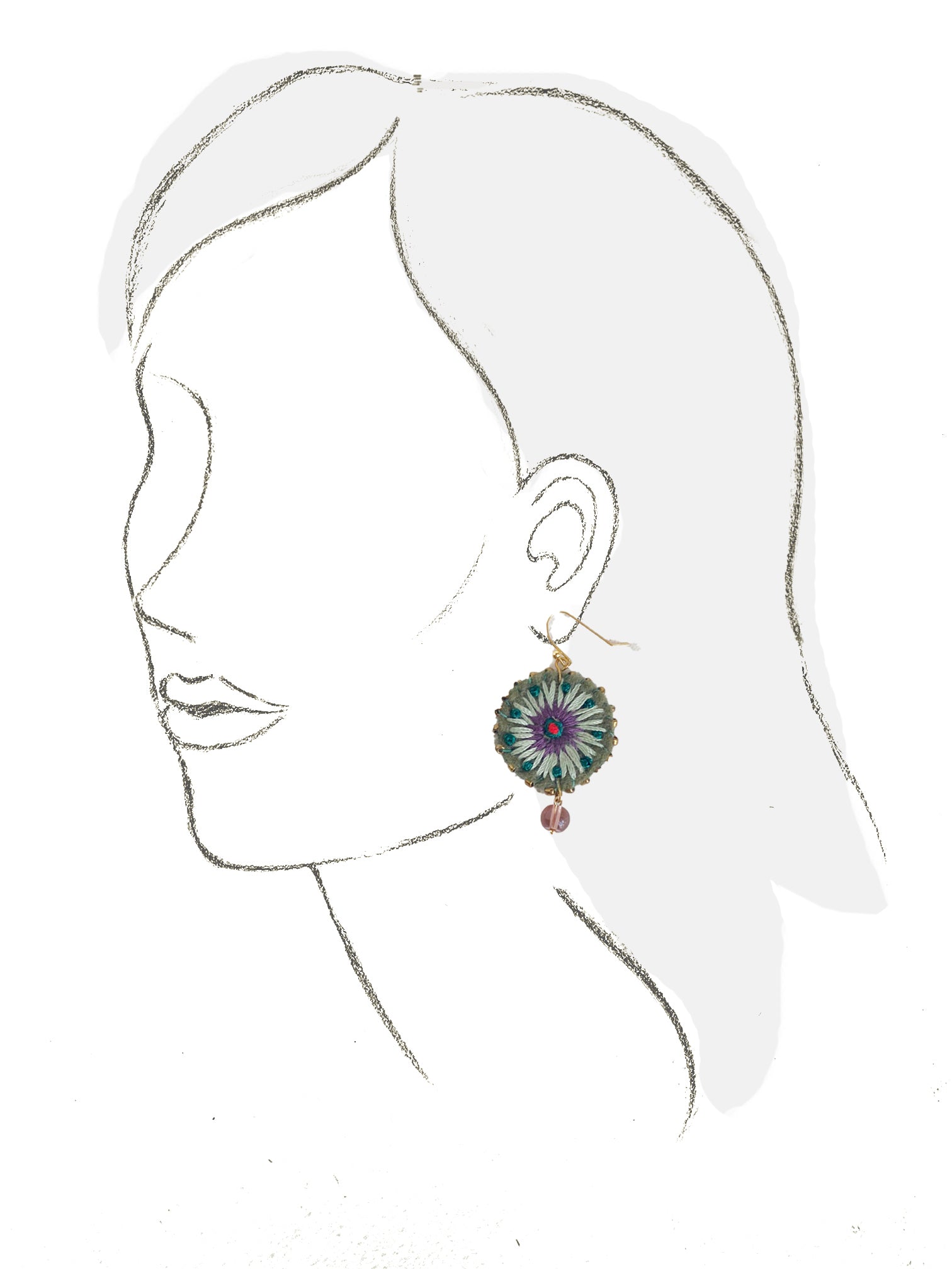 Aretes redondos, bordados a mano con hilo de algodón color verde claro, lila y rojo con cuentas de vidrio color oro viejo sobre fieltro color verde y gancho chapa de oro. Los colores y las texturas de esta pieza están inspirados en el misticismo mágico de los dragones.