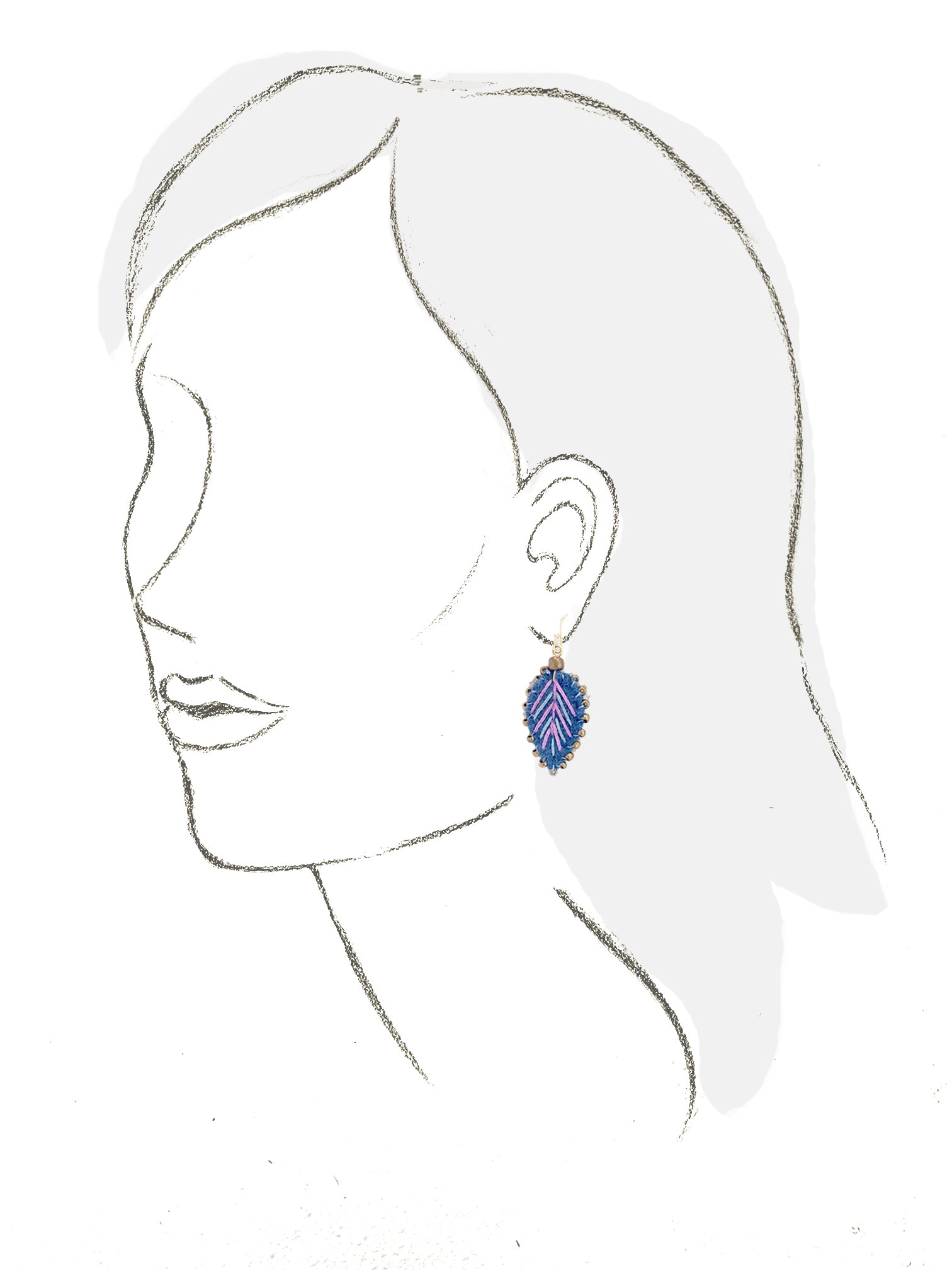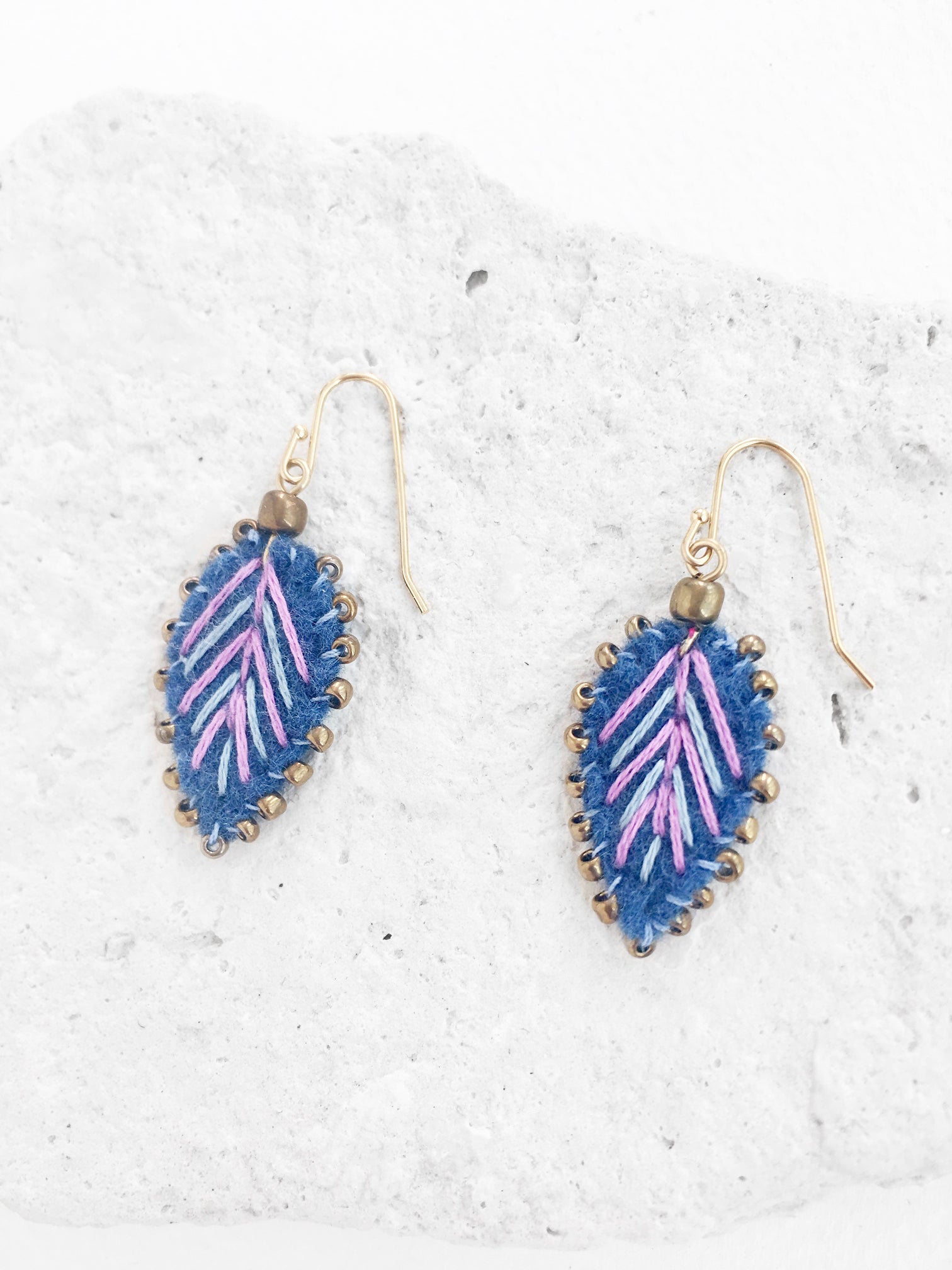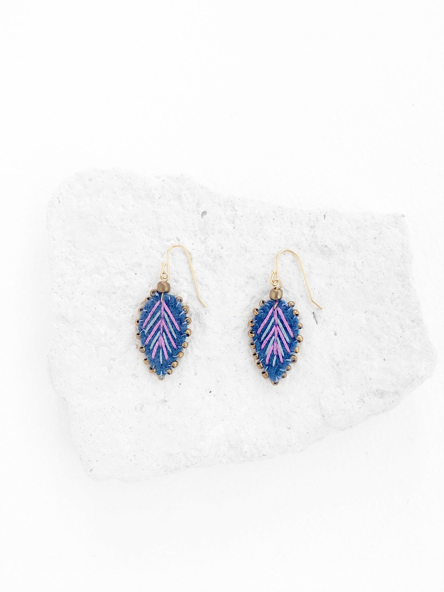 Aretes en forma de hoja en tono azul índigo, bordados a mano con hilo de algodón color rosa y azul claro con cuentas de vidrio color oro viejo. Gancho chapa de oro.