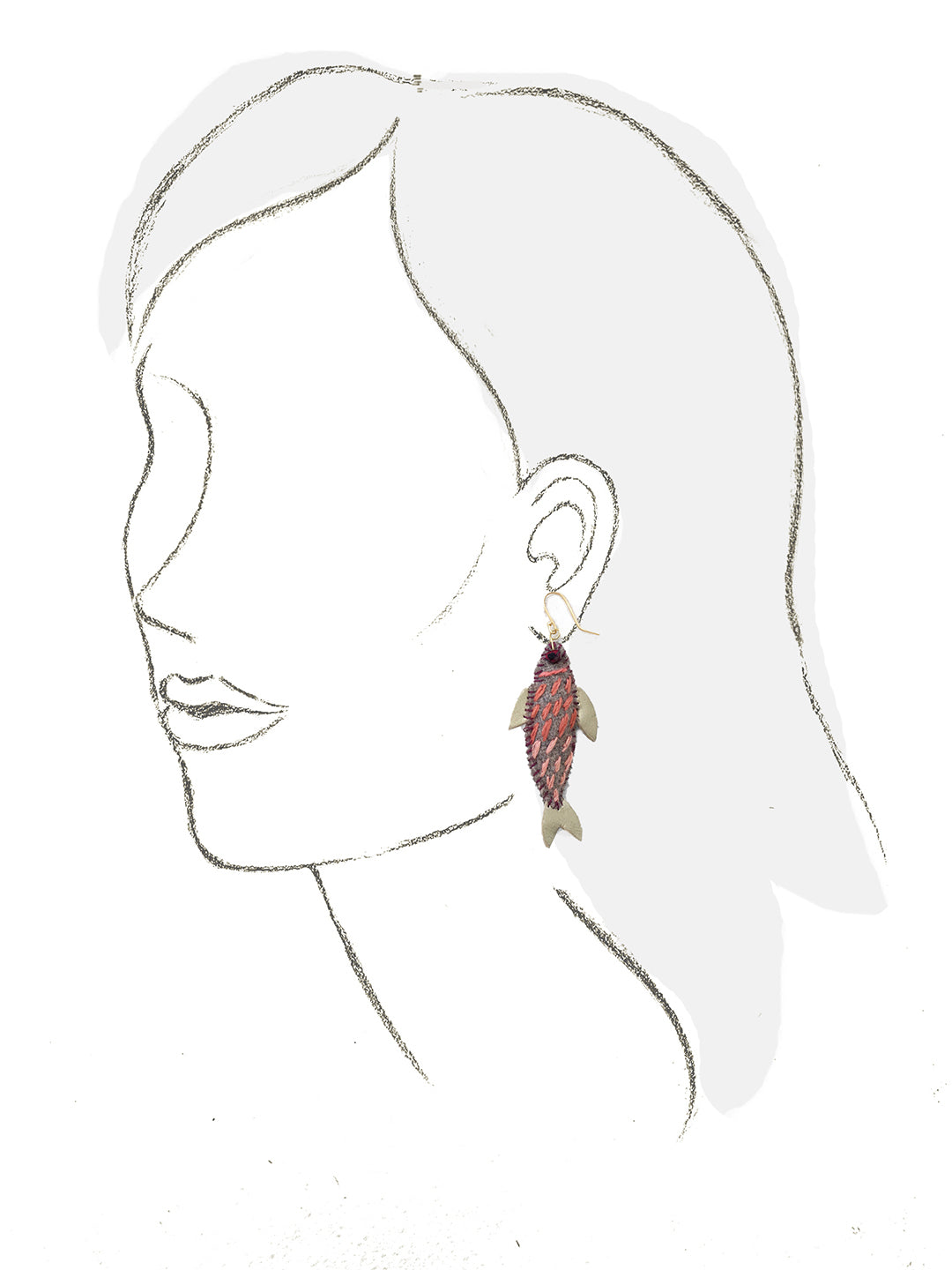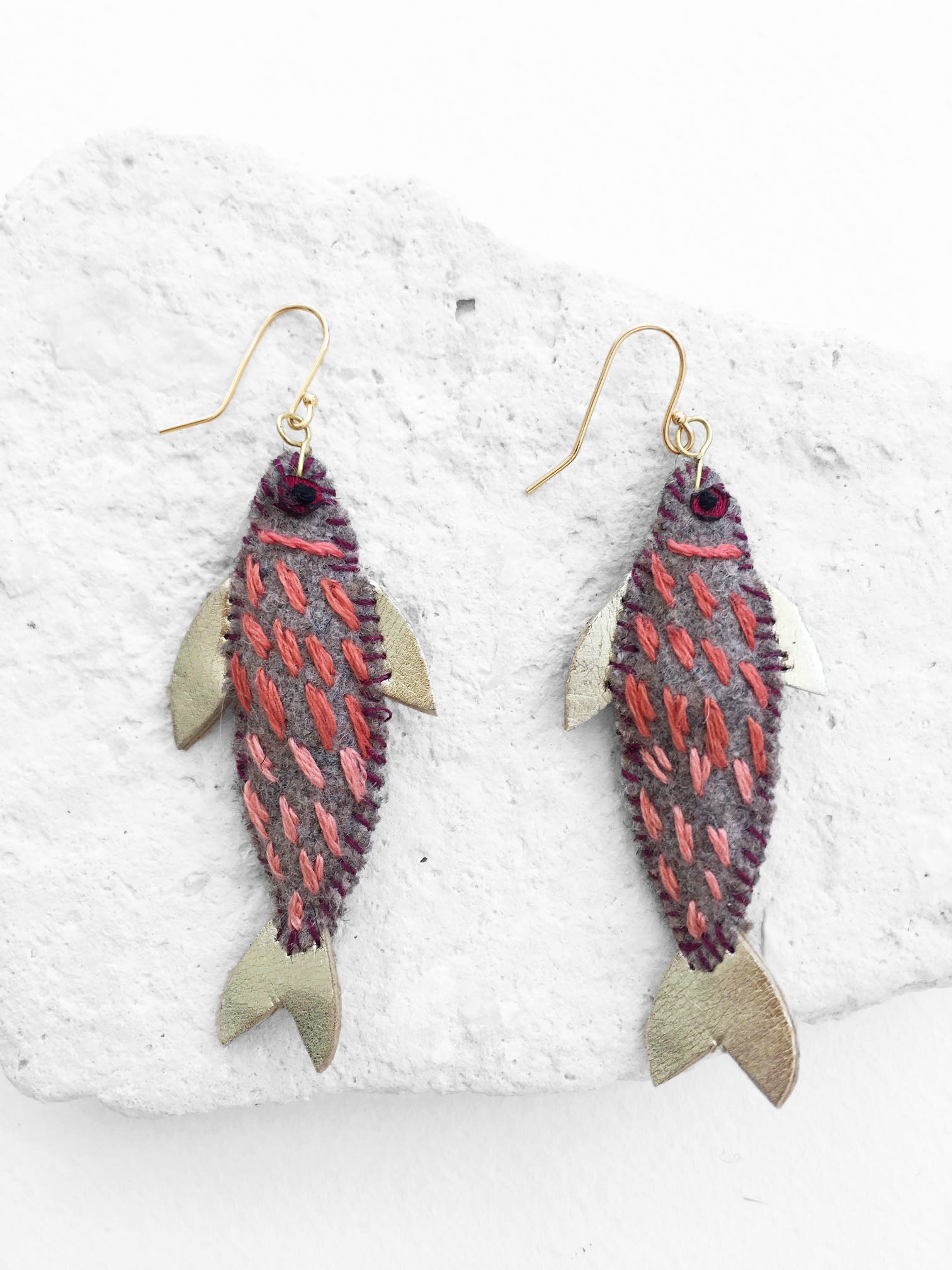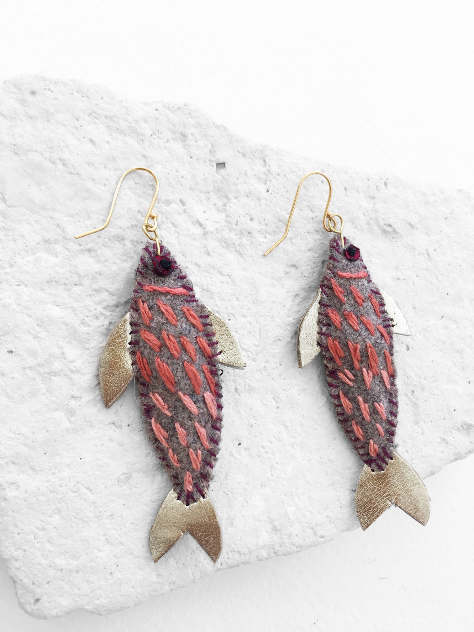 Aretes en forma de pez bordados a mano sobre tela color gris y vinipiel dorada con hilo de algodón color coral y guinda. Gancho de chapa de oro. Este diseño nos recuerda el cuidado que debemos tener de los océanos y ríos de nuestro planeta.
