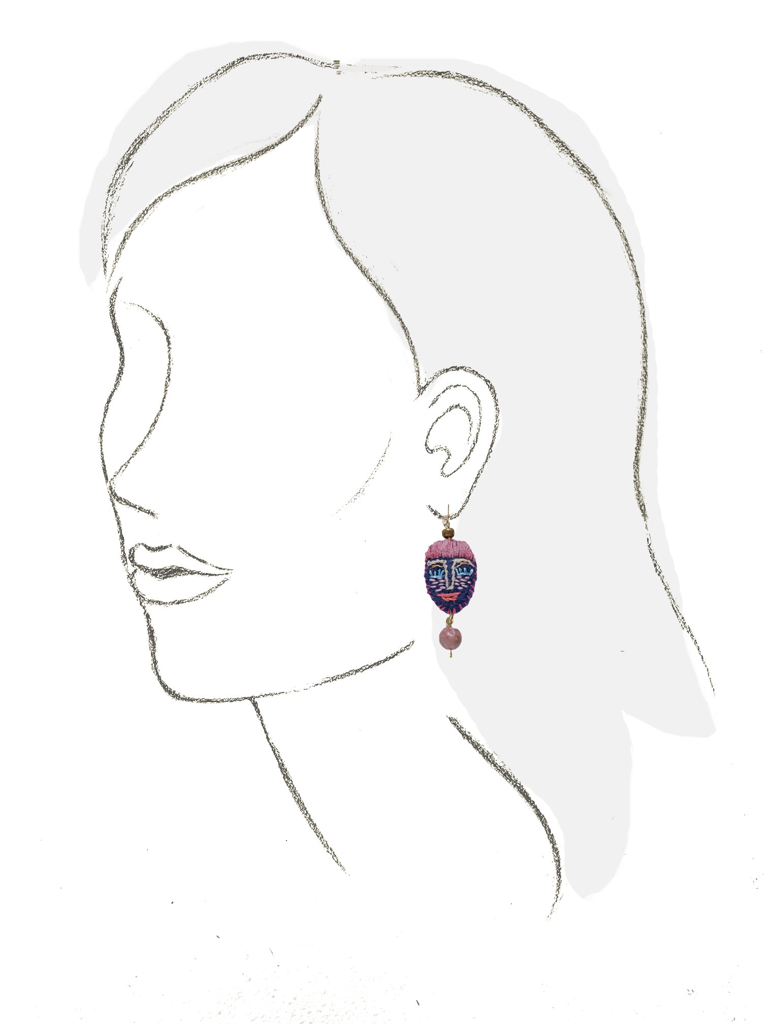 Aretes en forma de cara ovalada, bordados a mano con hilo de algodón color rosa, beige e hilo metálico cobre y azul sobre fieltro azul obscuro. Con cuenta rosa colgante. Gancho de chapa de oro. Inspirados en la resiliencia de las mujeres Ghanesas.