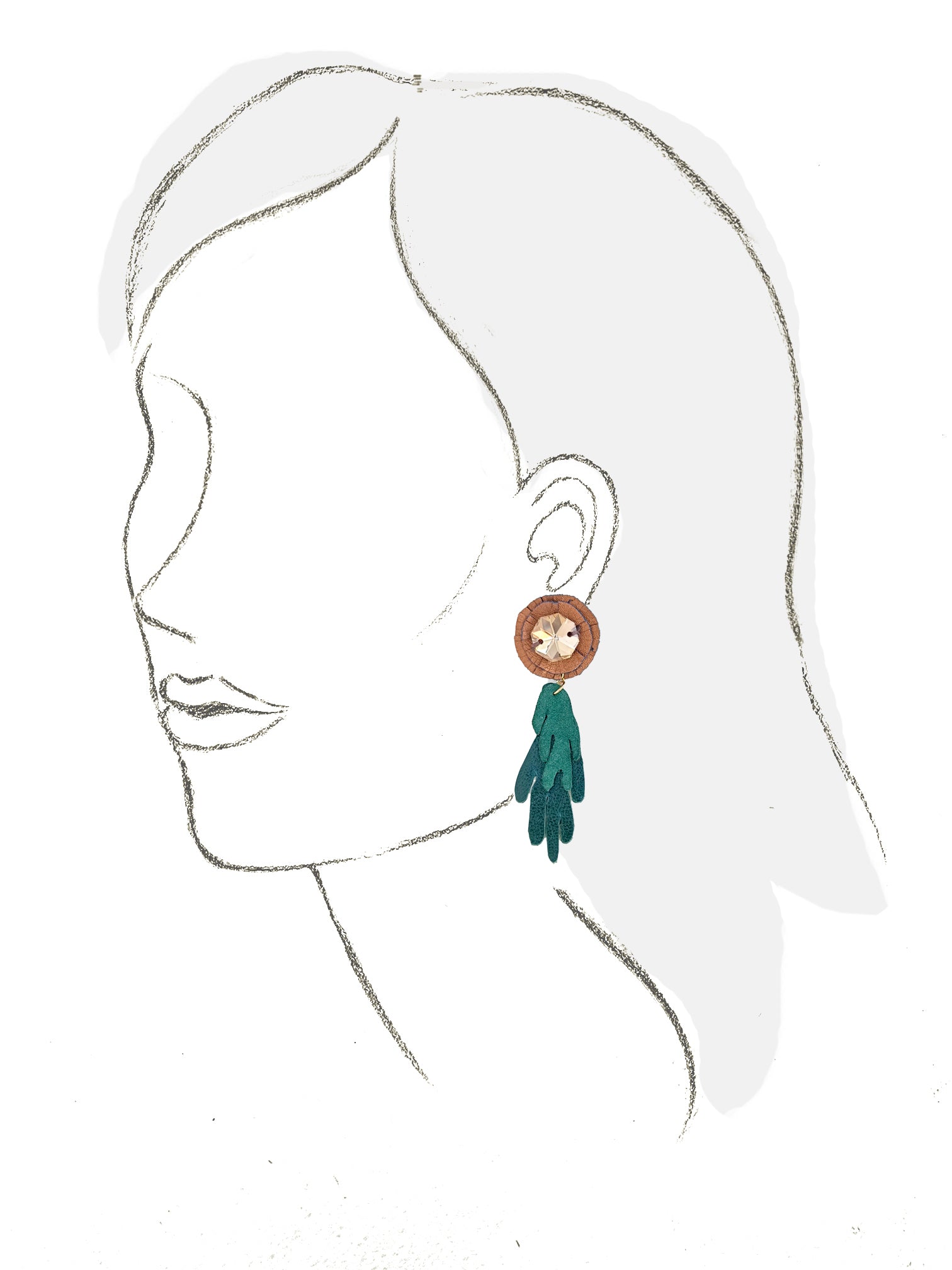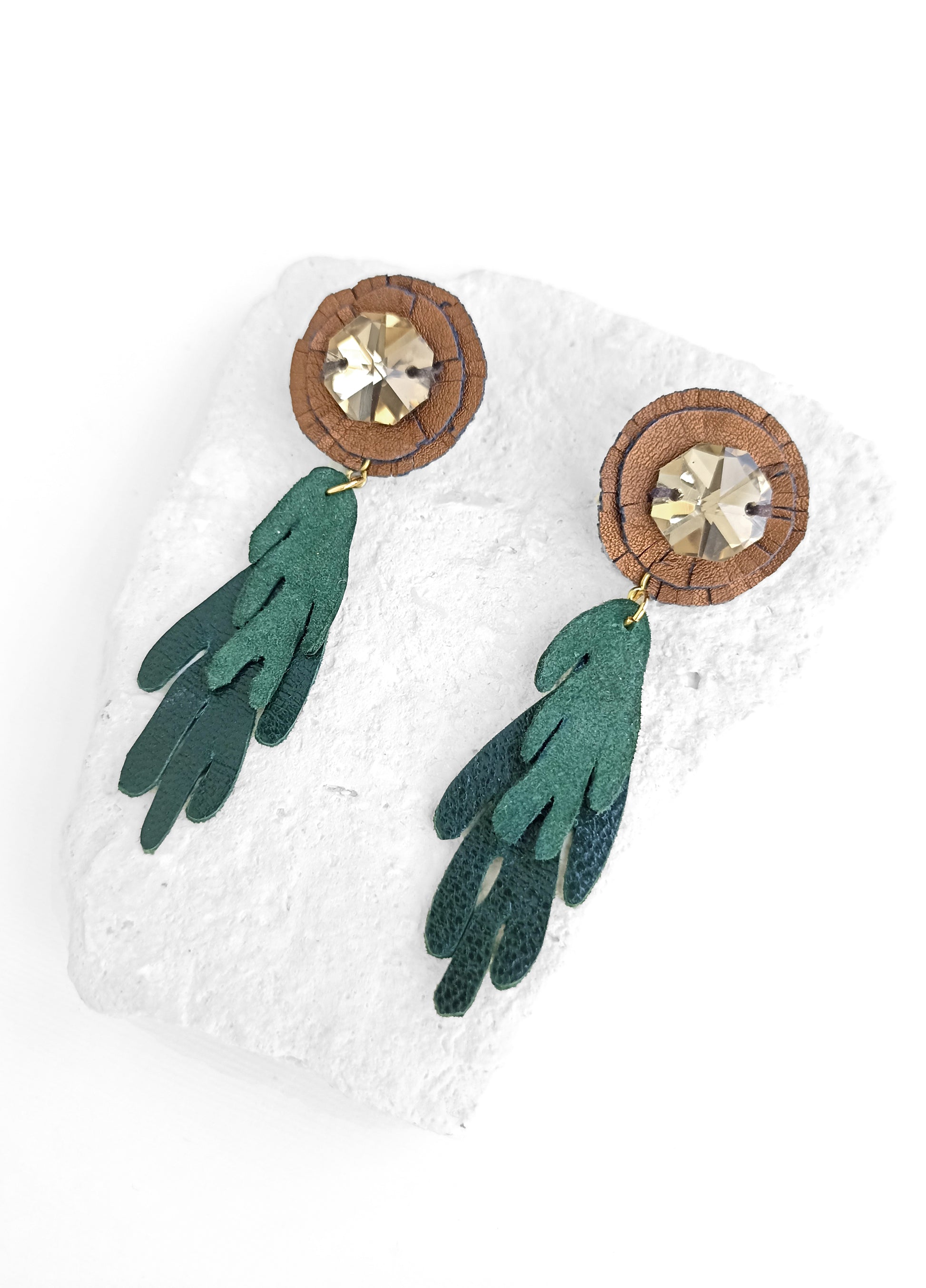 Aretes de piel natural color verde y vinipiel color cobre, con aplicación al centro y broquel de chapa de oro. Diseño inspirado en la fluidez de las algas del mar, las cuales se mueven al ritmo del agua.