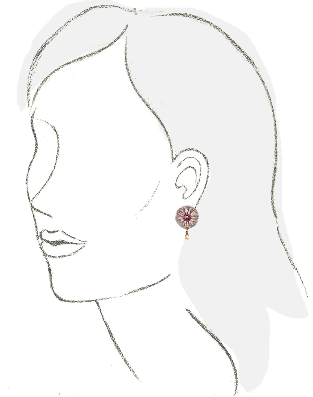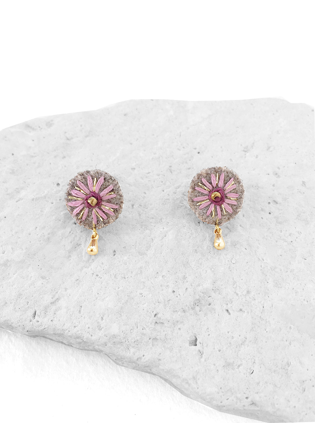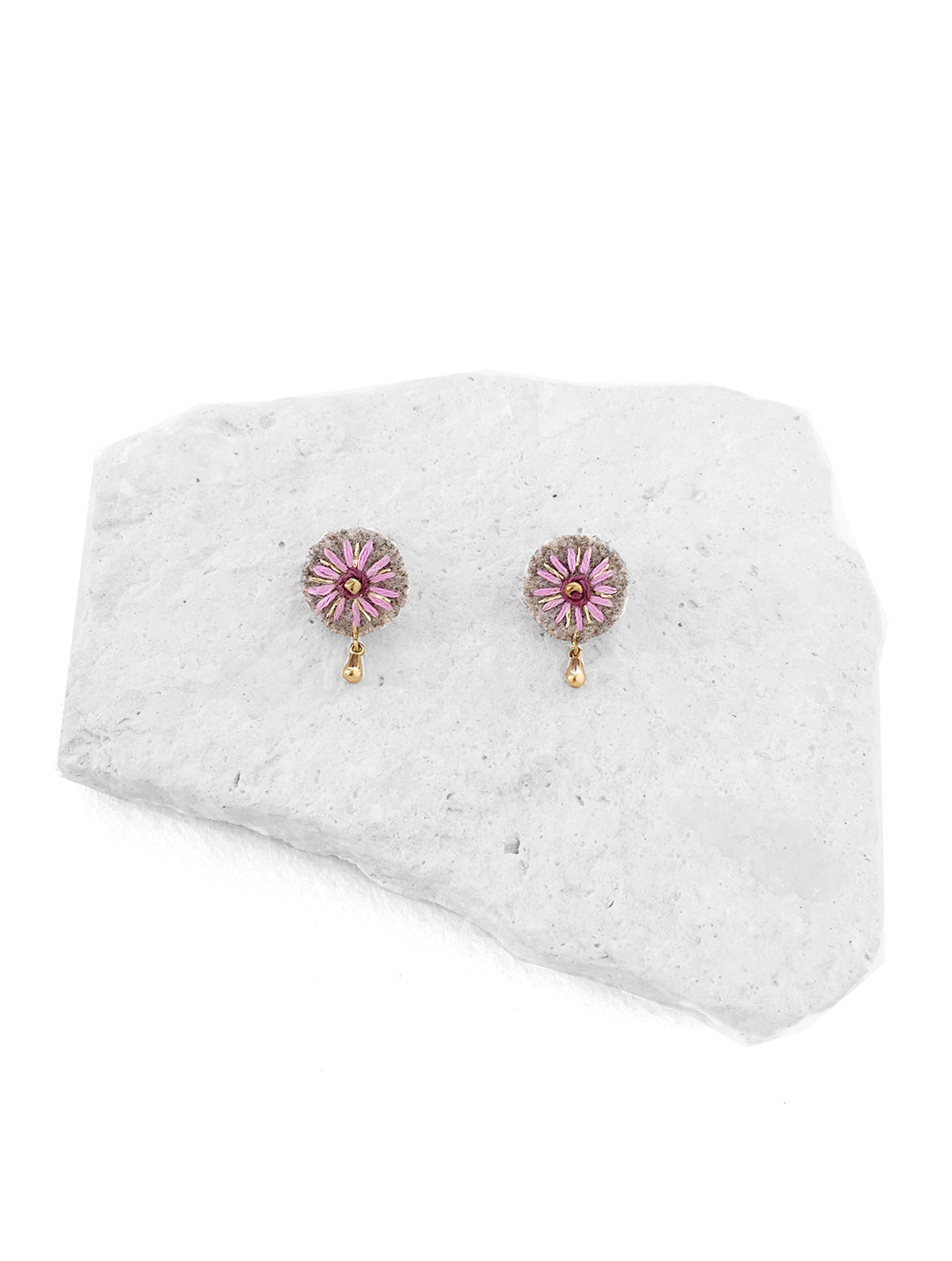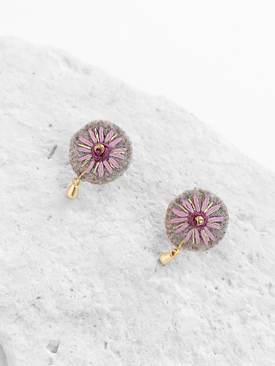 Aretes redondos, bordados a mano con hilo de algodón color lila e hilo metálico dorado sobre tela de lana color gris. Poste y gota de chapa de oro. Este diseño nos recuerda la suavidad y el efecto relajante de las flores.