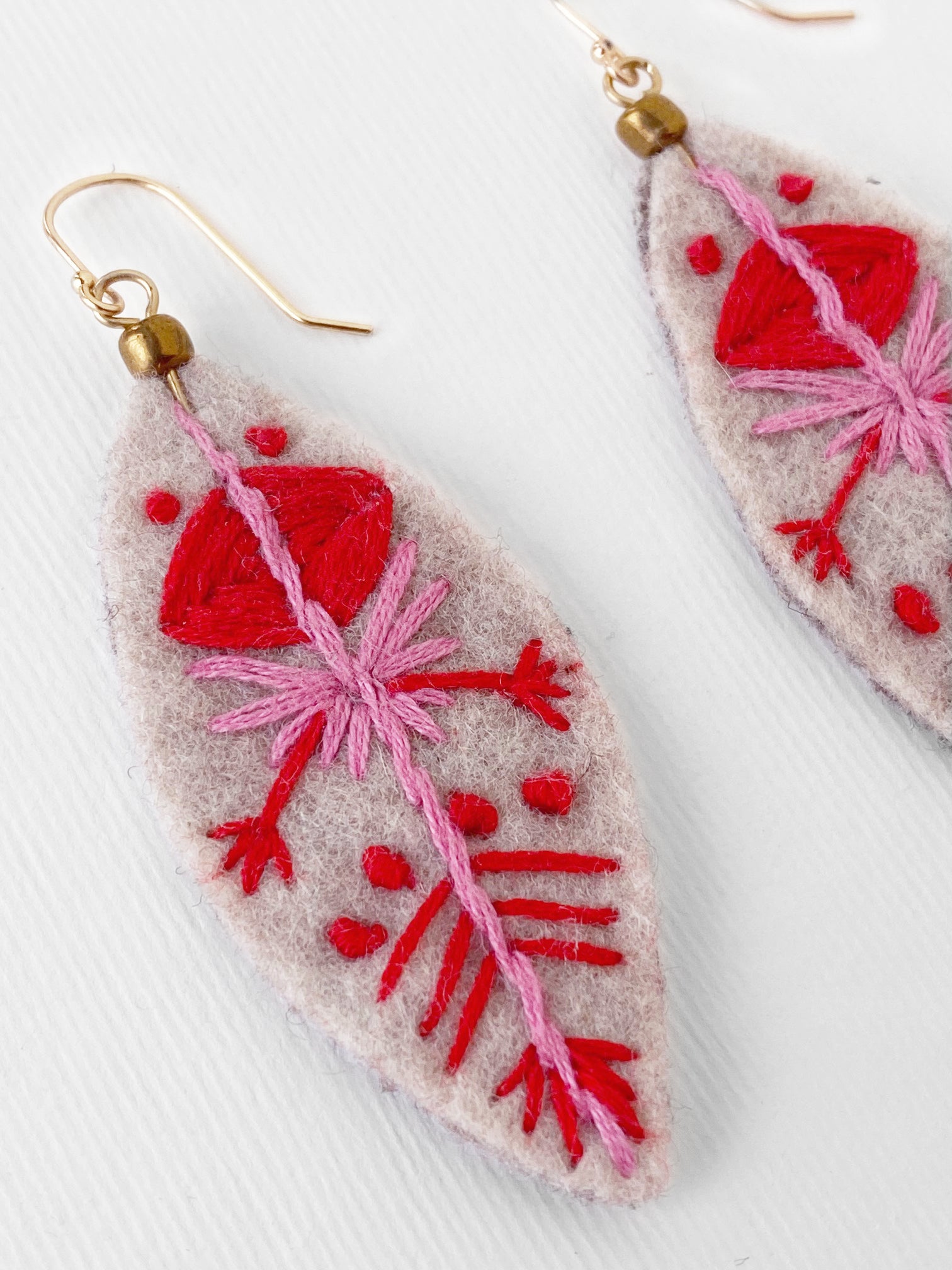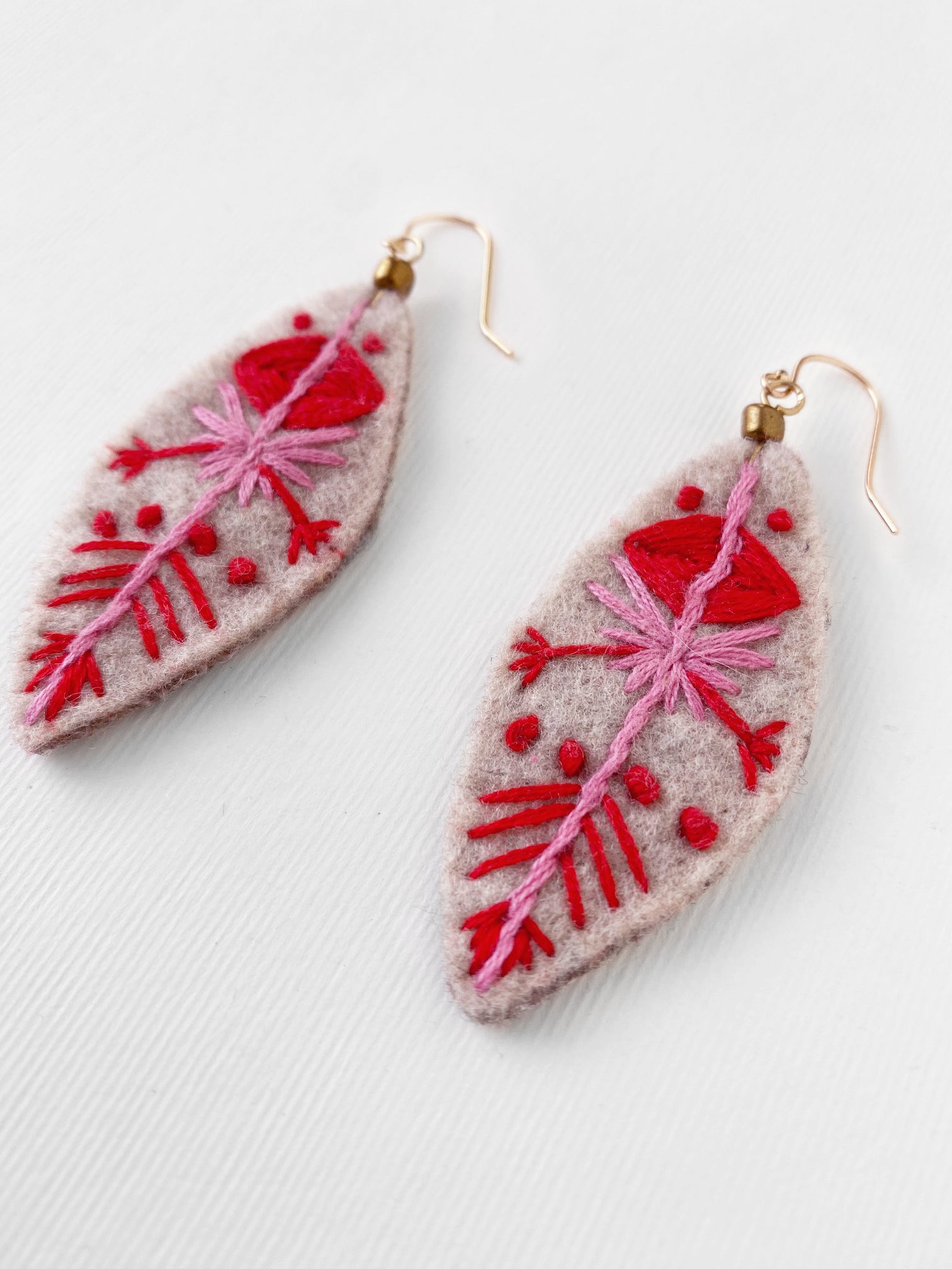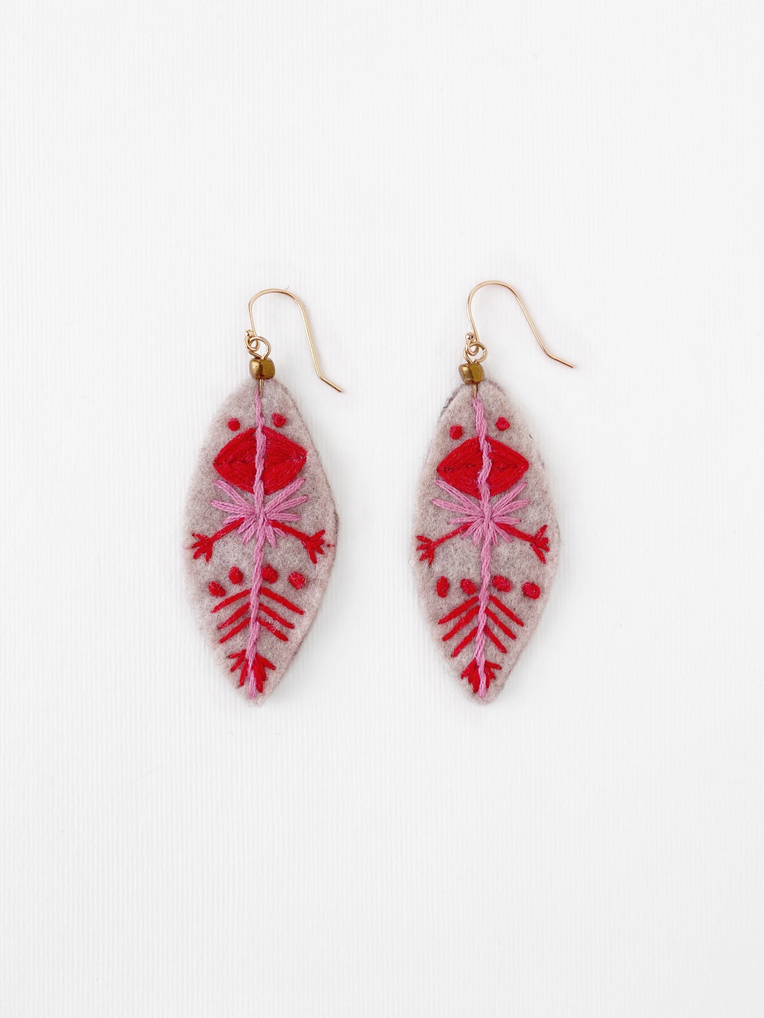 Aretes ovalados, bordados a mano con hilo de algodón color rosa y rojo, sobre fieltro color crema. Gancho de chapa de oro.