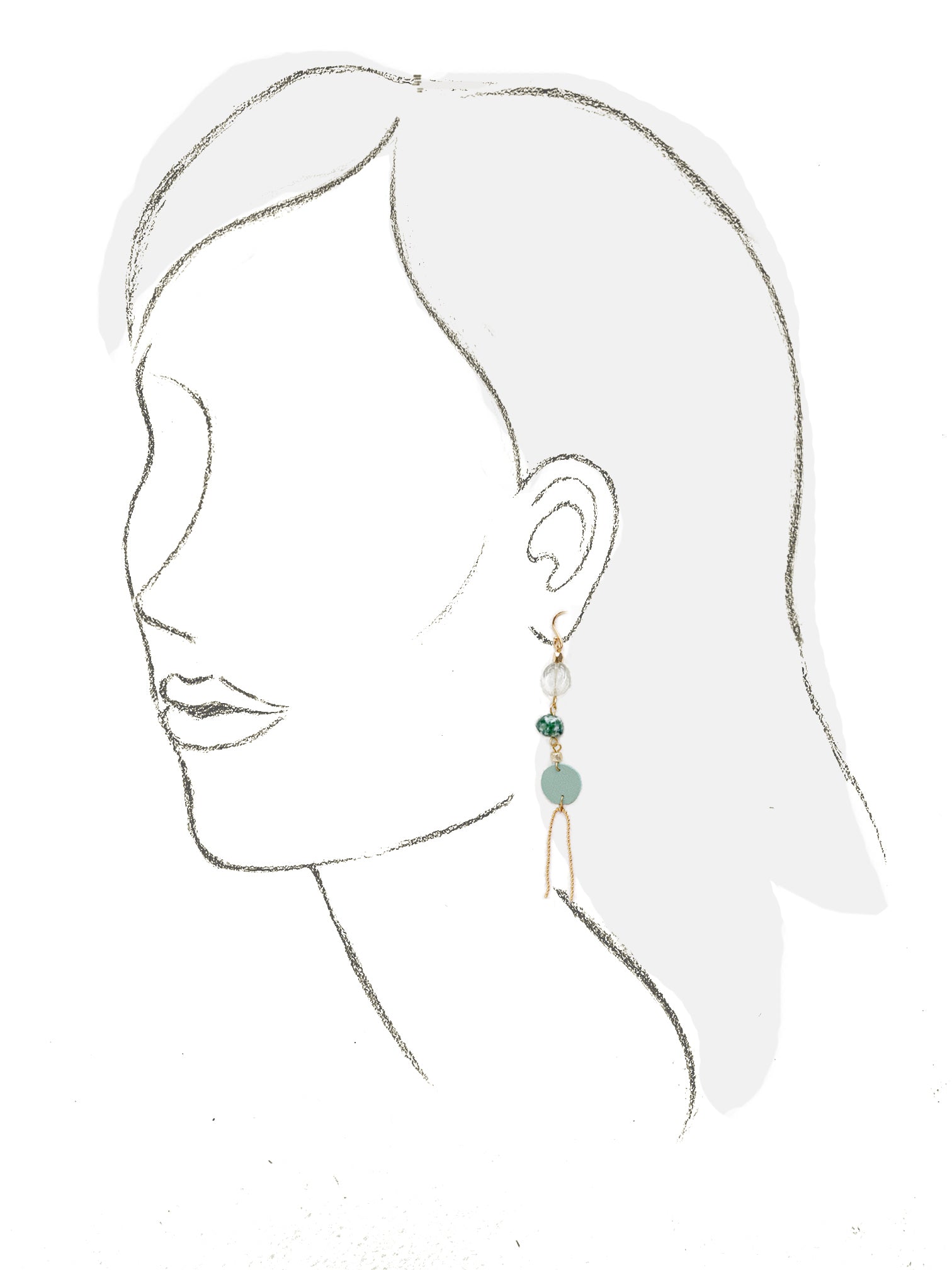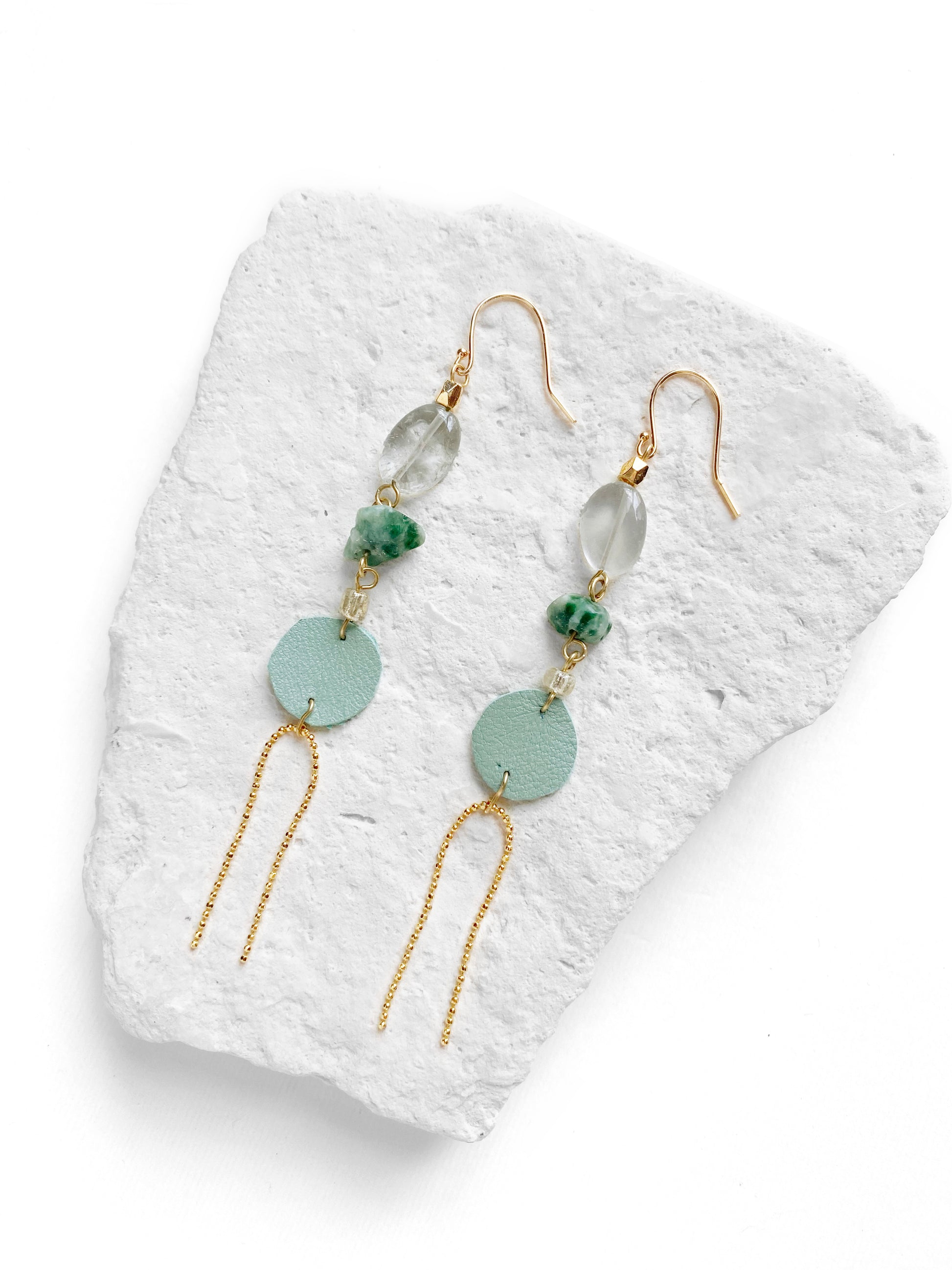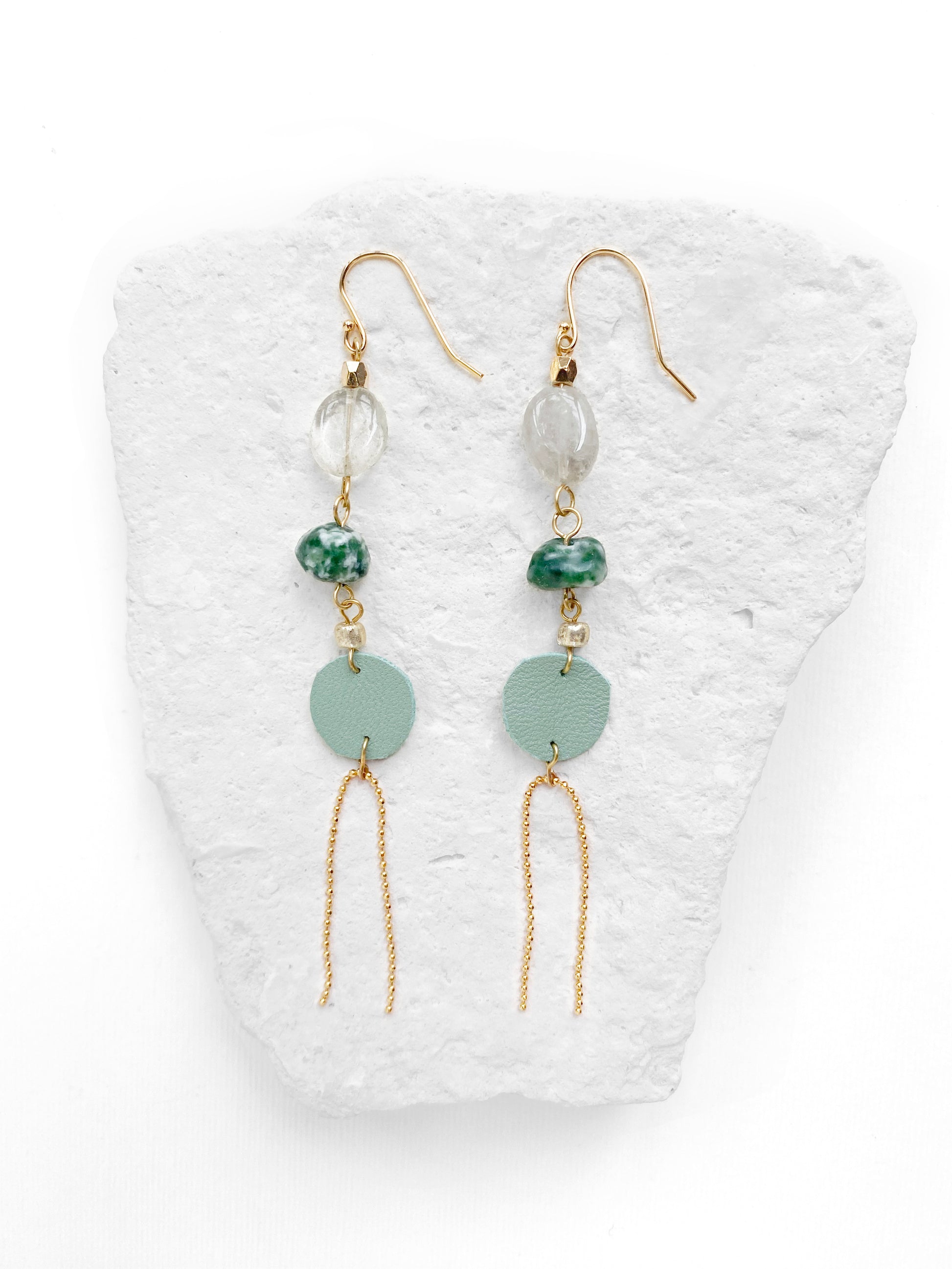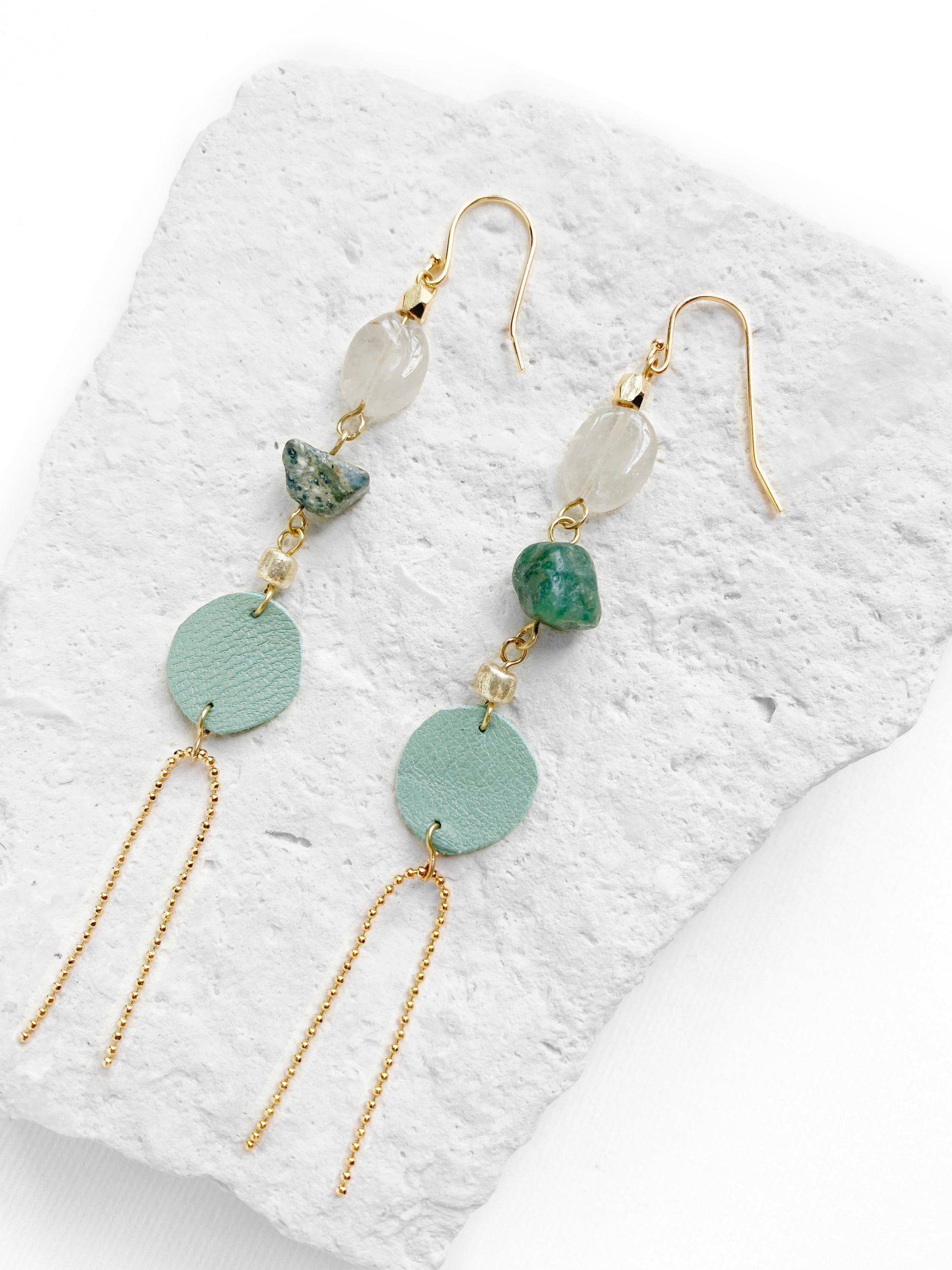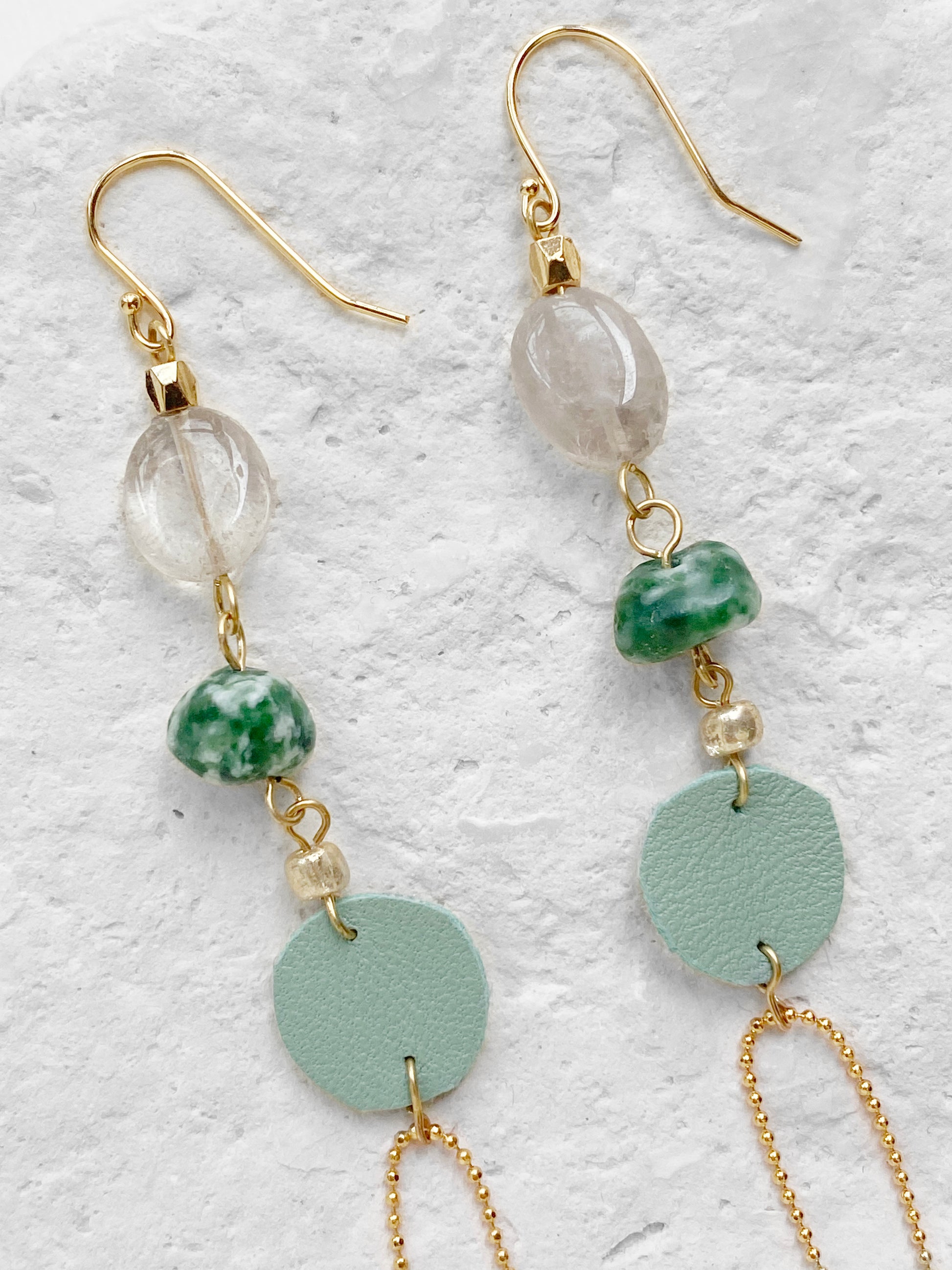 Aretes largos de chapa de oro con piedra natural transparente y piedra irregular color verde, con círculo de piel natural color crema de pistache.