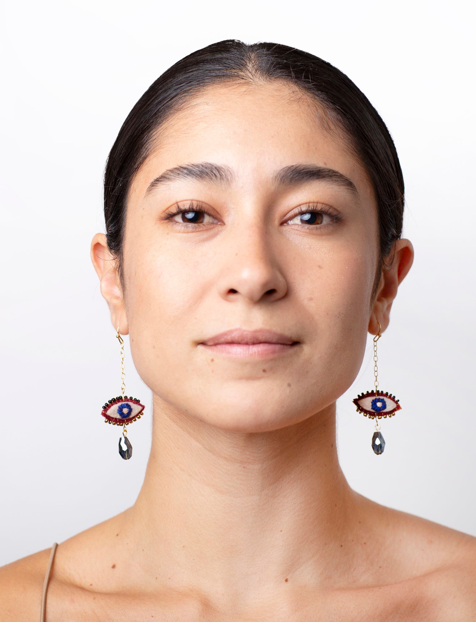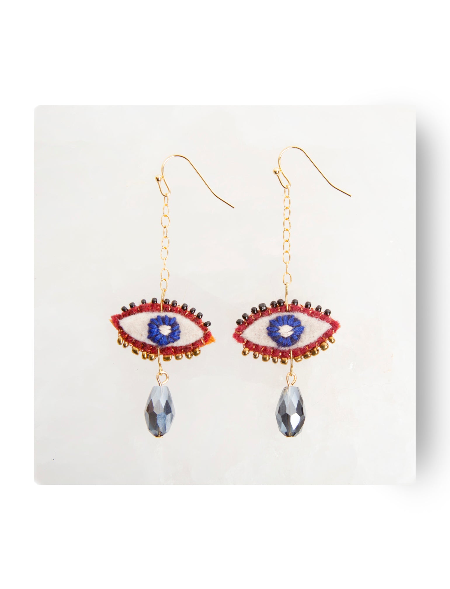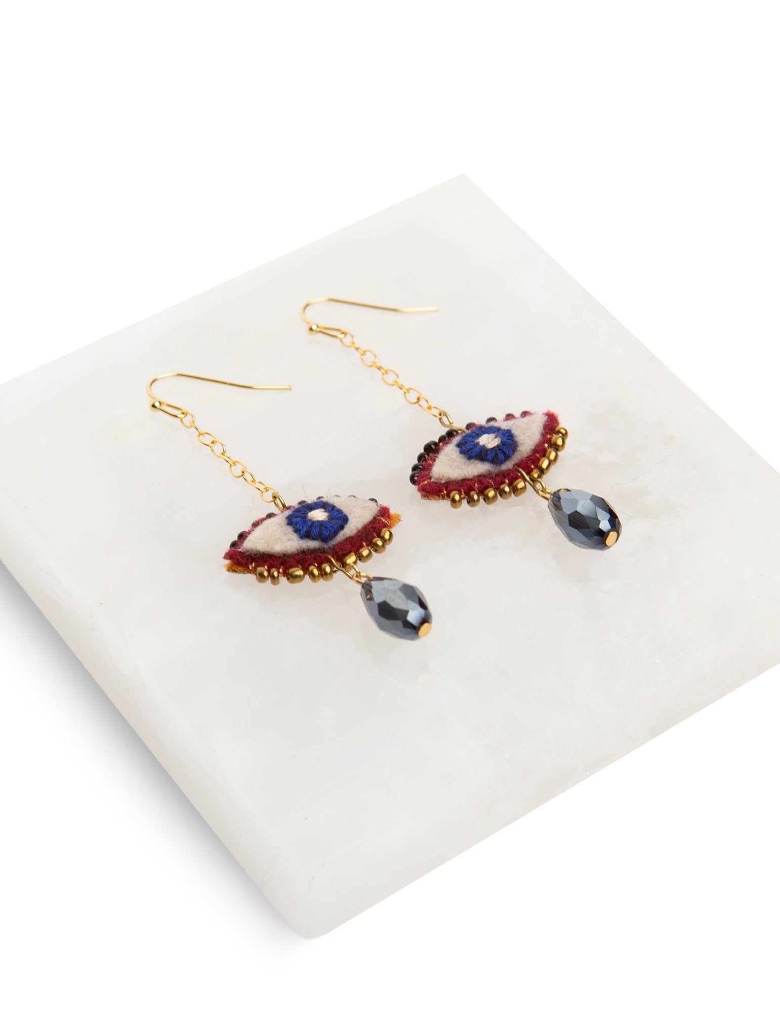 Aretes que representan la capacidad de ver y vivir con apertura de conciencia. Un recordatorio para reinventarnos y cuestionarnos lo que ya damos por hecho. Fabricados con tela de fieltro y bordados a mano con hilo de algodón.