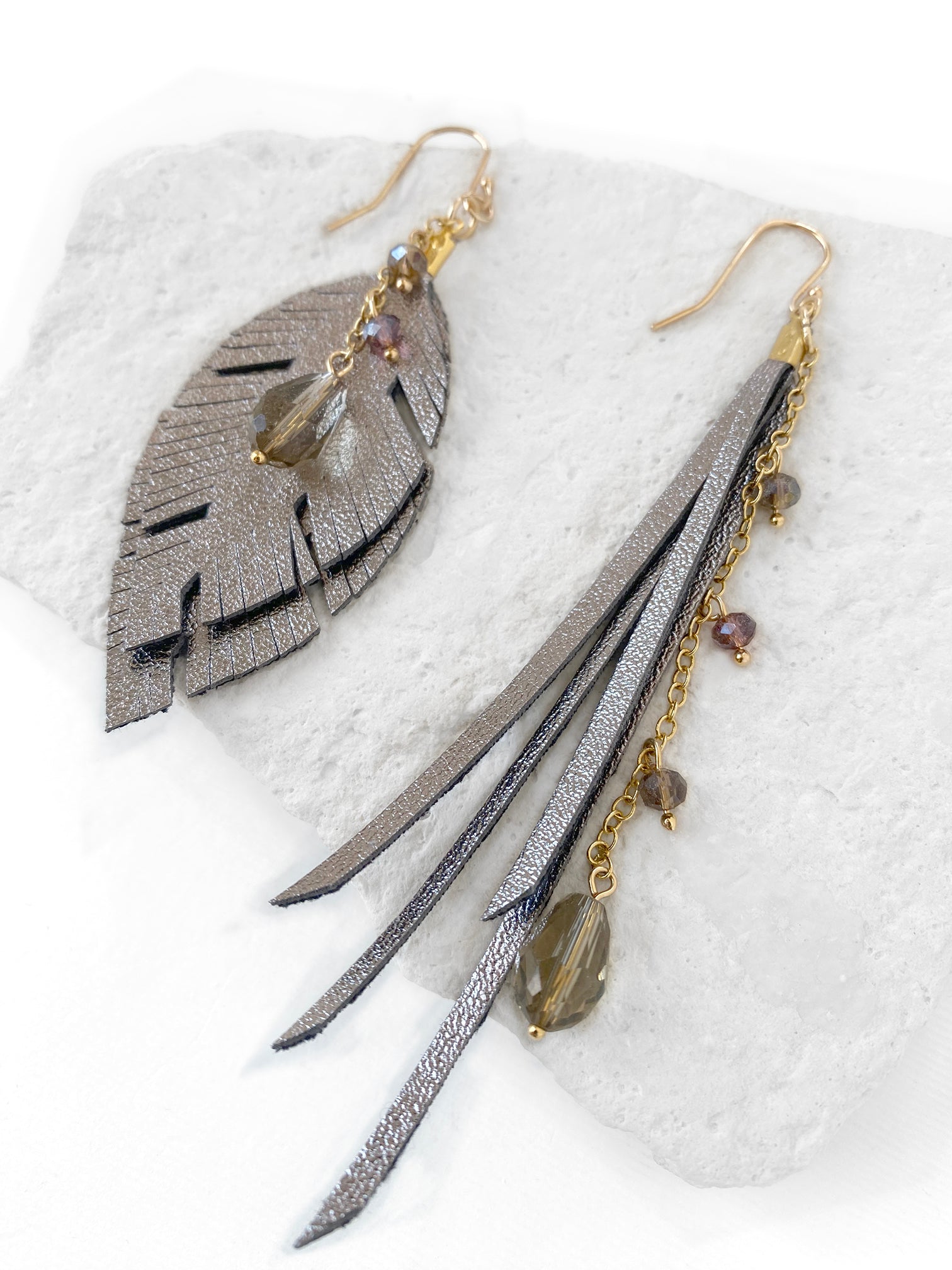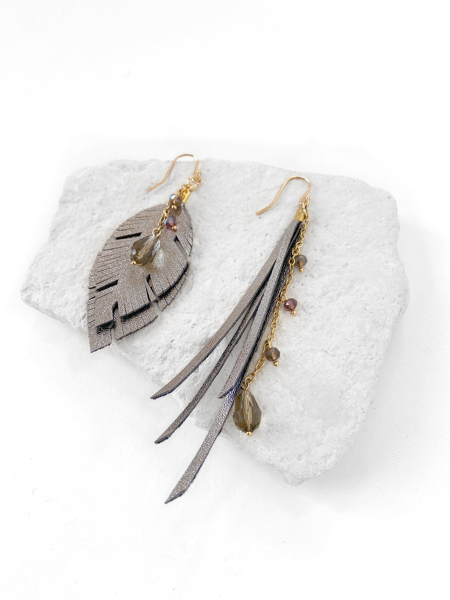 Aretes desiguales: Uno en forma de hoja y el otro de tiras de vinipiel gris con cristales colgantes. Gancho y componentes de chapa de oro.