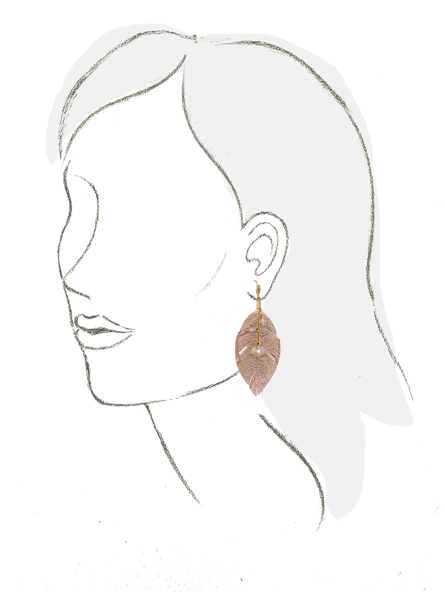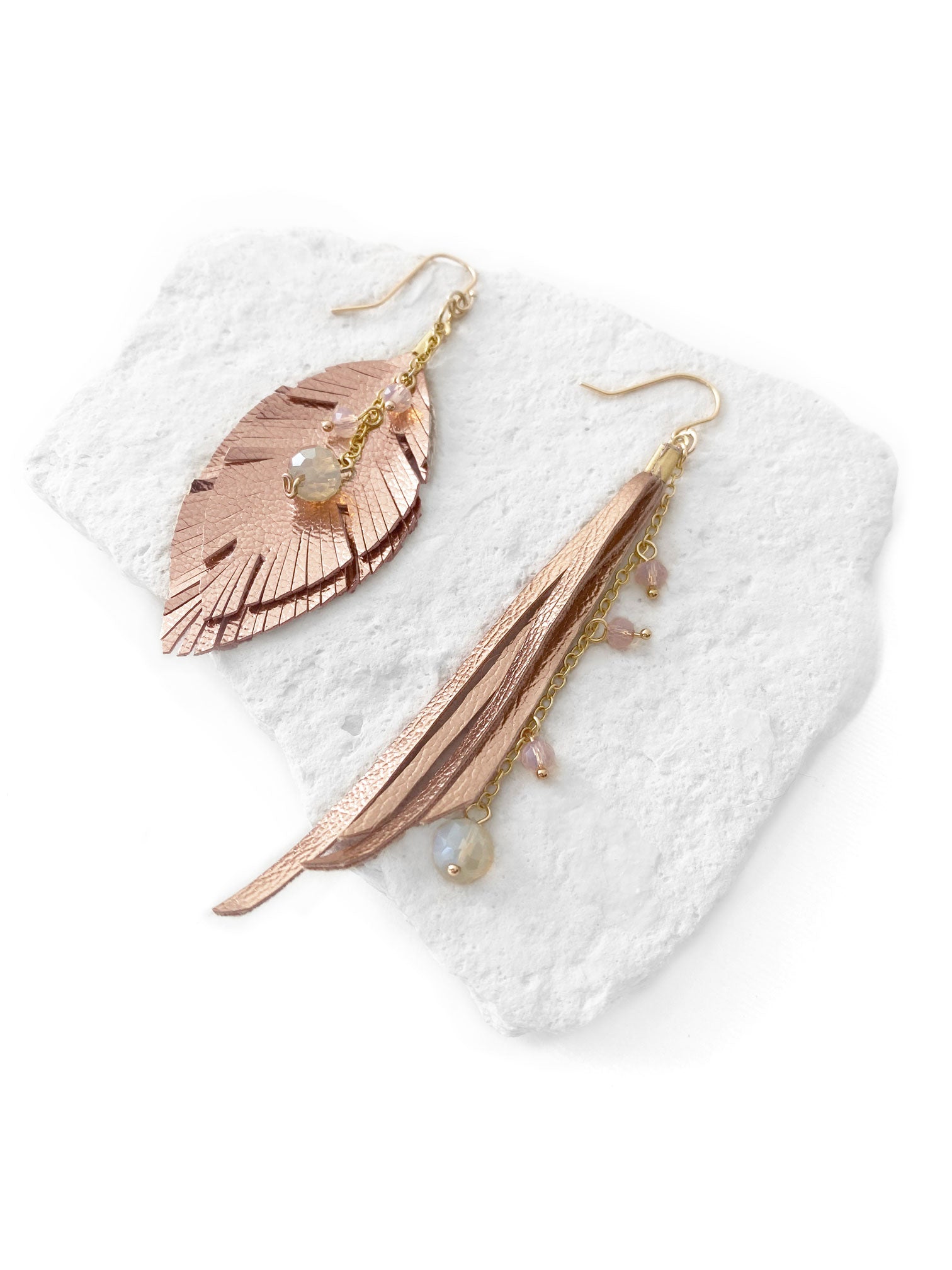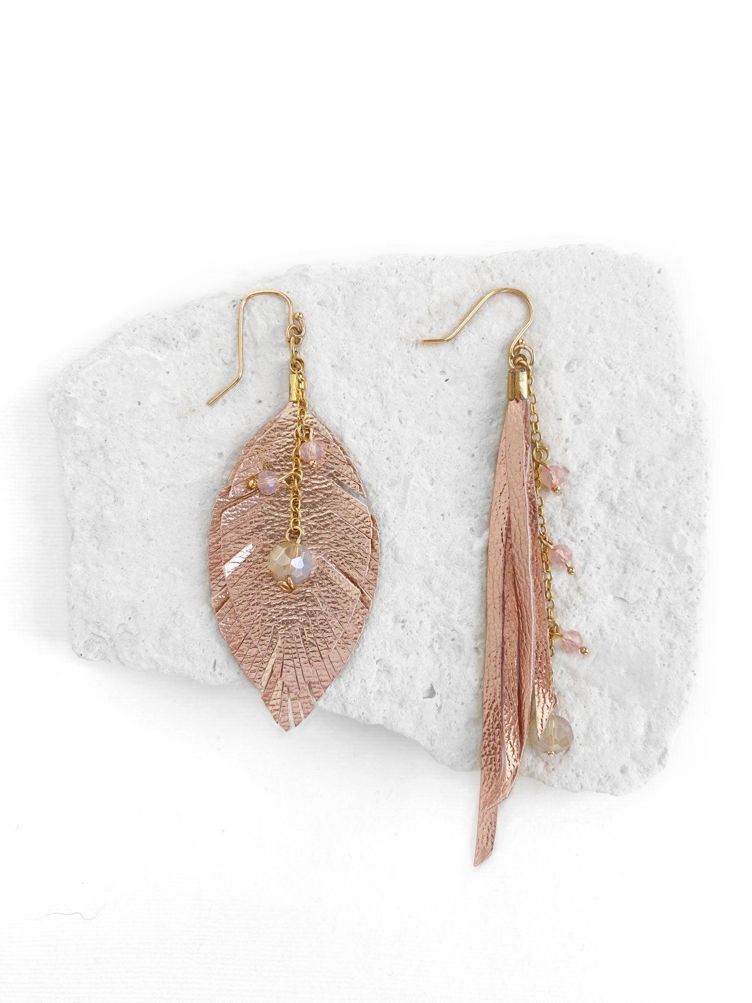 Aretes desiguales: Uno en forma de hoja y el otro de tiras de vinipiel rosa con cristales colgantes. Gancho y componentes de chapa de oro.