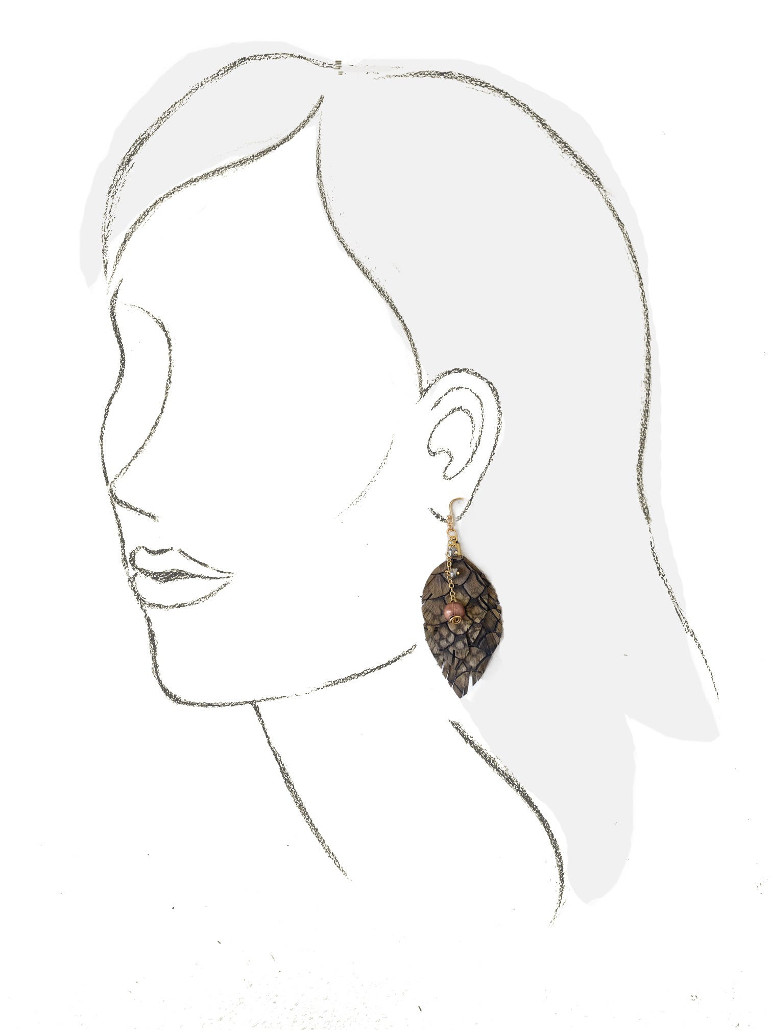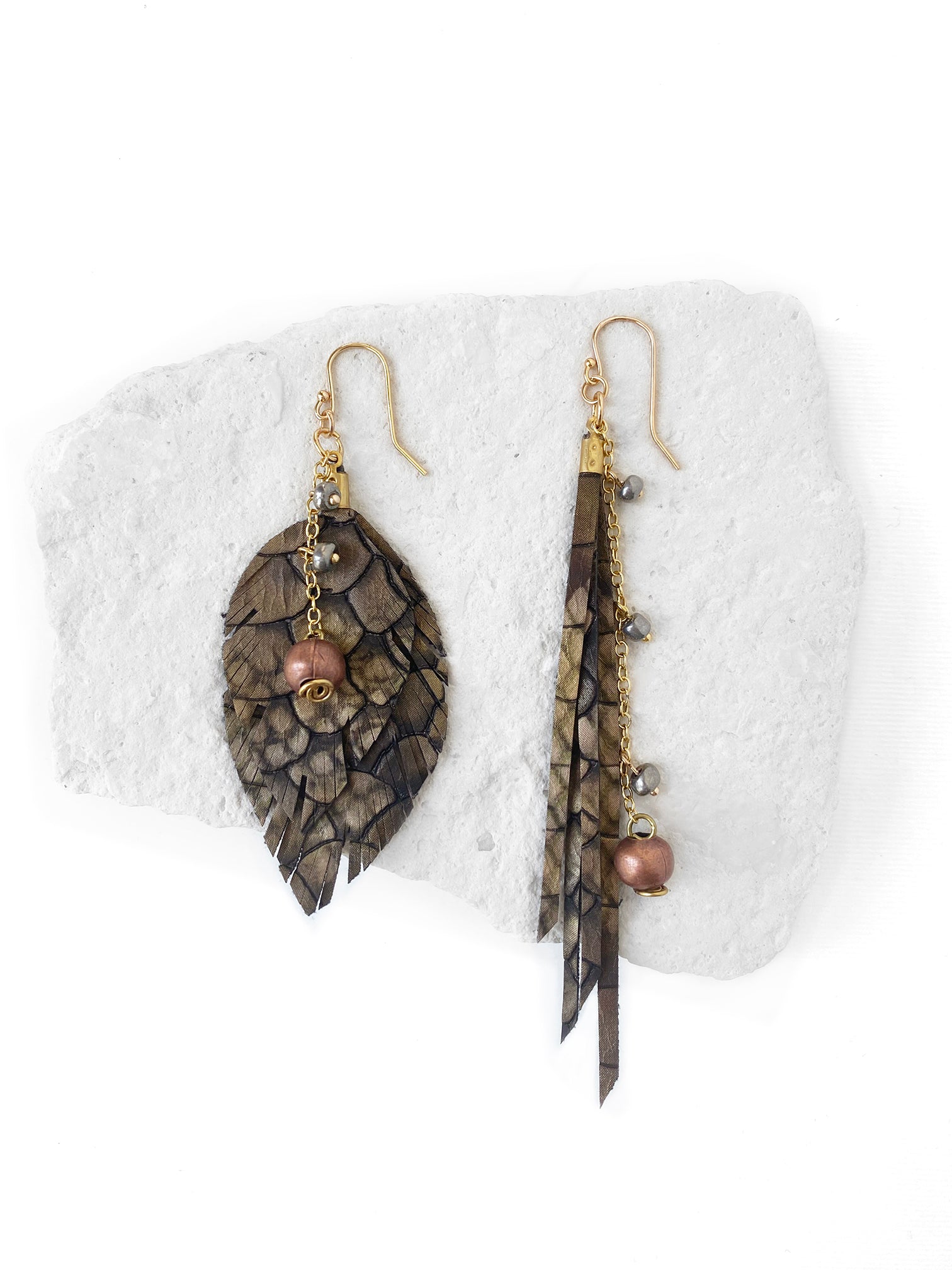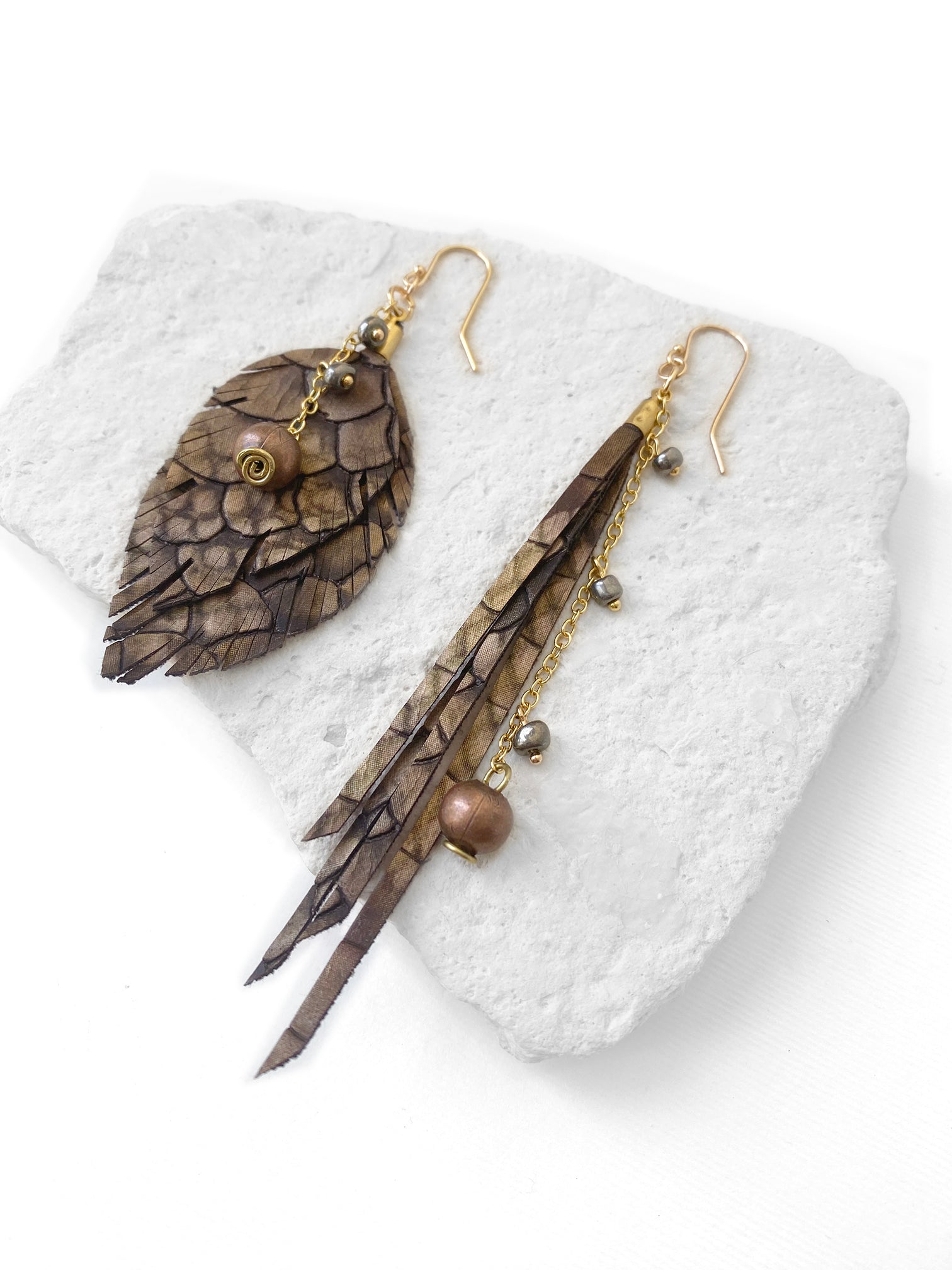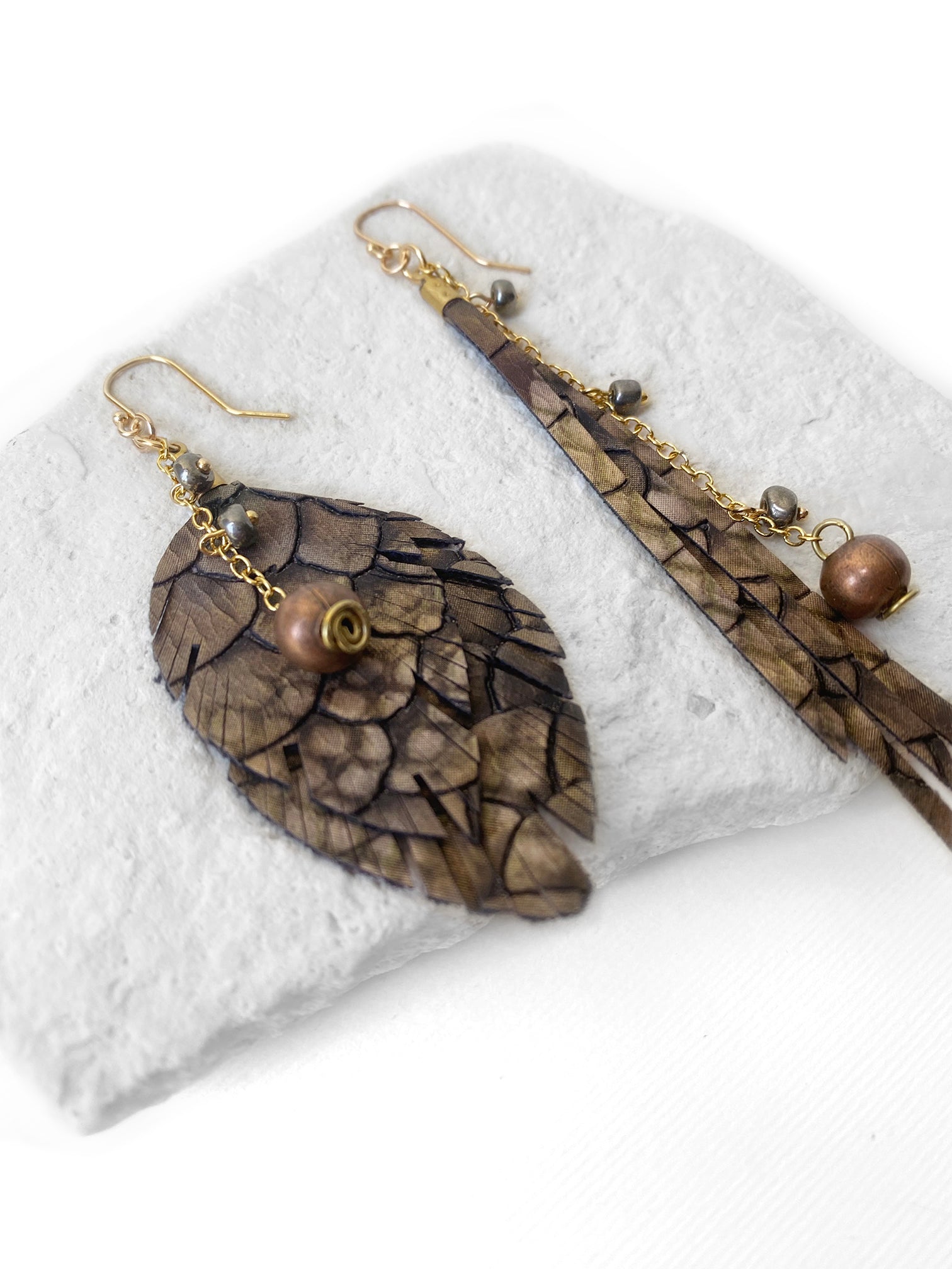 Aretes desiguales: Uno en forma de hoja y el otro de tiras de vinipiel en tonos cafés con cristales colgantes. Gancho y componentes de chapa de oro
