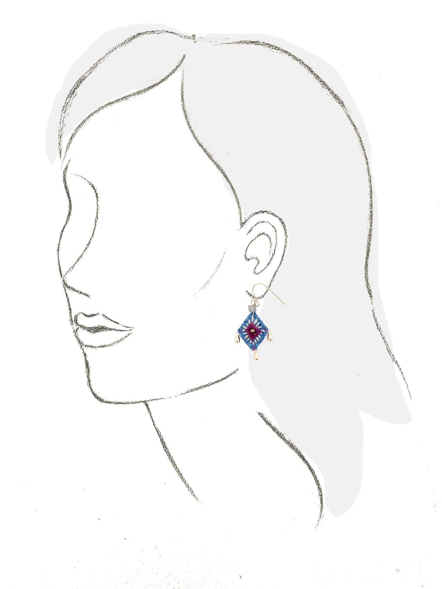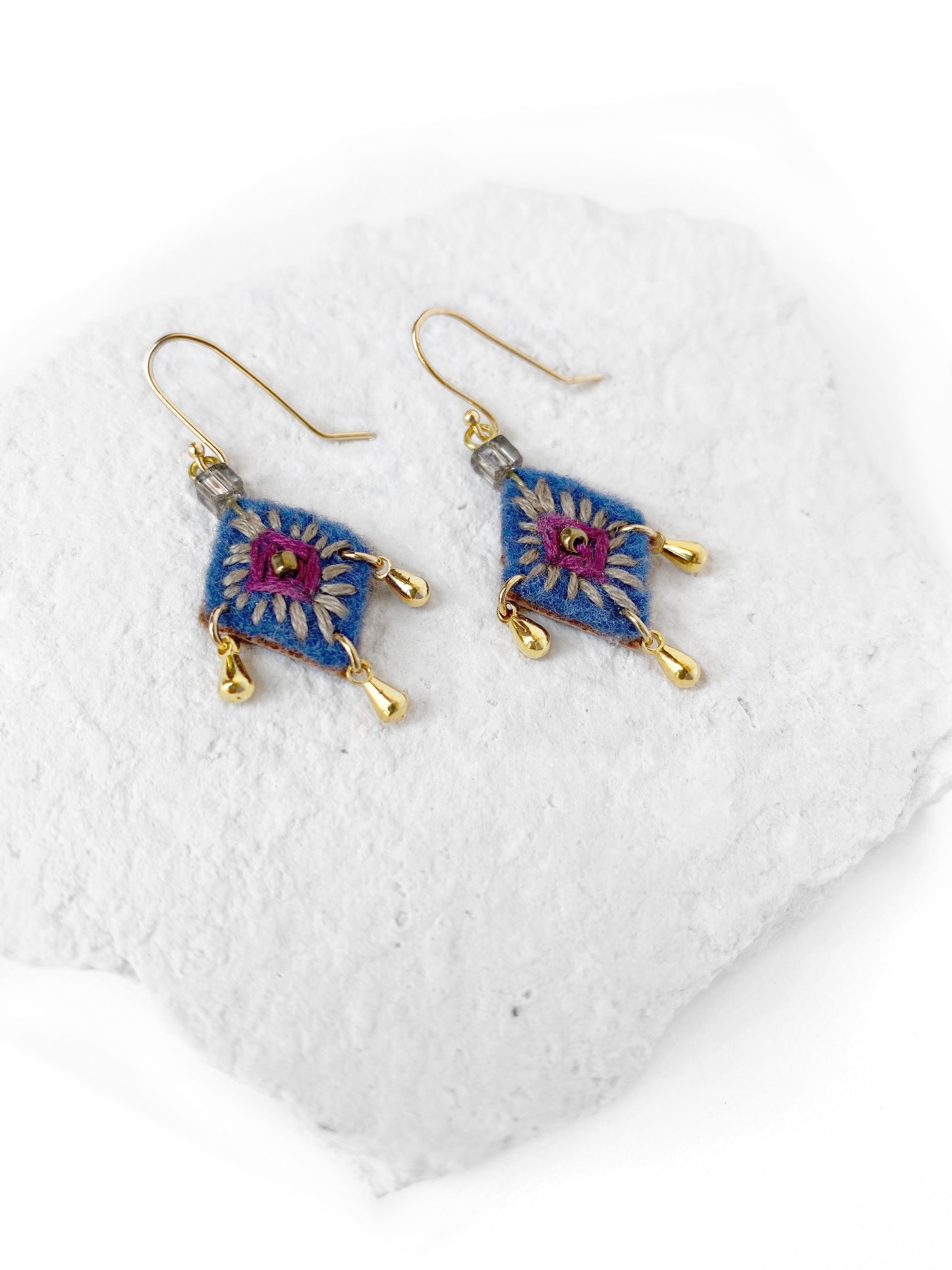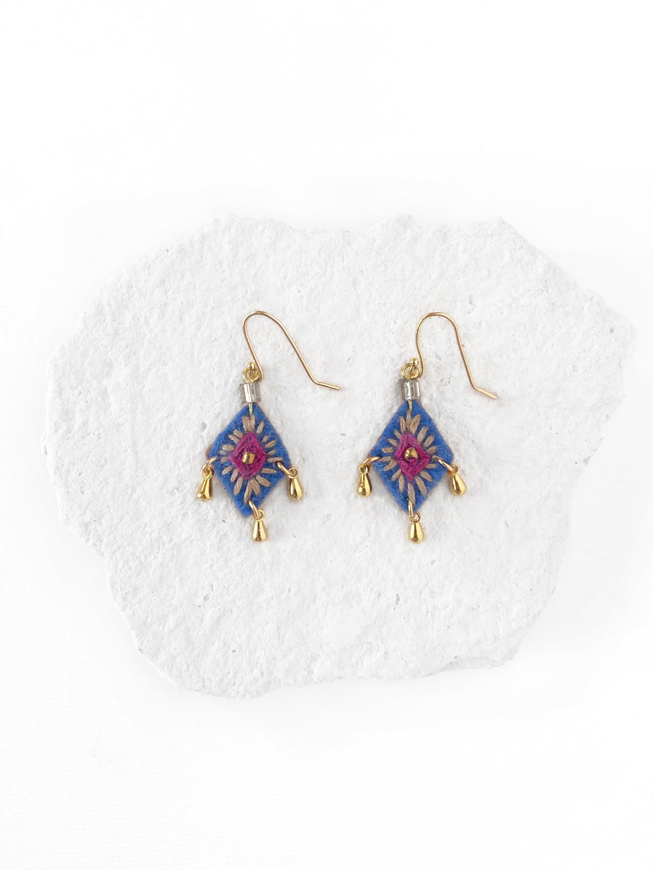 Aretes en forma de rombo, bordados a mano con hilo de algodón color guinda y beige sobre fieltro color azul con gancho y gotas de chapa de oro.