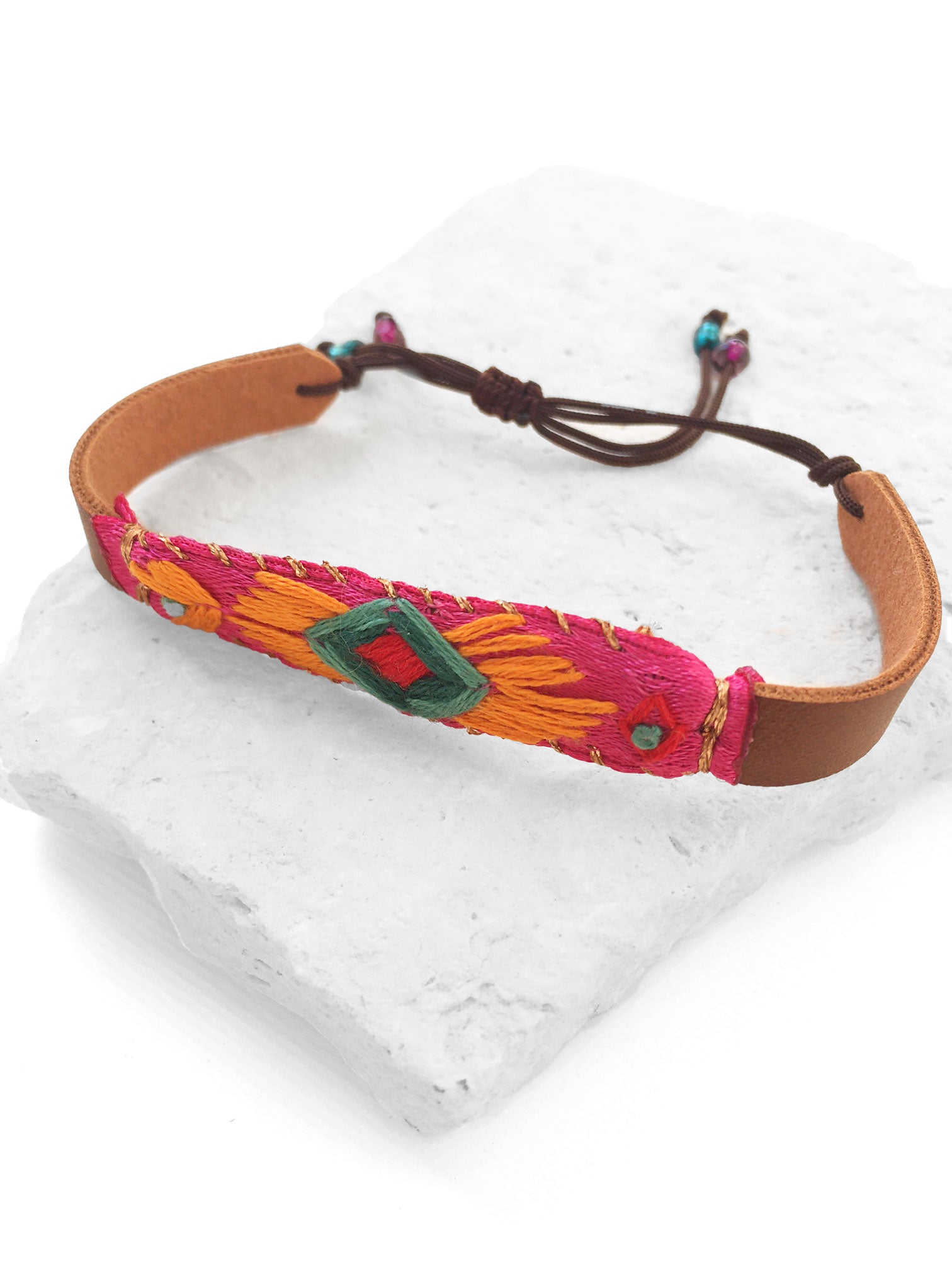 Pulsera bordada a mano con hilo de algodón en tonos naranja, verde, rojo e hilo metálico color cobre, sobre listón rosa y vinipiel café. Broche ajustable de cordón café.