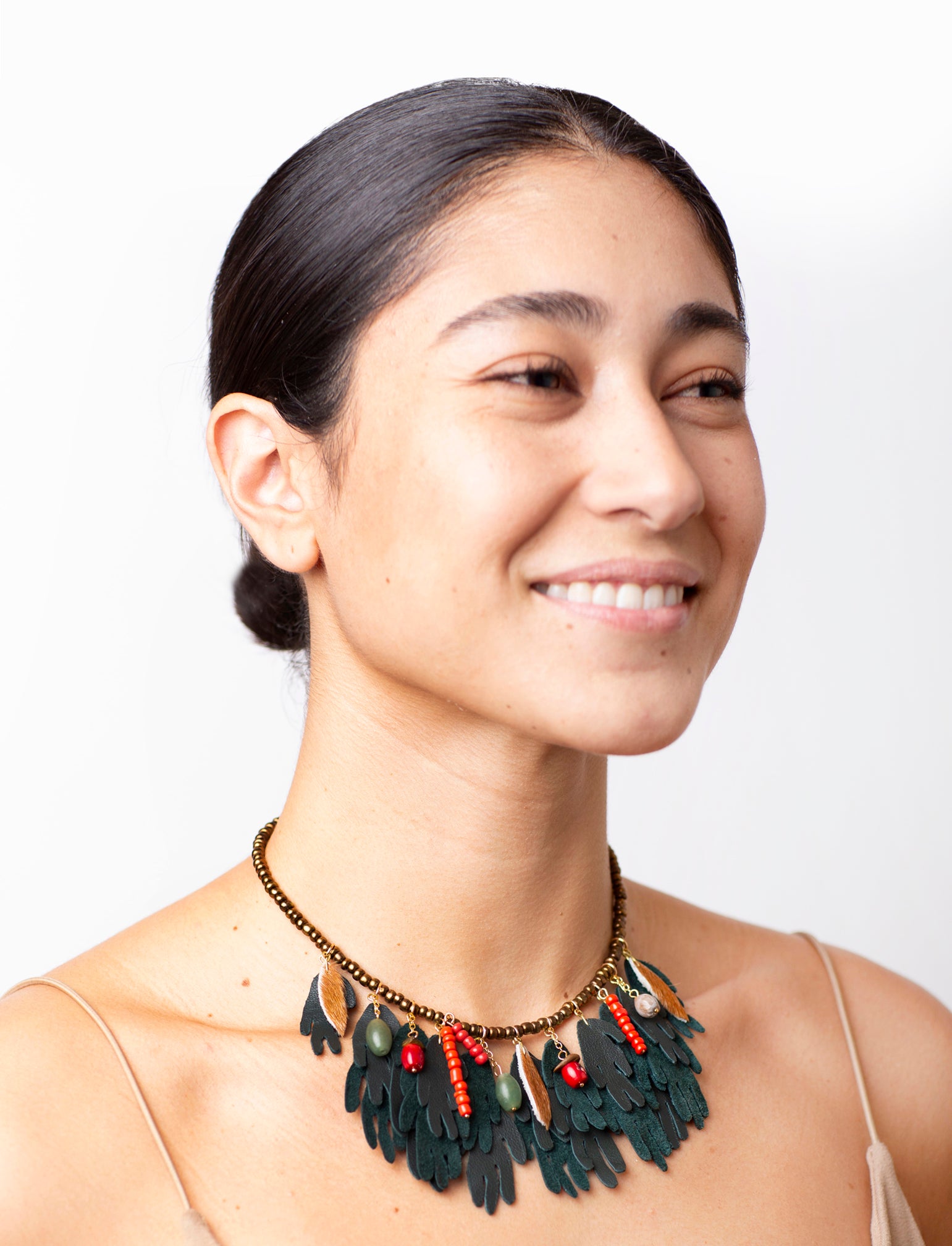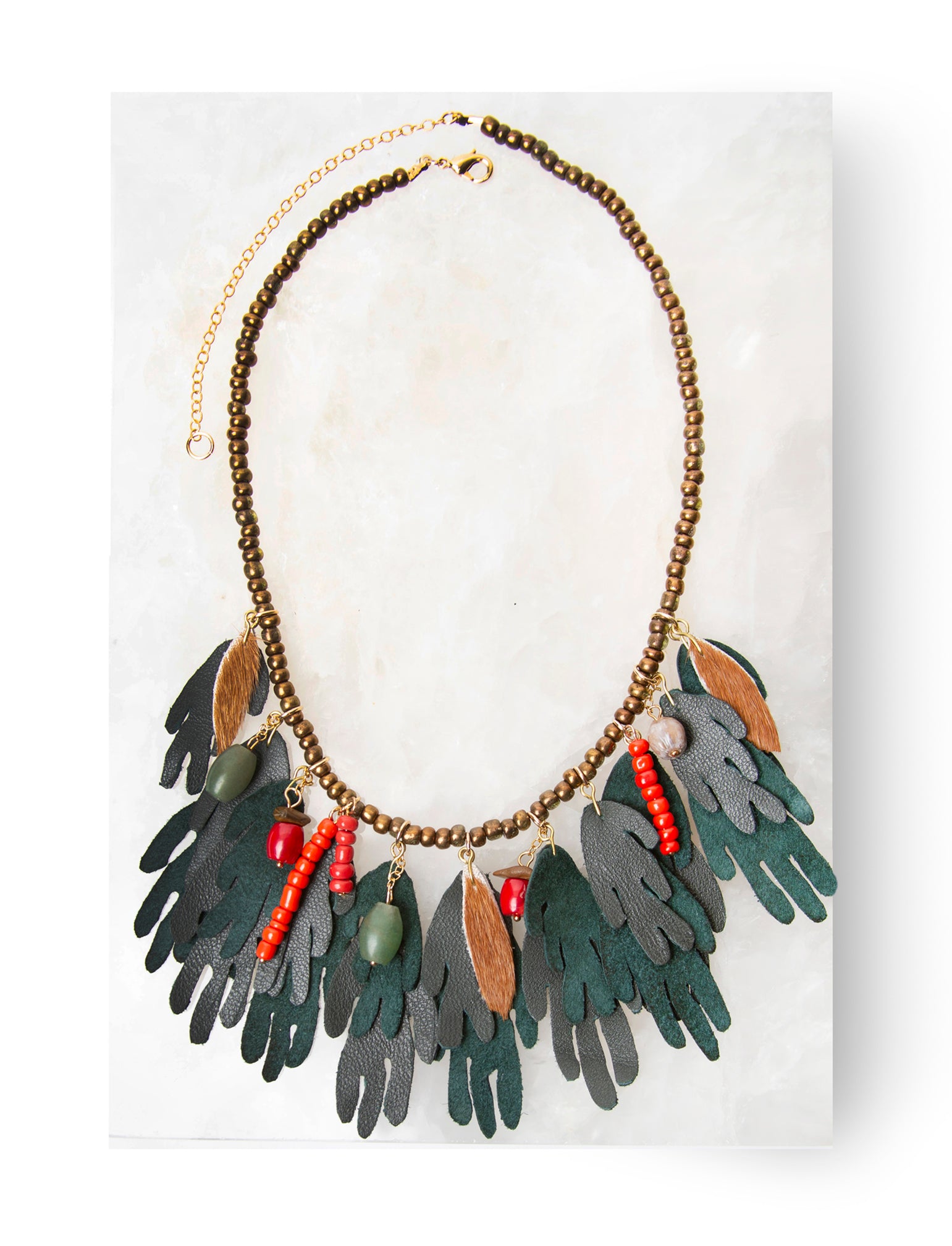 Inspirado en la forma de las algas, y en la flora de nuestros mares que es un mundo exuberante aun por descubrir. Este collar resalta y da elegancia a tu outfit. Está hecho de piel natural color verde oscuro y componentes como cuentas y piedras de colores.