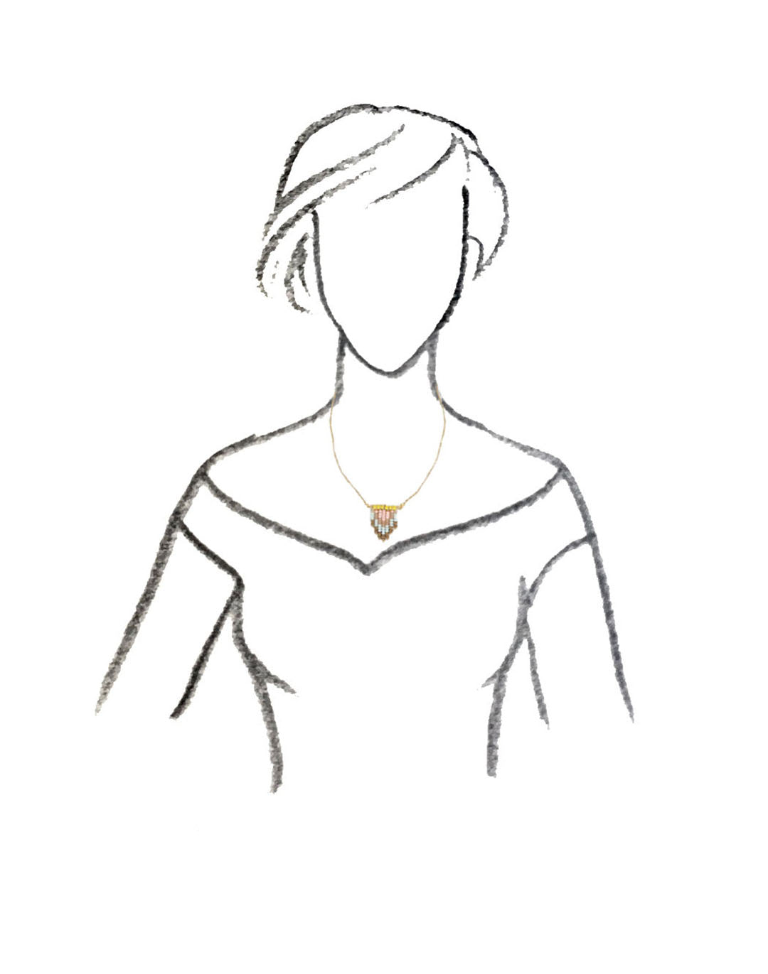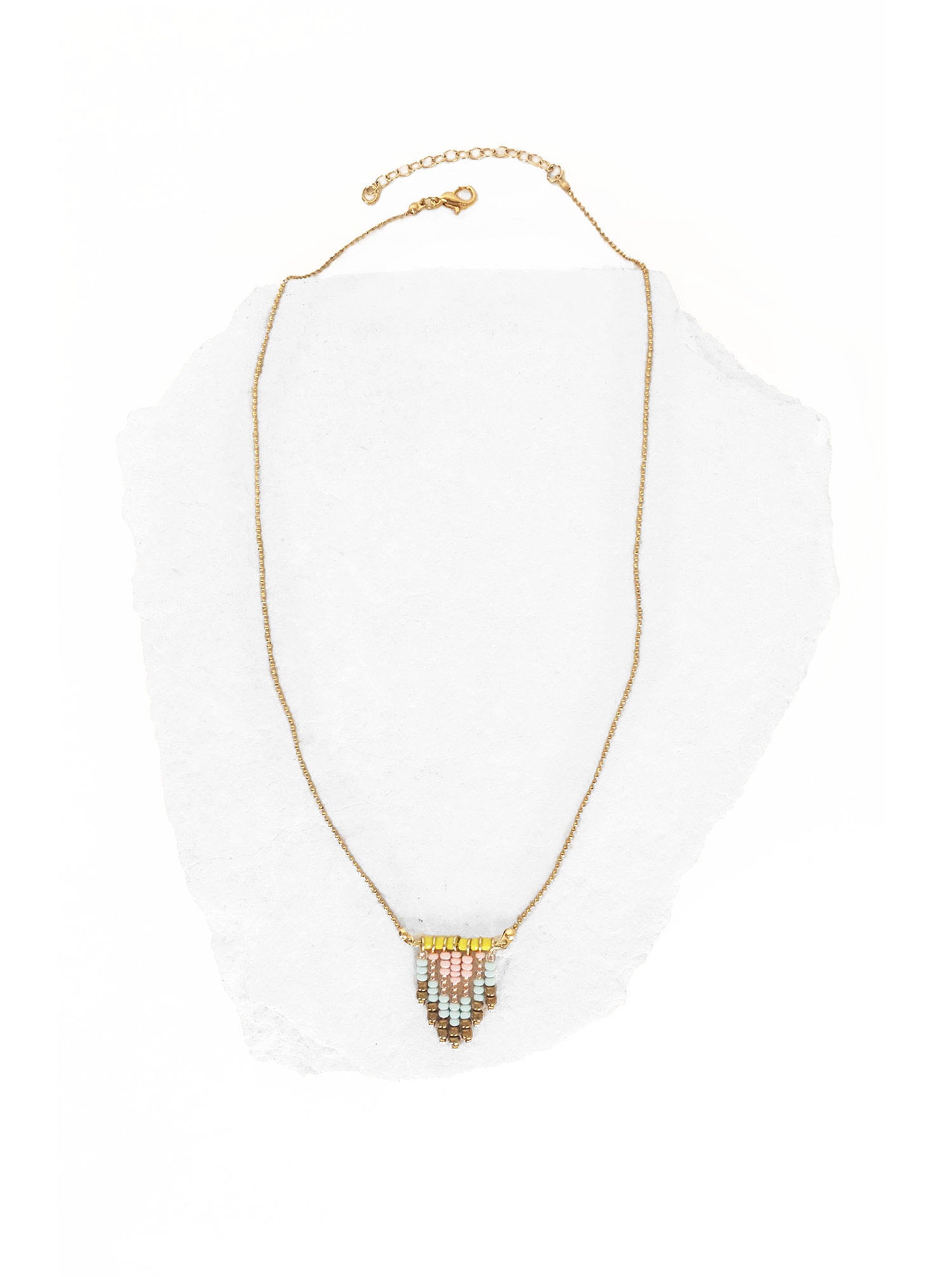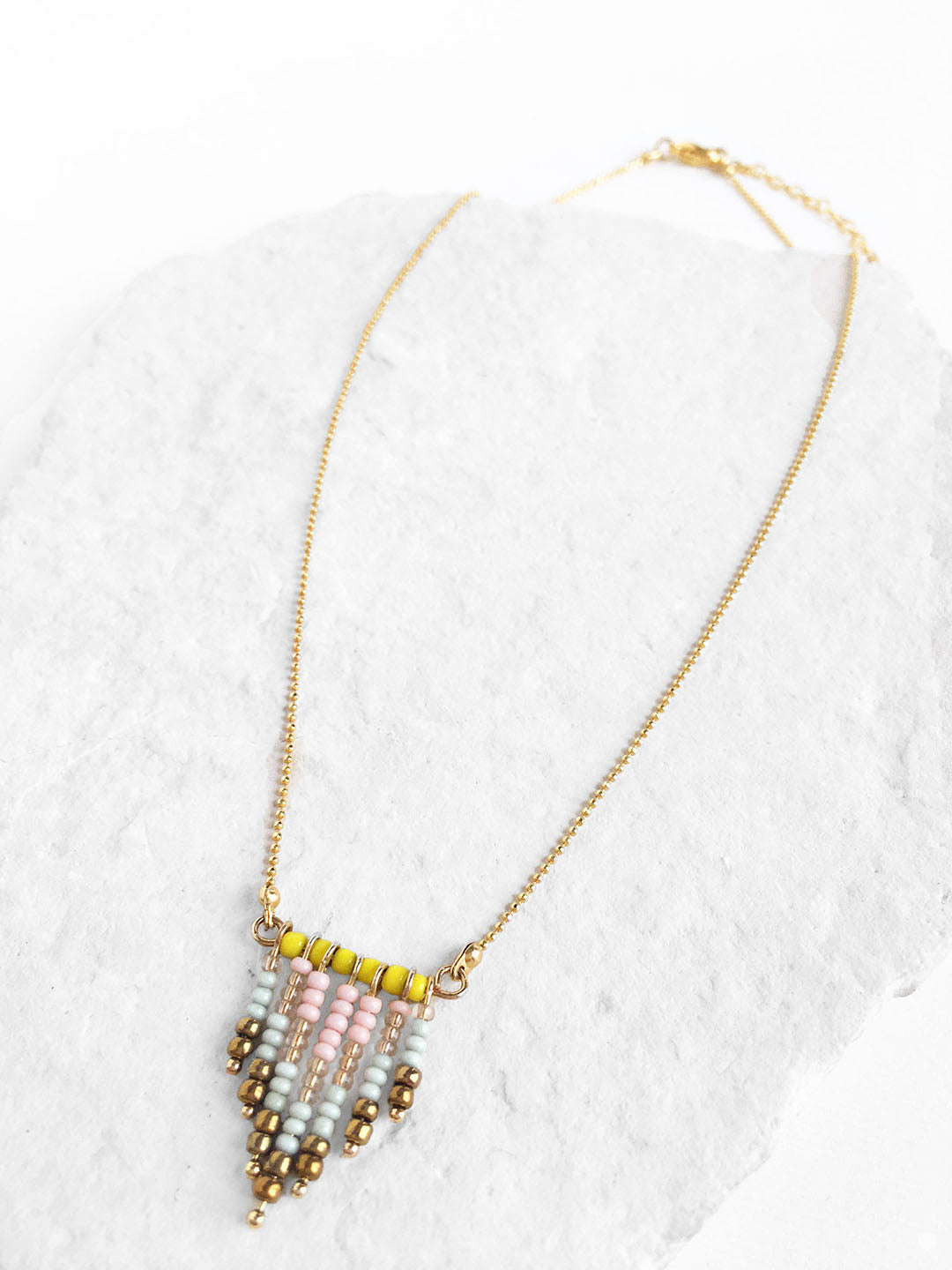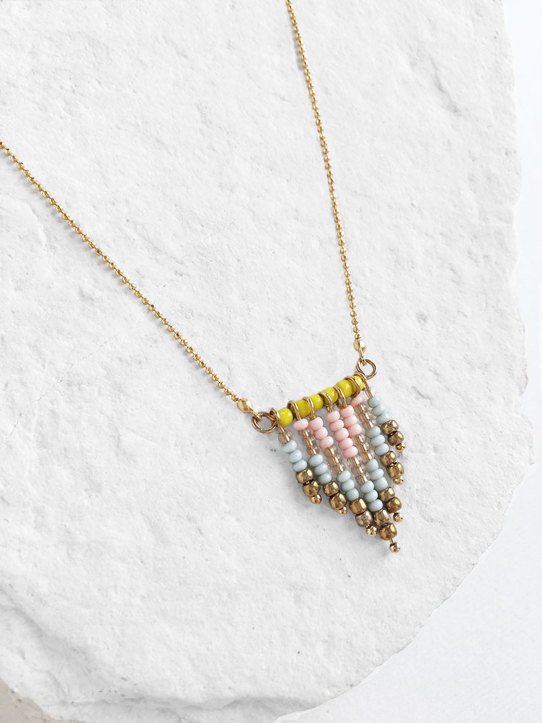 Collar con cadena de chapa de oro, dije de alfileres de chapa de oro y cuentas de vidrio color rosa, verde, amarillo y dorado.