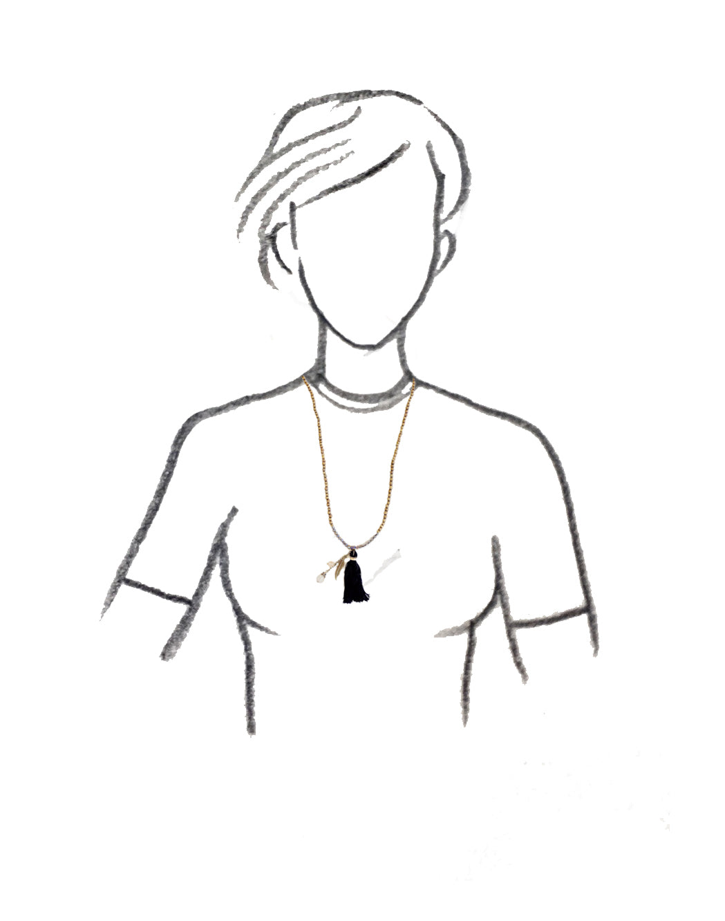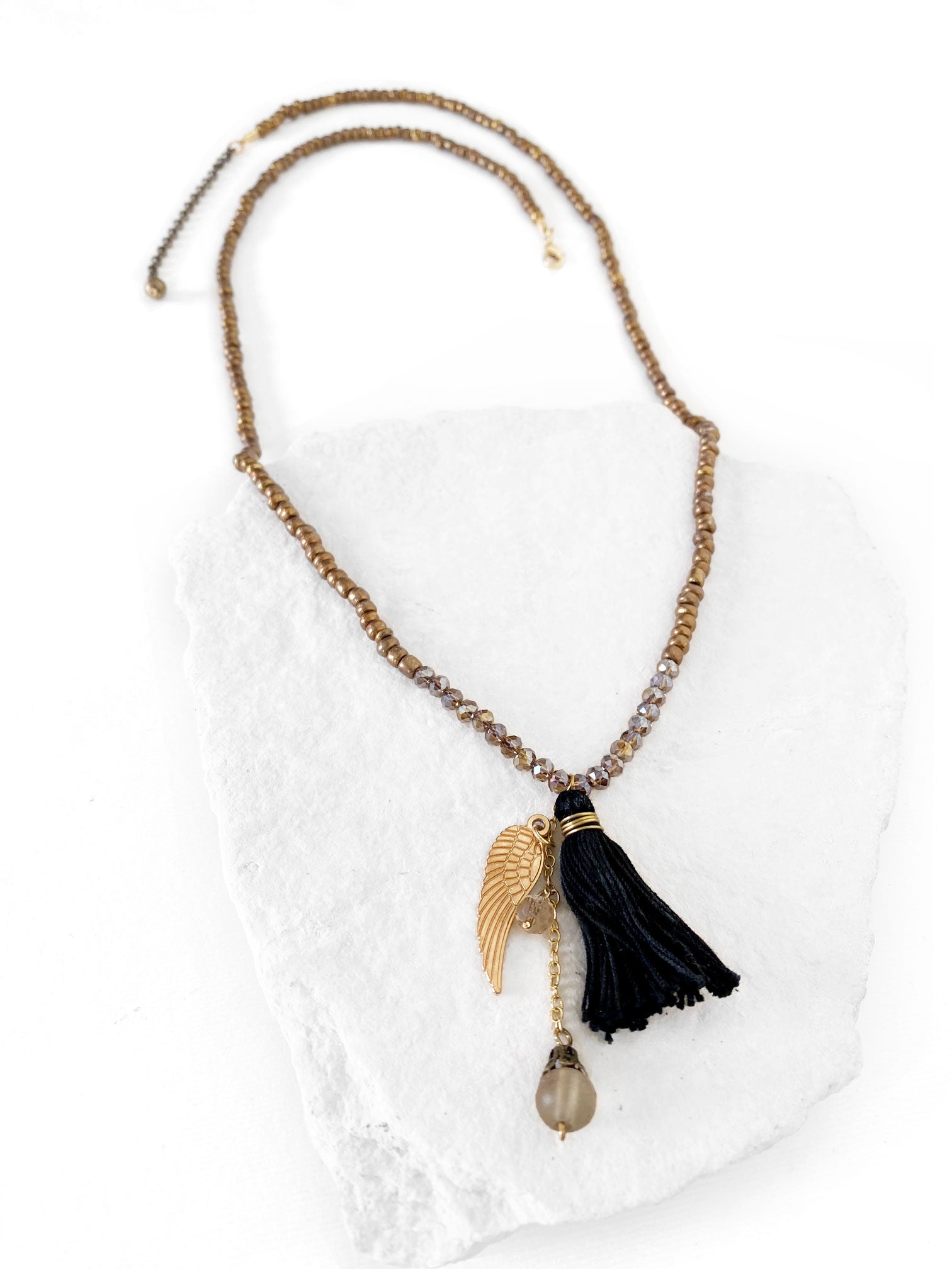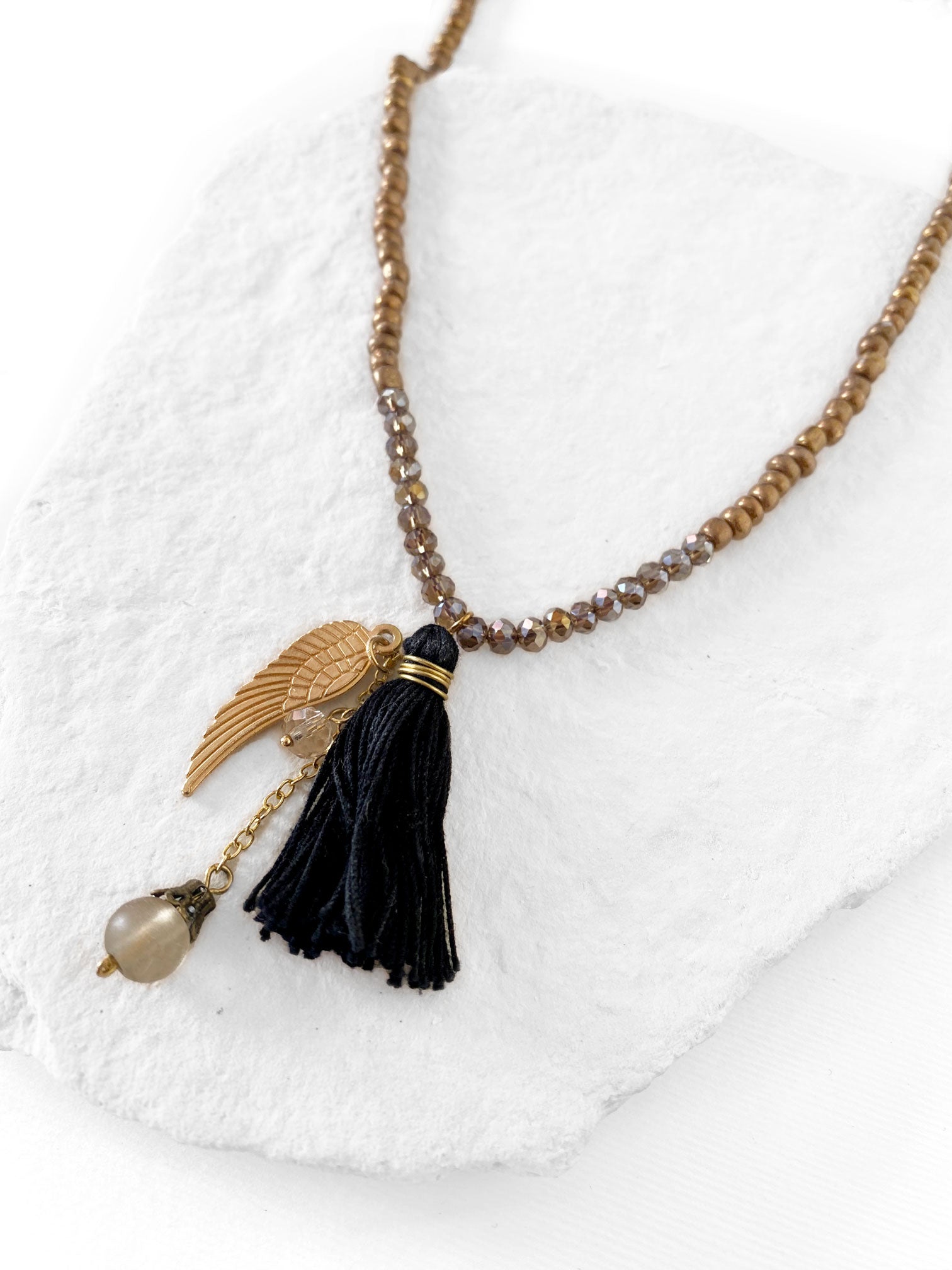 Collar con cuentas de vidrio color oro viejo y dije de pluma color oro viejo con pompón negro. Broche de chapa de oro.