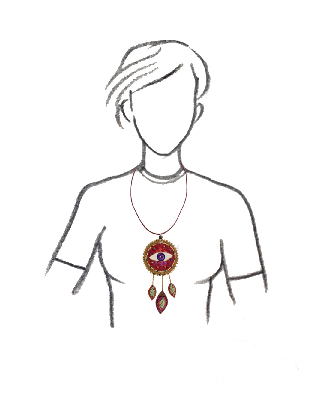 Collar ajustable con dije redondo y hojas textiles colgantes, bordado a mano con hilo de algodón en tonos lila, azul, rojo y cuentas de vidrio color oro viejo sobre fieltro color café, cocoa y vino con cordón de gamuza. El dije representa el ojo de la conciencia que todo lo ve. Es un símbolo de protección, sanación y magia.