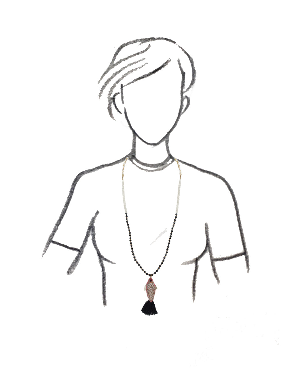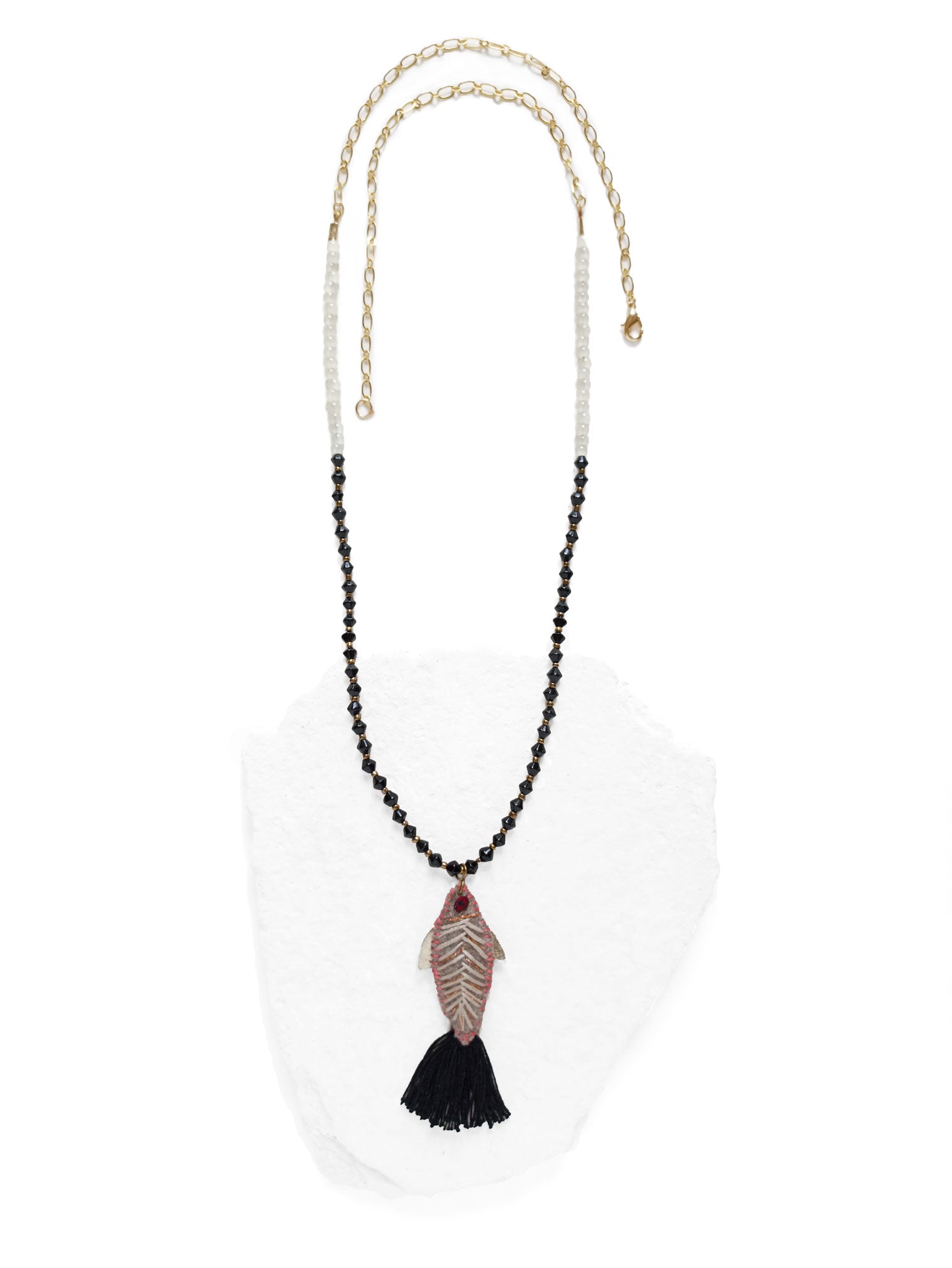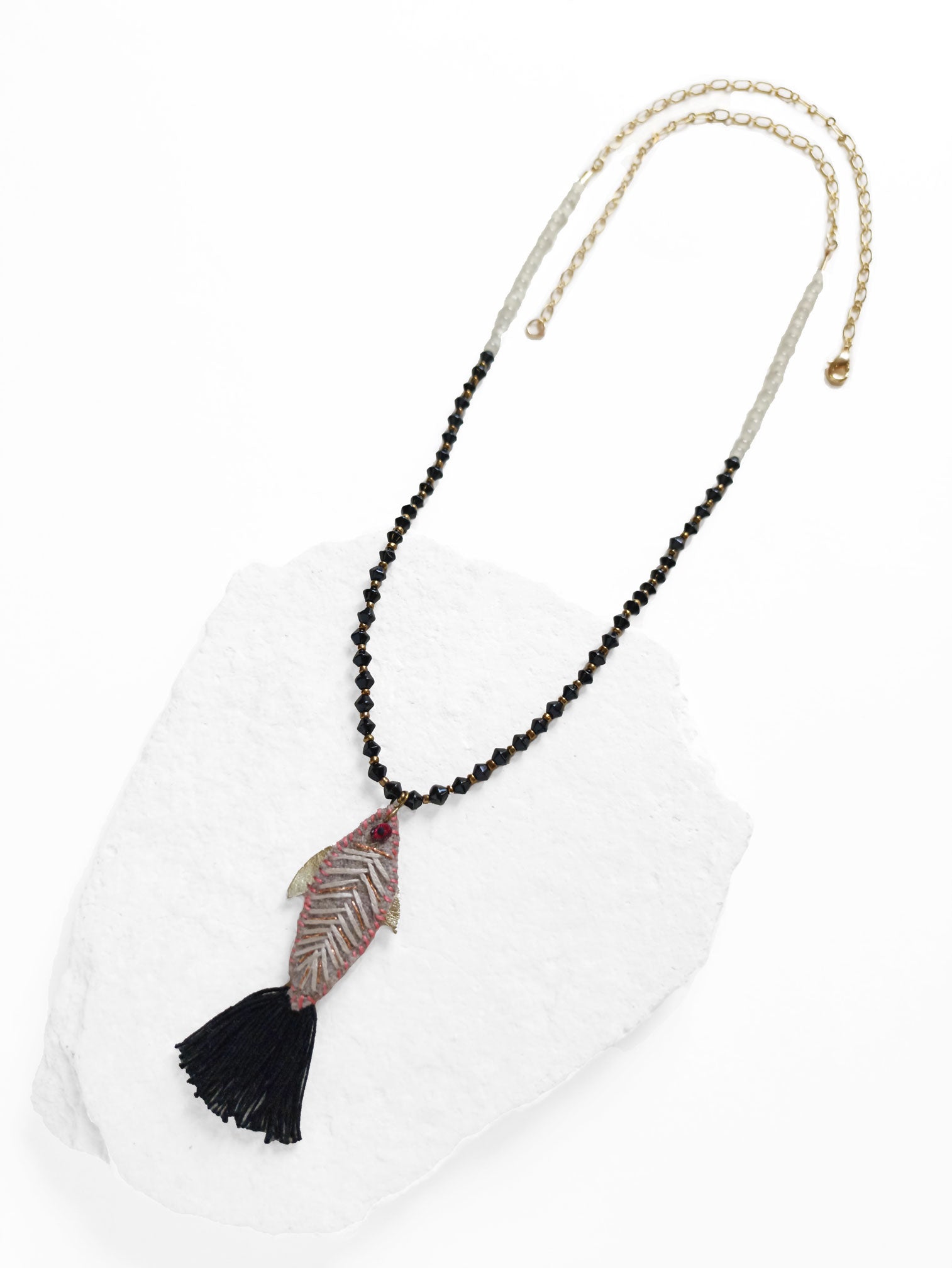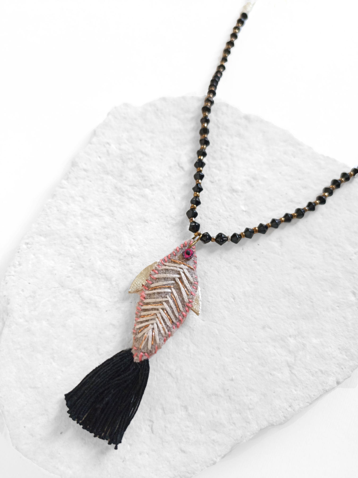 Collar con cadena de chapa de oro y cuentas de vidrio color beige, negro y oro viejo, con dije en forma de pez, bordado a mano con hilo de algodón color coral, beige e hilo metálico cobre sobre tela de lana gris, fieltro beige y vinipiel dorada. Broche de chapa de oro.