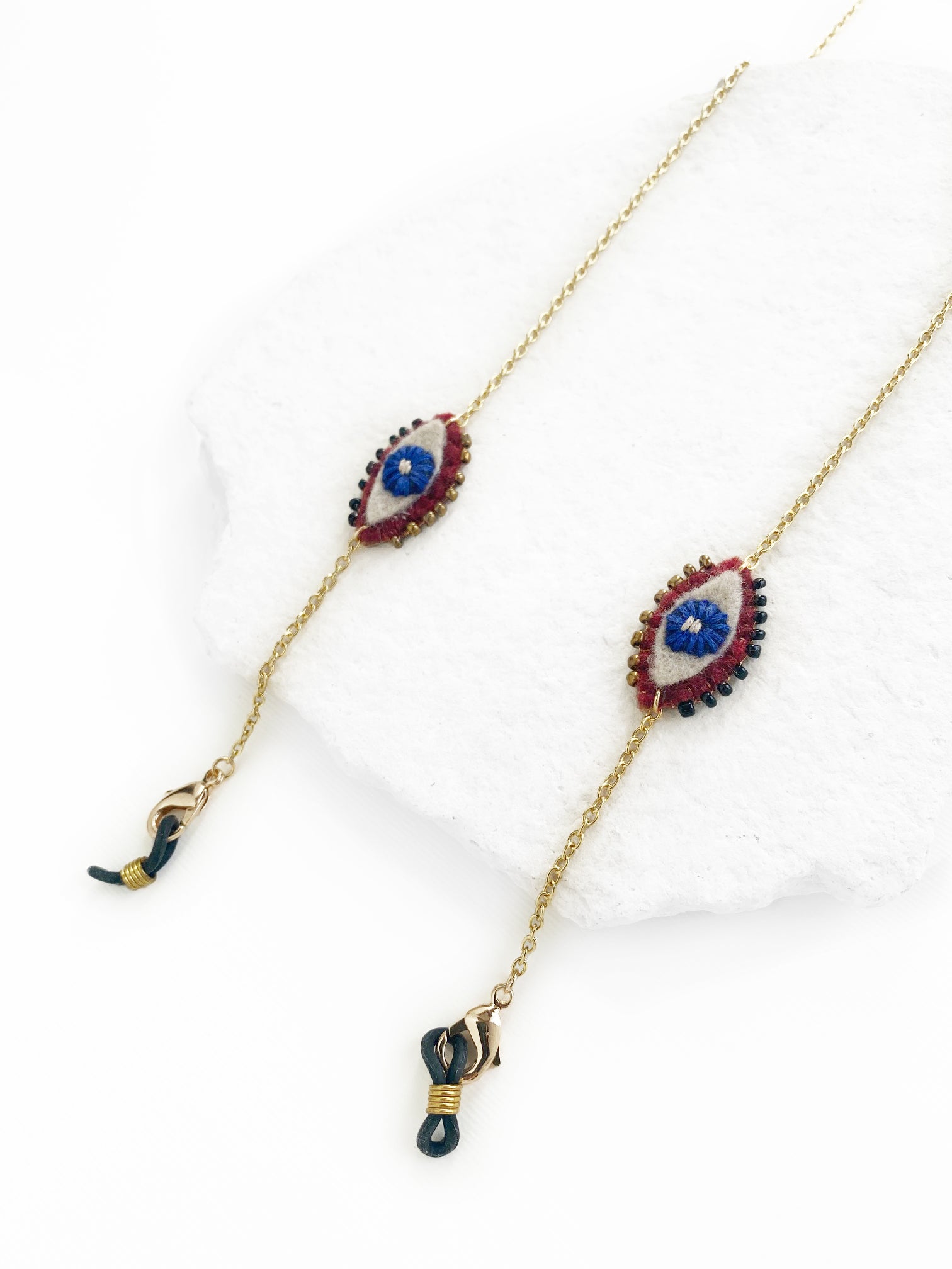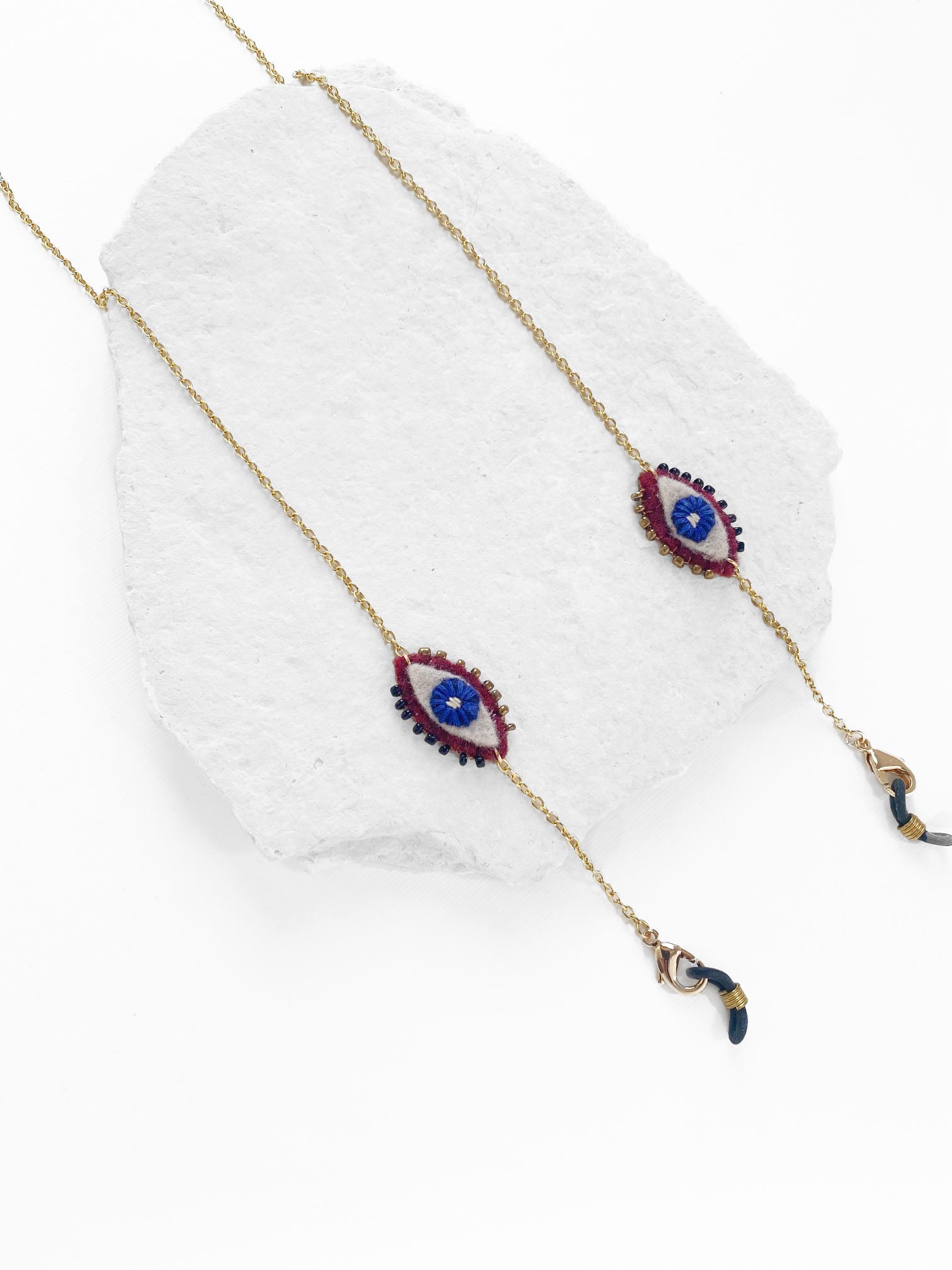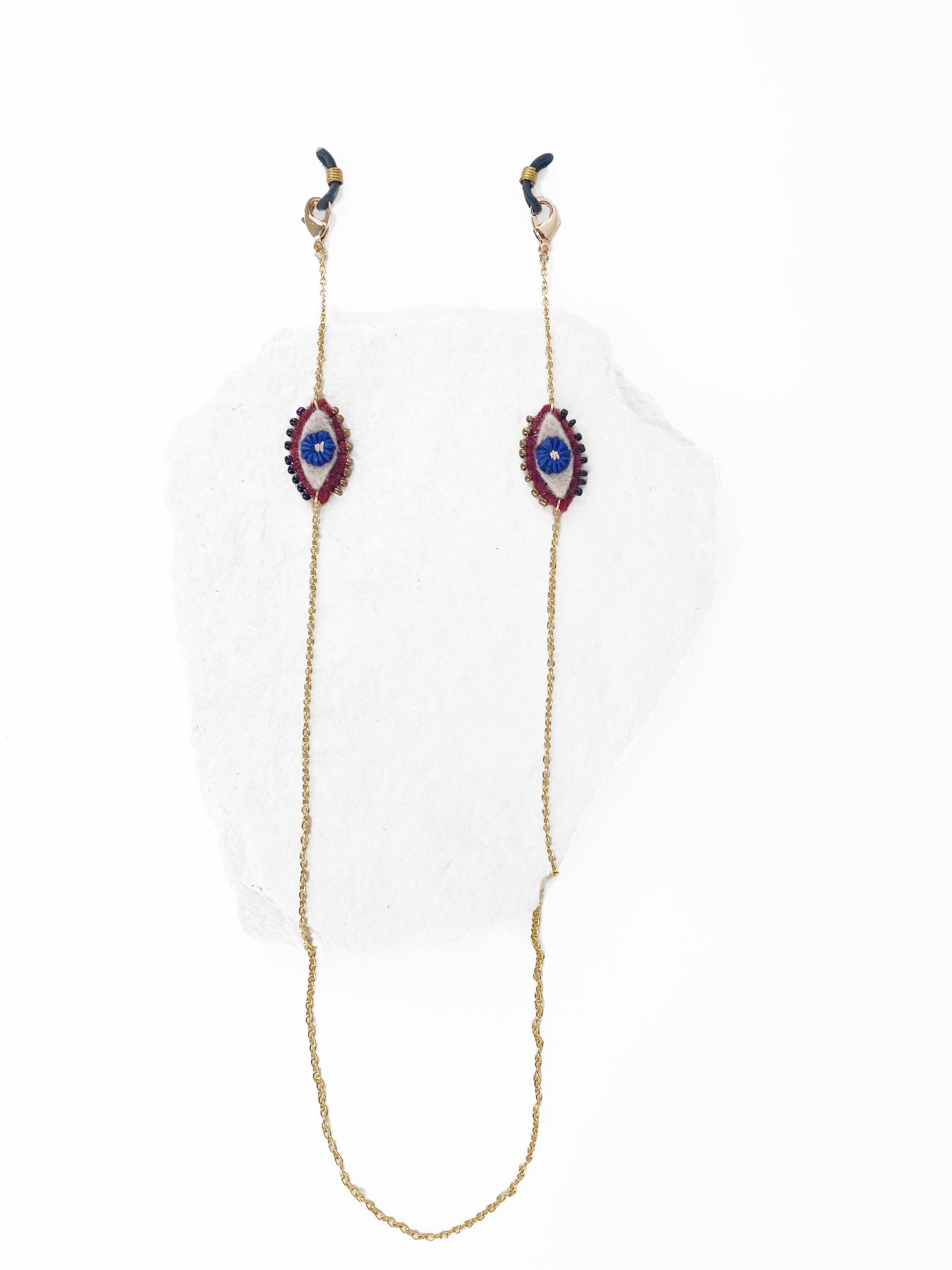 Correa para cubrebocas o gafas, con cadena de chapa de oro, con dijes de ojos, bordados a mano con hilo de algodón color azul, en fieltro guinda, beige y vinipiel café.