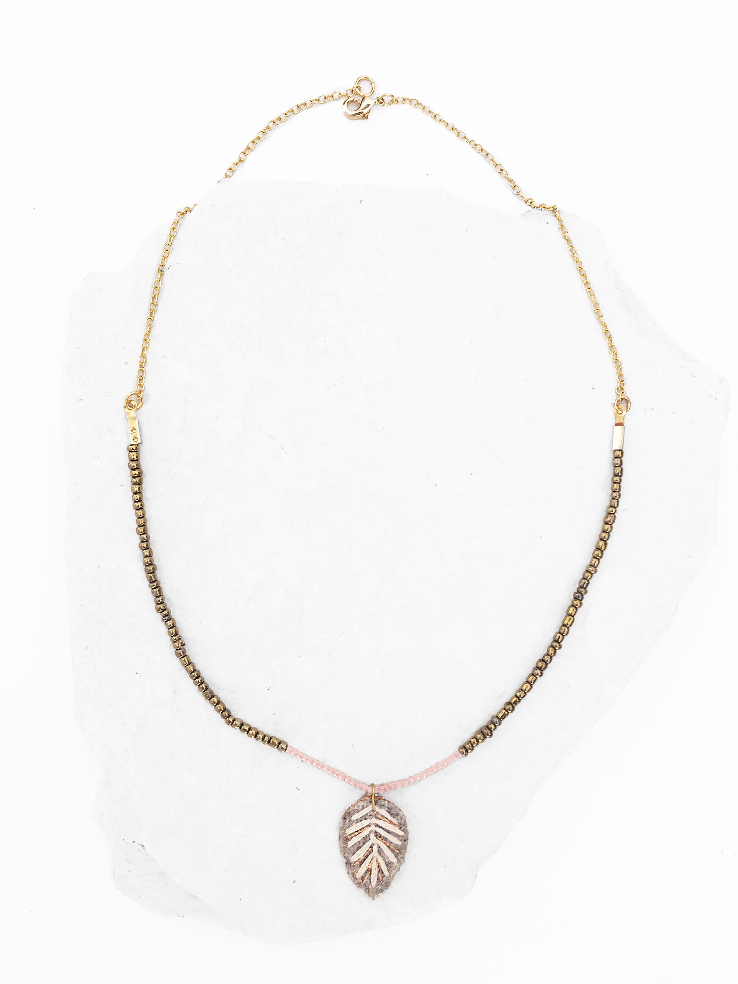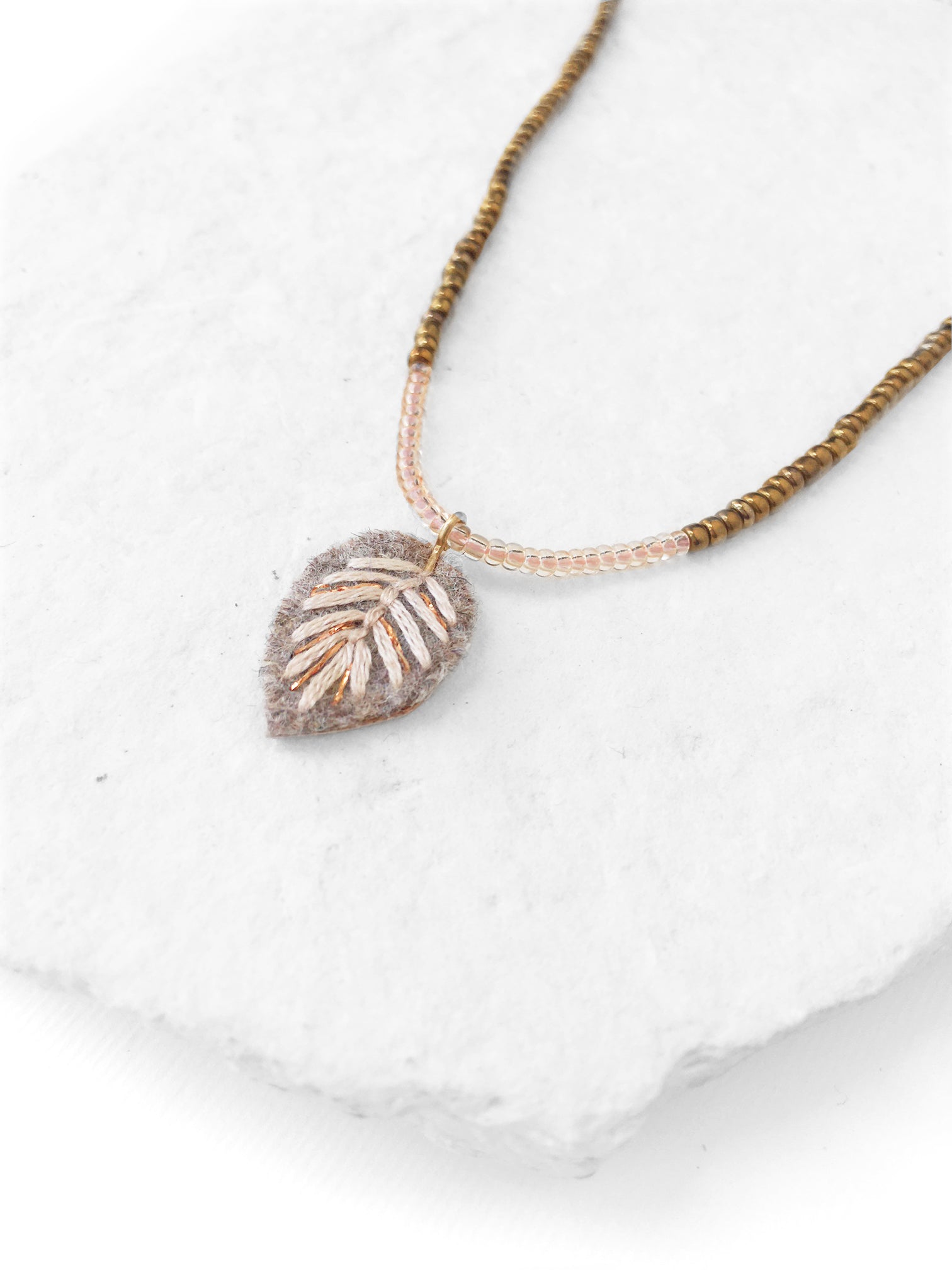 Collar con cuentas de vidrio color lila y oro viejo, cadena de chapa de oro, con dije de hoja, bordado con hilo de algodón color beige e hilo metálico cobre, en paño de lana gris y vinipiel café.