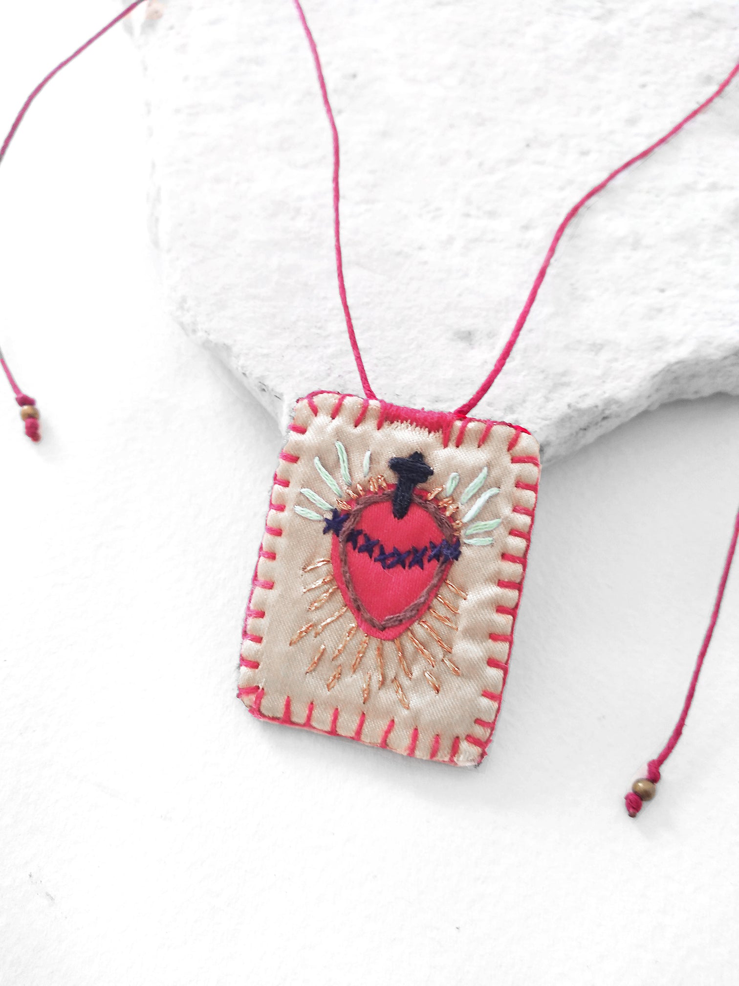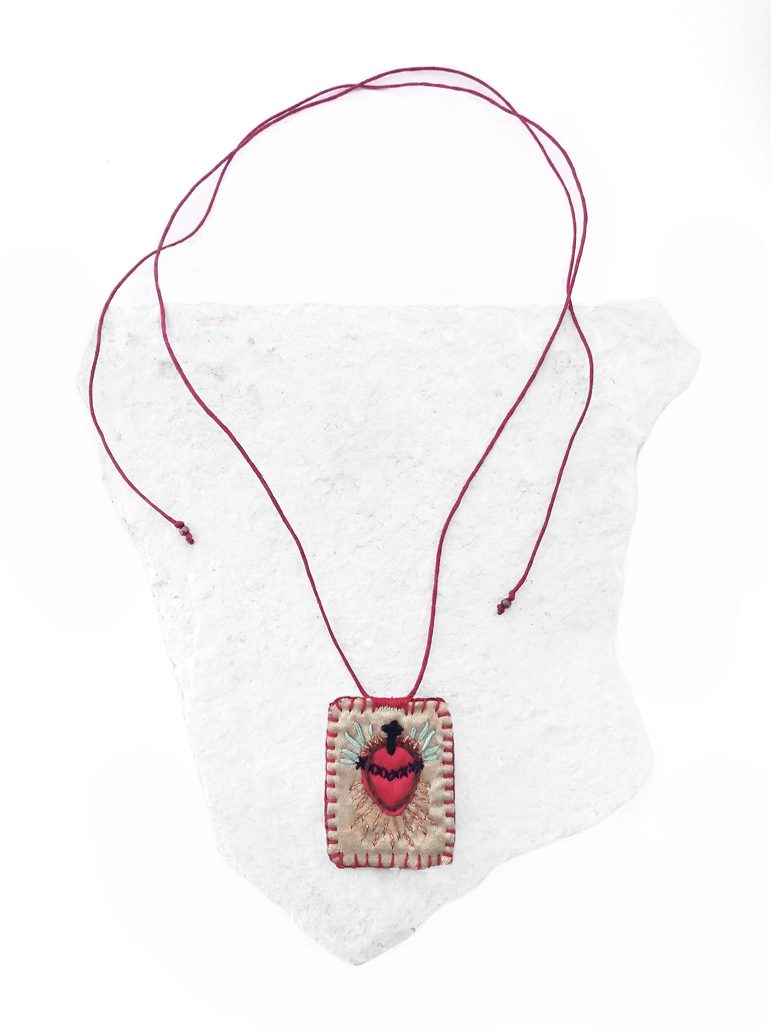 Escapulario cuadrado, bordado a mano en satín color beige, con hilo de algodón color rojo, café, azul marino, negro e hilo metálico color cobre con cordón rojo.