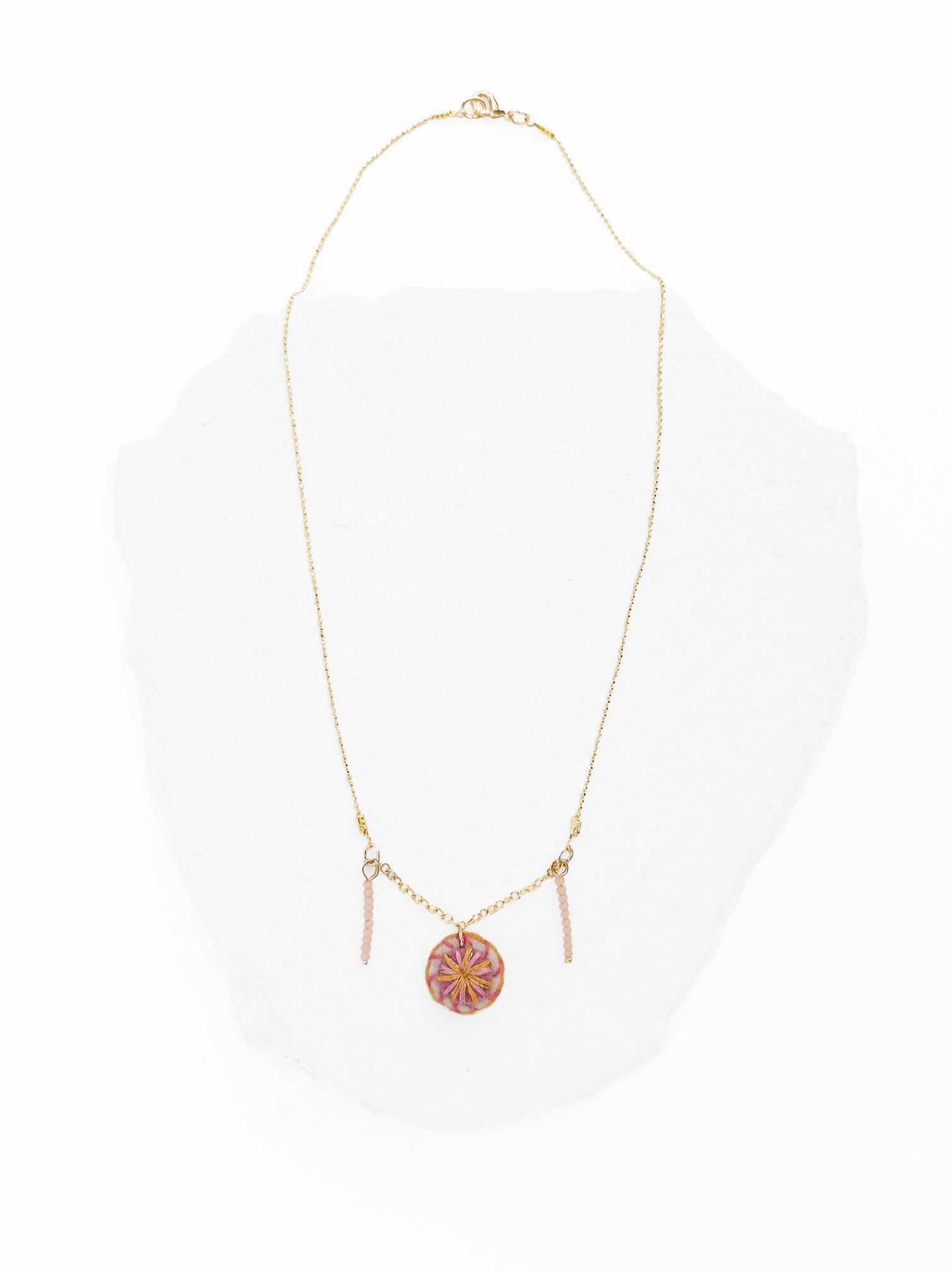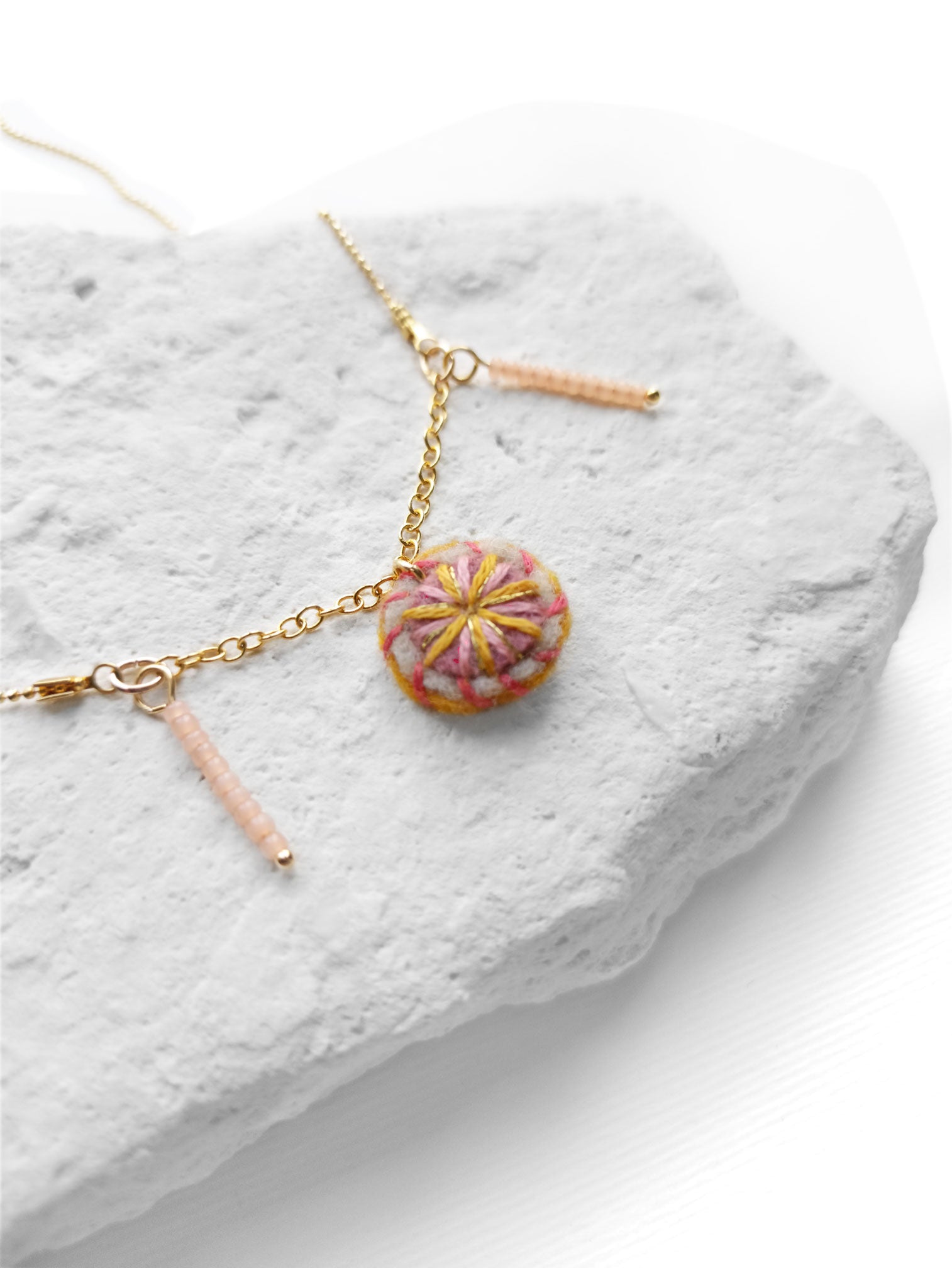 Collar de cadena de chapa de oro, con dije redondo bordado a mano con hilo de algodón color rosa, amarillo, coral e hilo metálico cobre sobre fieltro beige, rosa y amarillo mostaza, con colgante de cuentas de vidrio color rosa. Broche de chapa de oro.