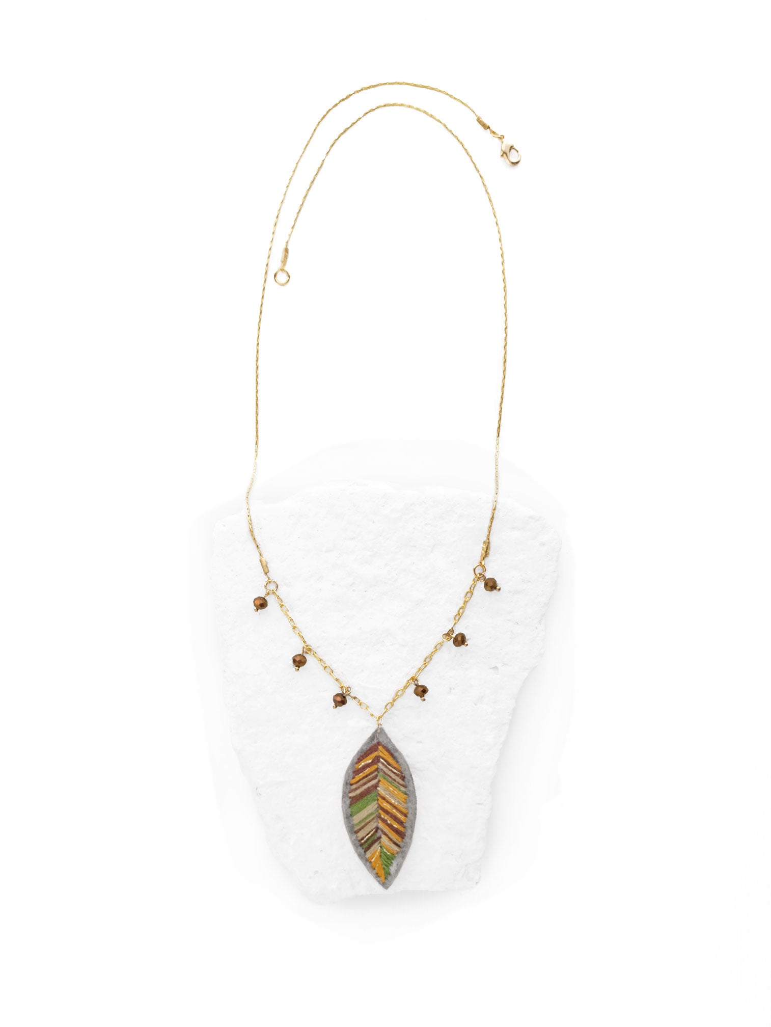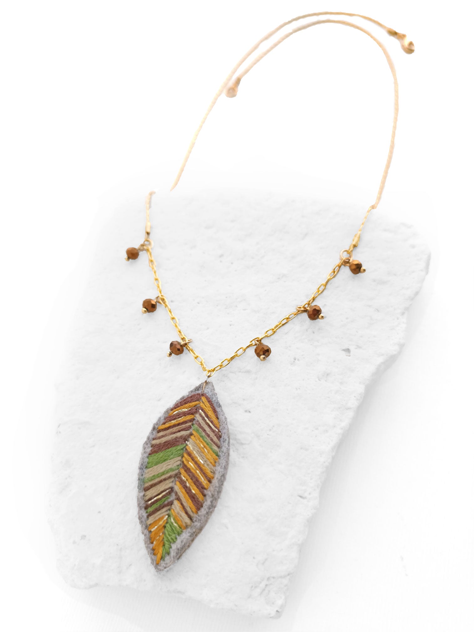Collar con cadena de chapa de oro y dije en forma de hoja bordado a mano con hilo de algodón color amarillo, café, verde e hilo metálico dorado sobre tela de lana. Cuentas de vidrio facetadas color café. Broche de chapa de oro.