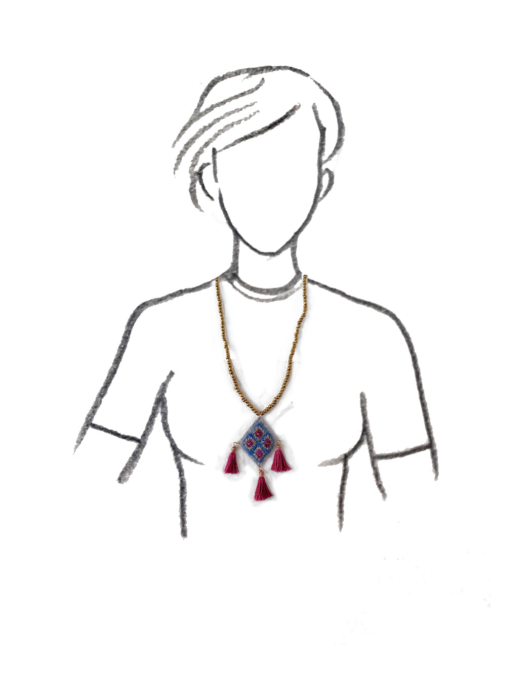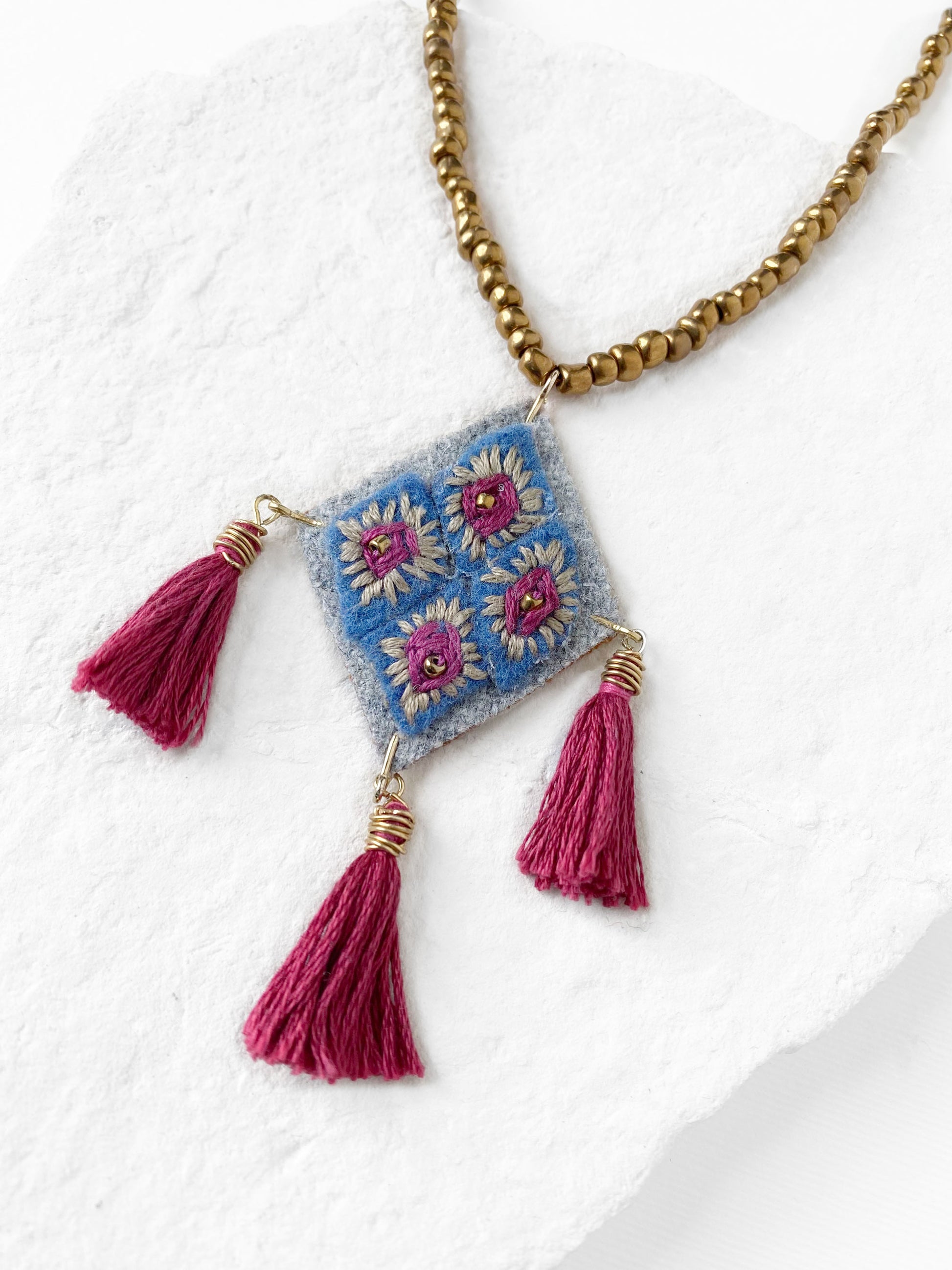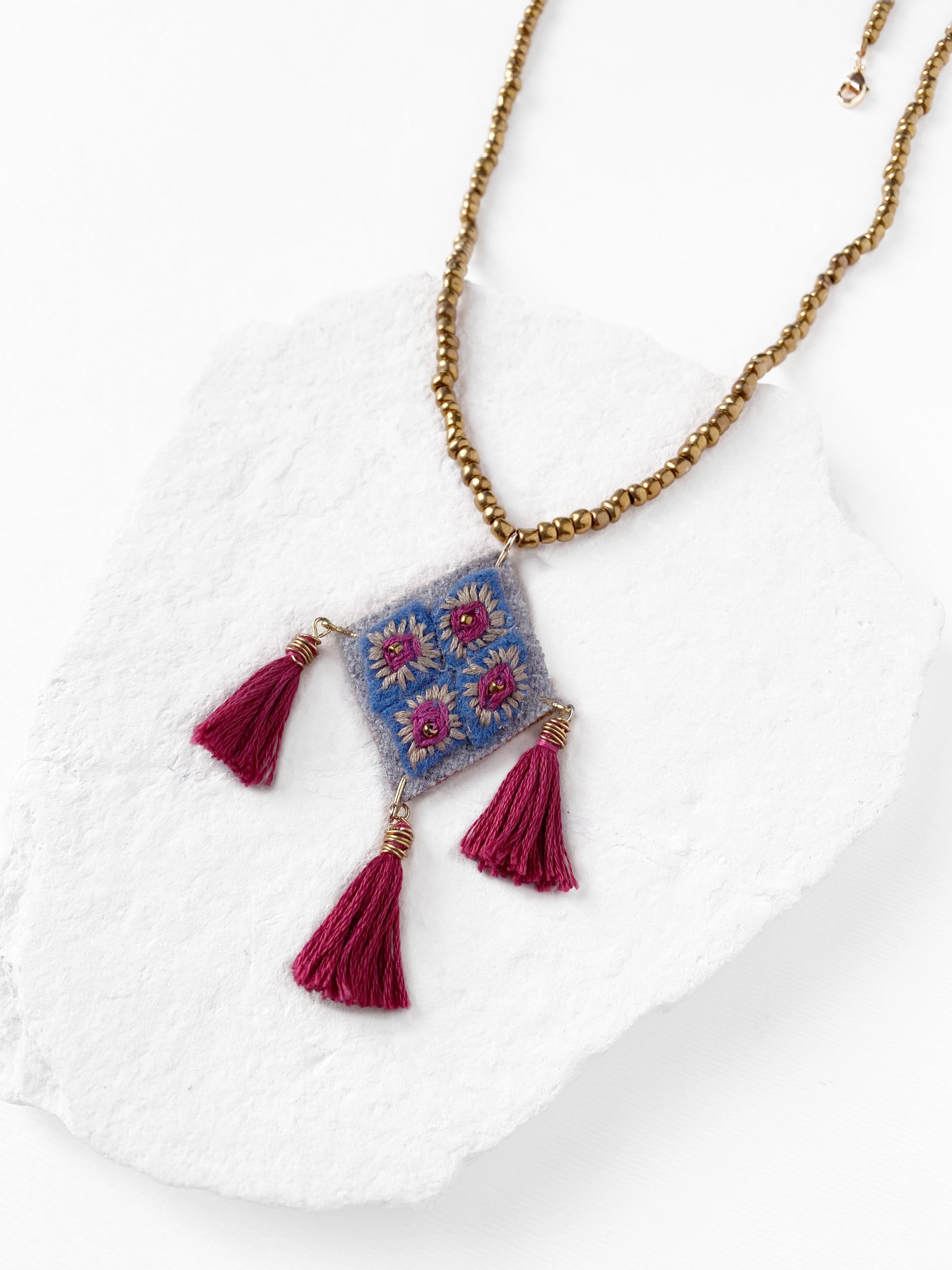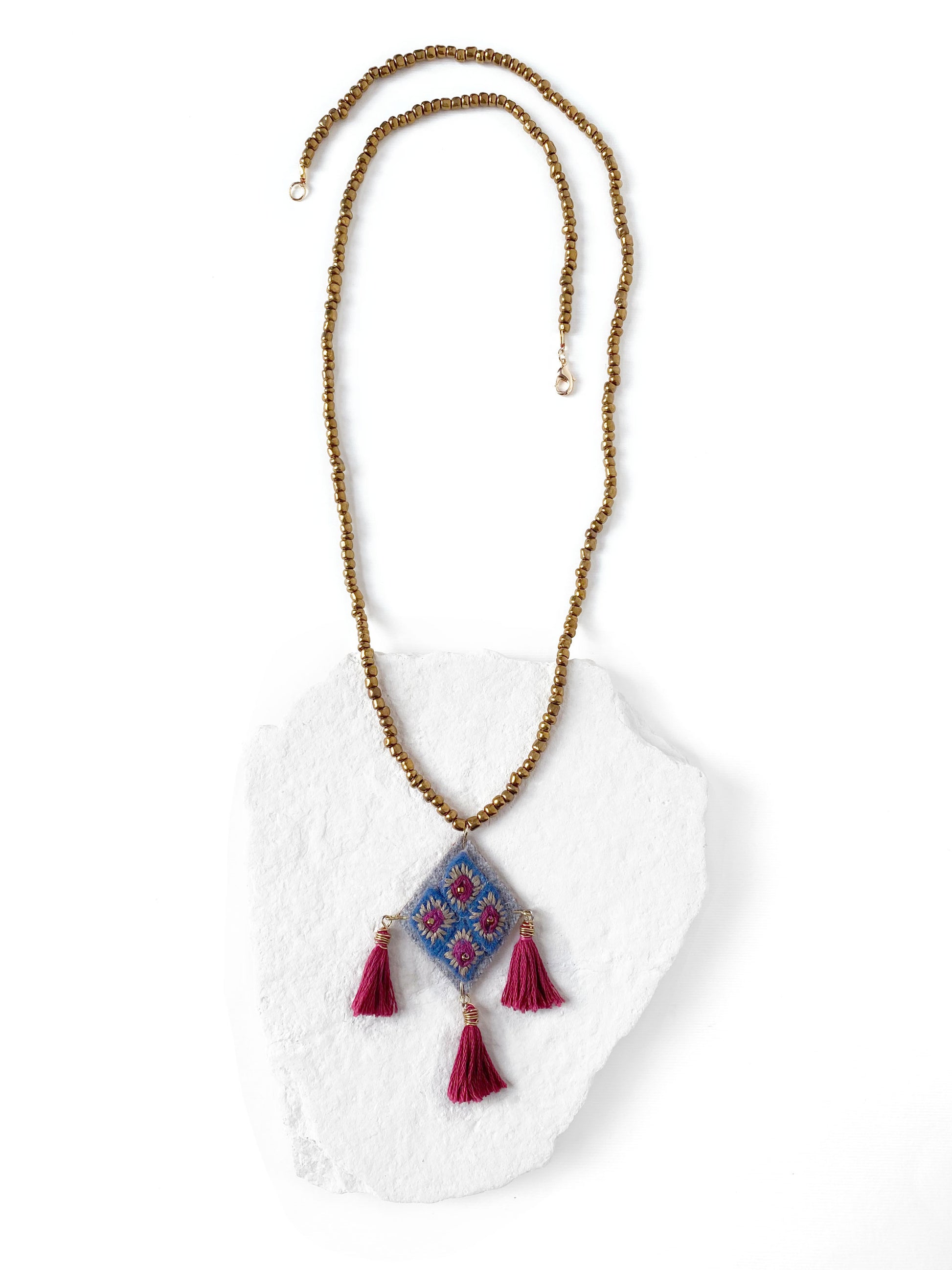 Collar de cuentas de vidrio color oro viejo con dije en forma de rombo, bordado a mano con hilo de algodón color gris y vino, con pompones color vino.