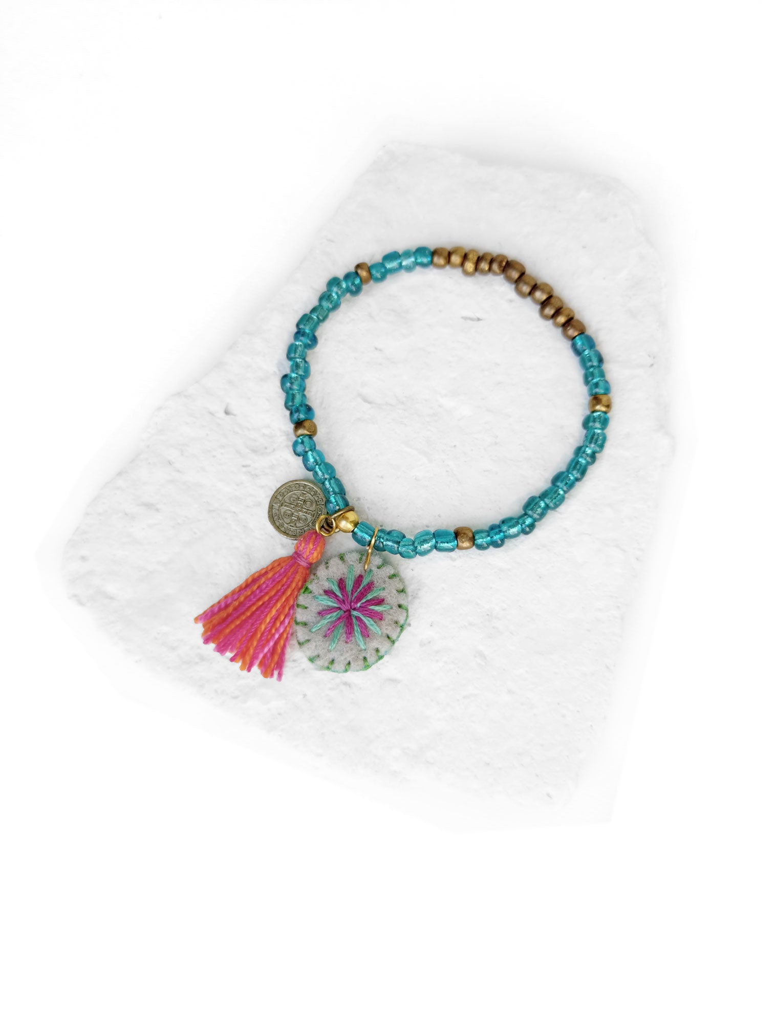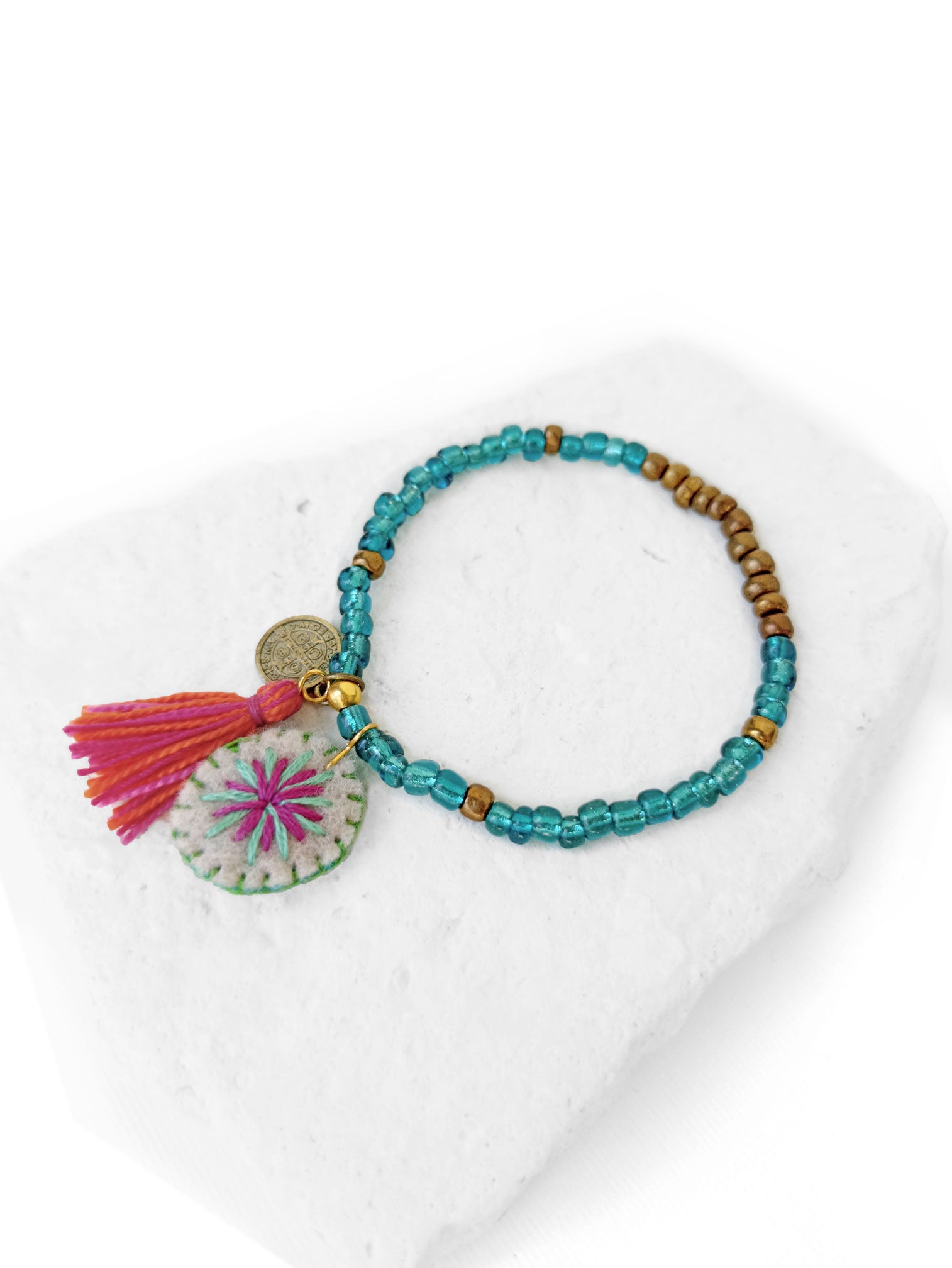 Pulsera con cuentas de vidrio color aqua y oro viejo engarzada en hilo elástico, con dije ovalado bordado a mano con hilo de algodón de varios colores sobre fieltro beige y azul. Dije de metal y pompón.