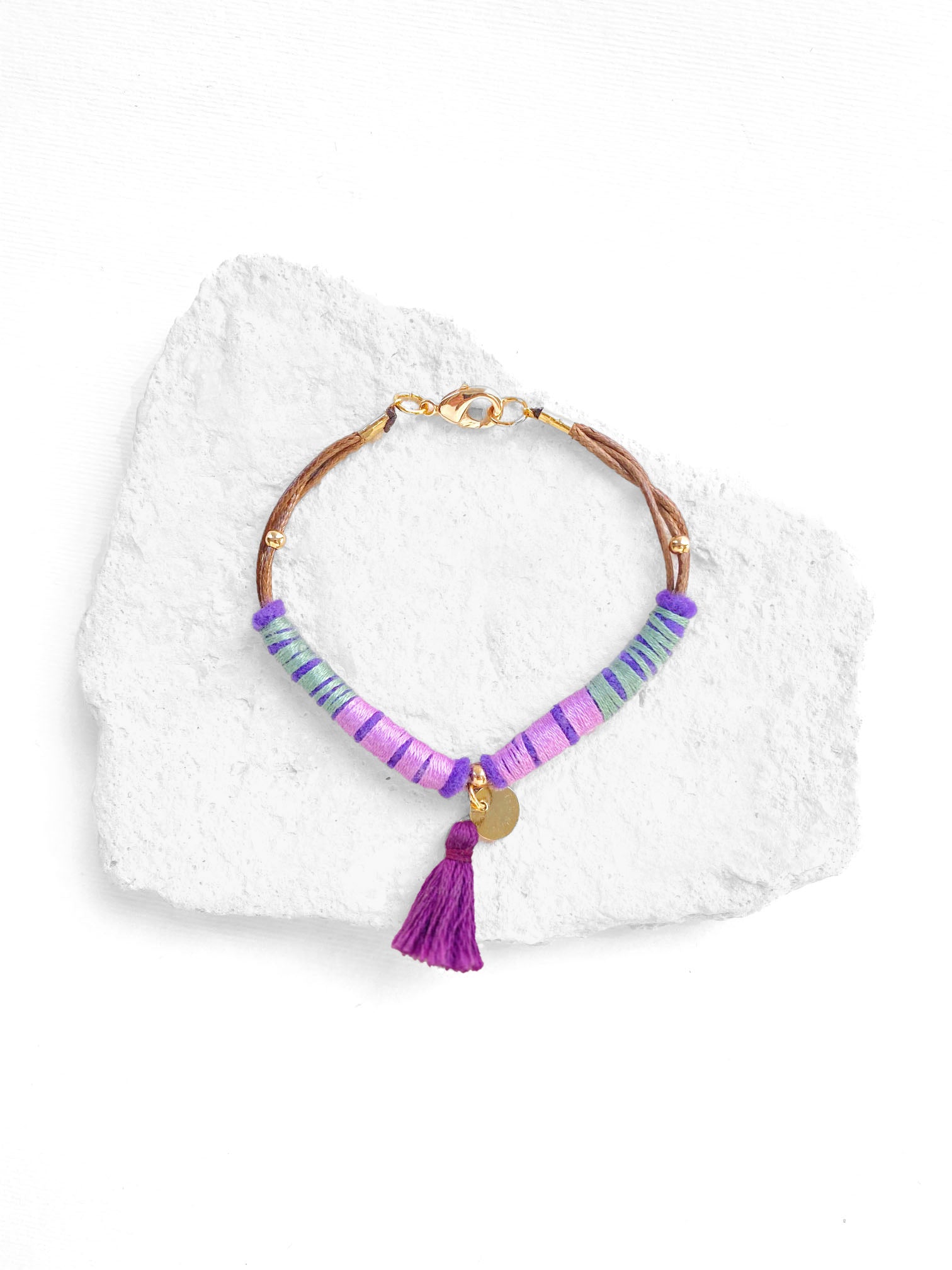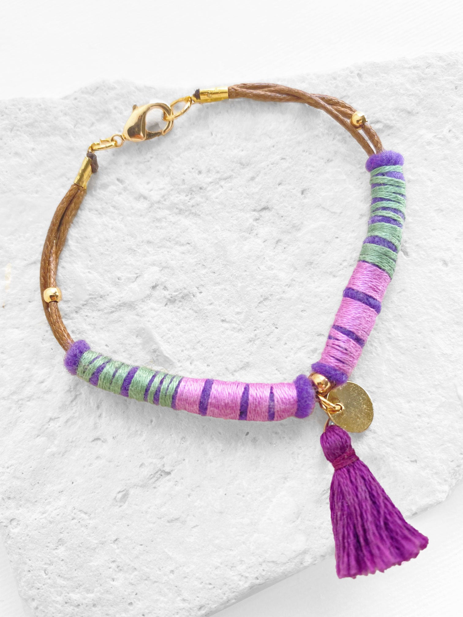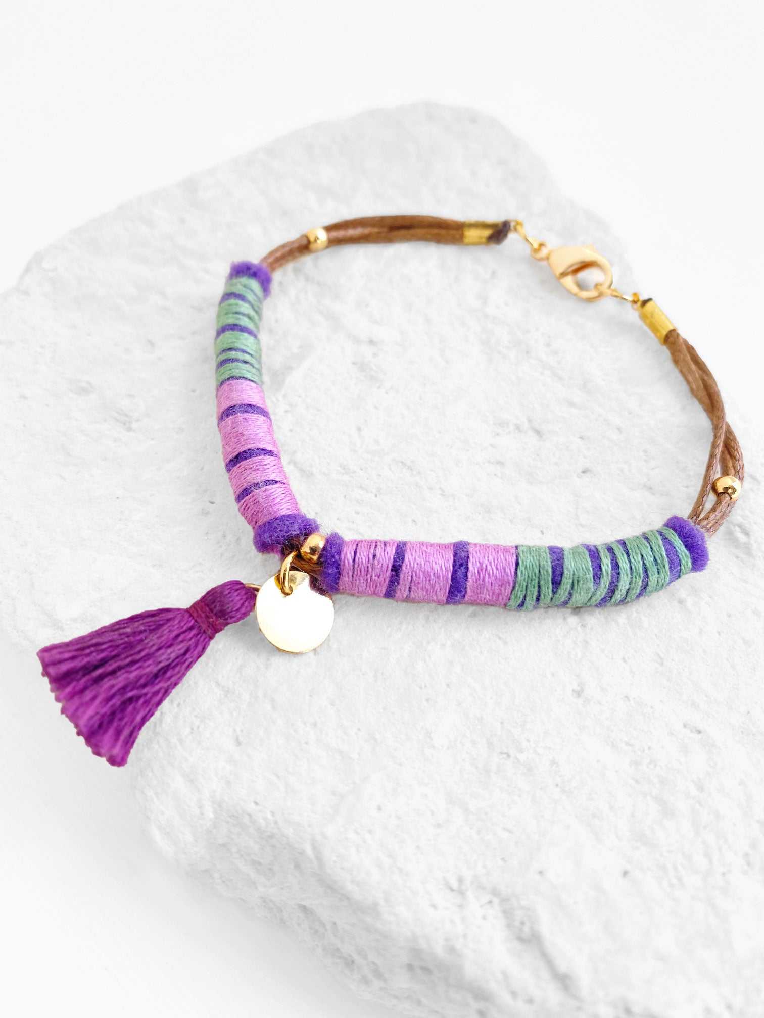 Pulsera de cordón café, con hilos de algodón color lila y verde sobre fieltro morado, con brocha color violeta. Broche y componentes metálicos de chapa de oro.