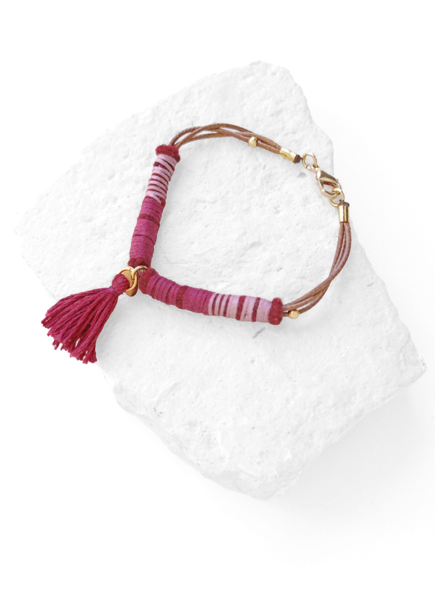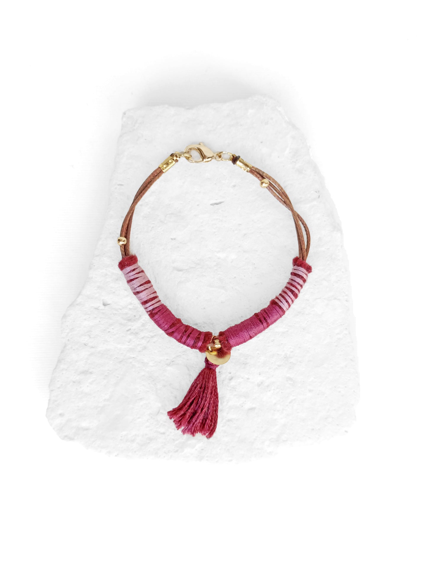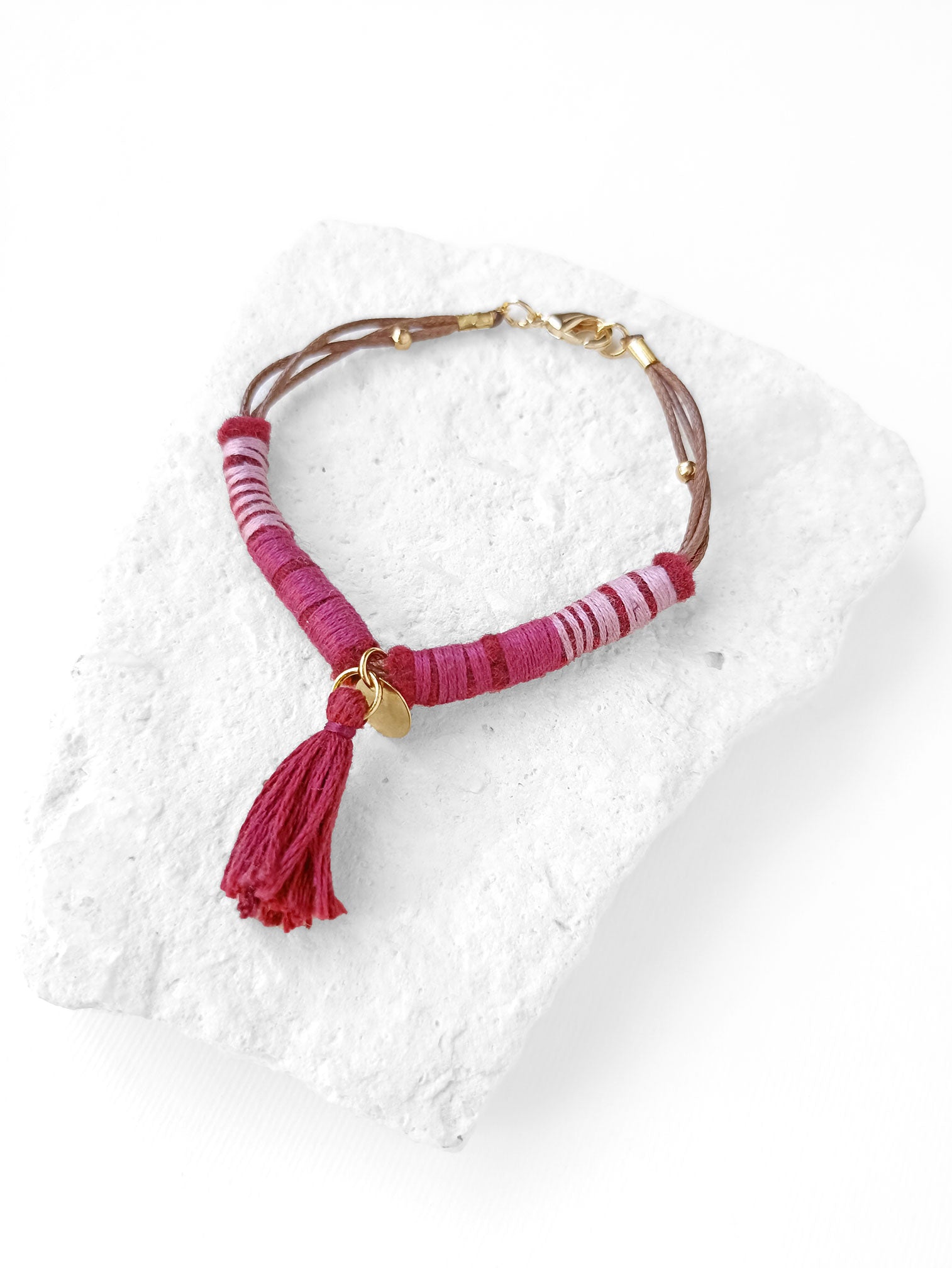 Pulsera de cordón café, decorada con hilos de algodón color rosa y lila sobre fieltro color vino, con pompón color vino. Broche y componentes metálicos de chapa de oro.