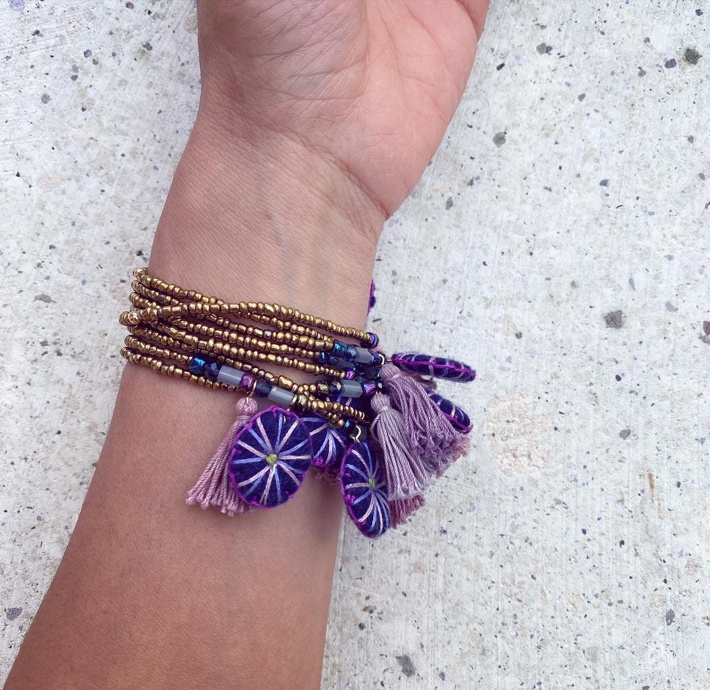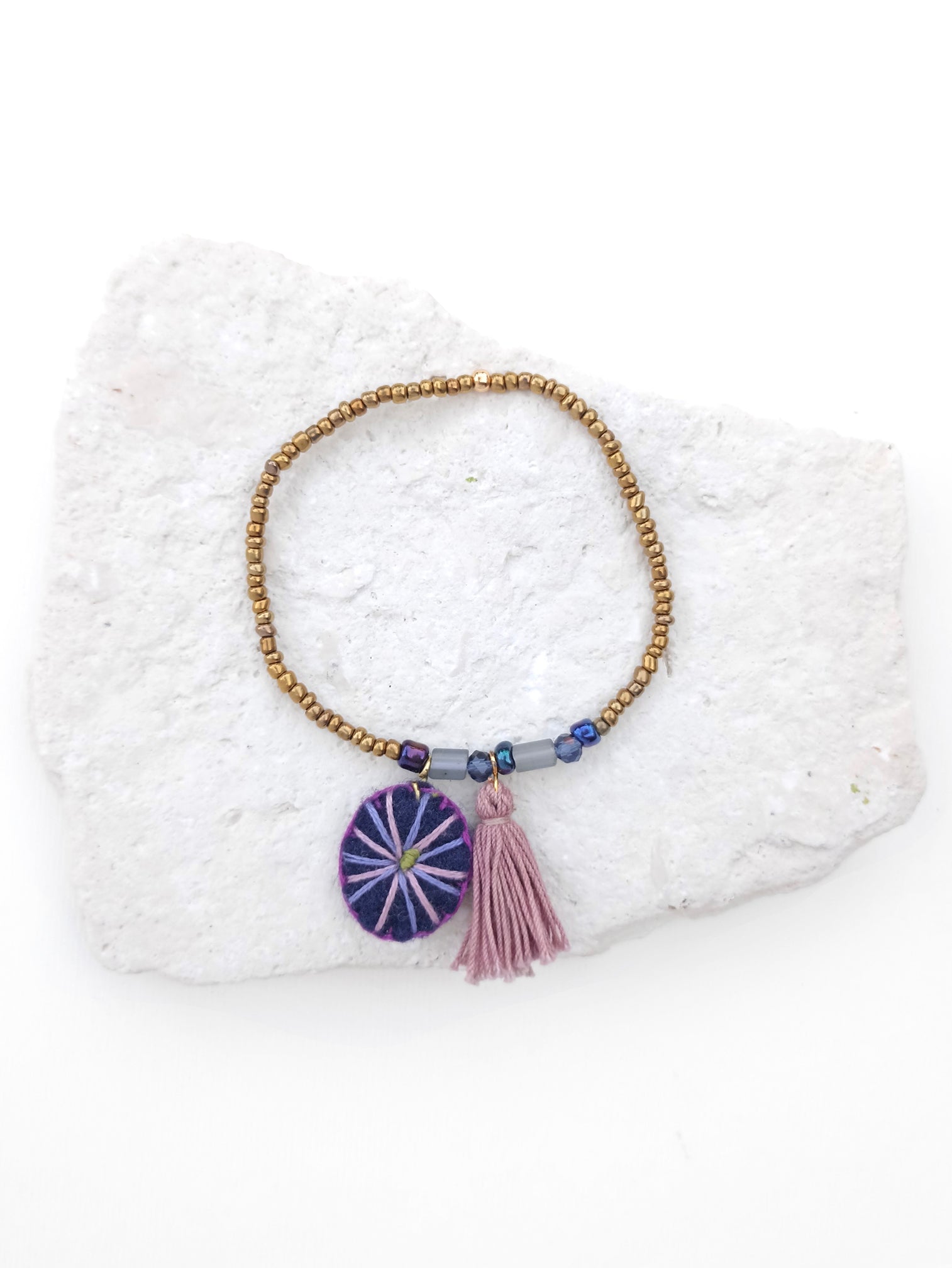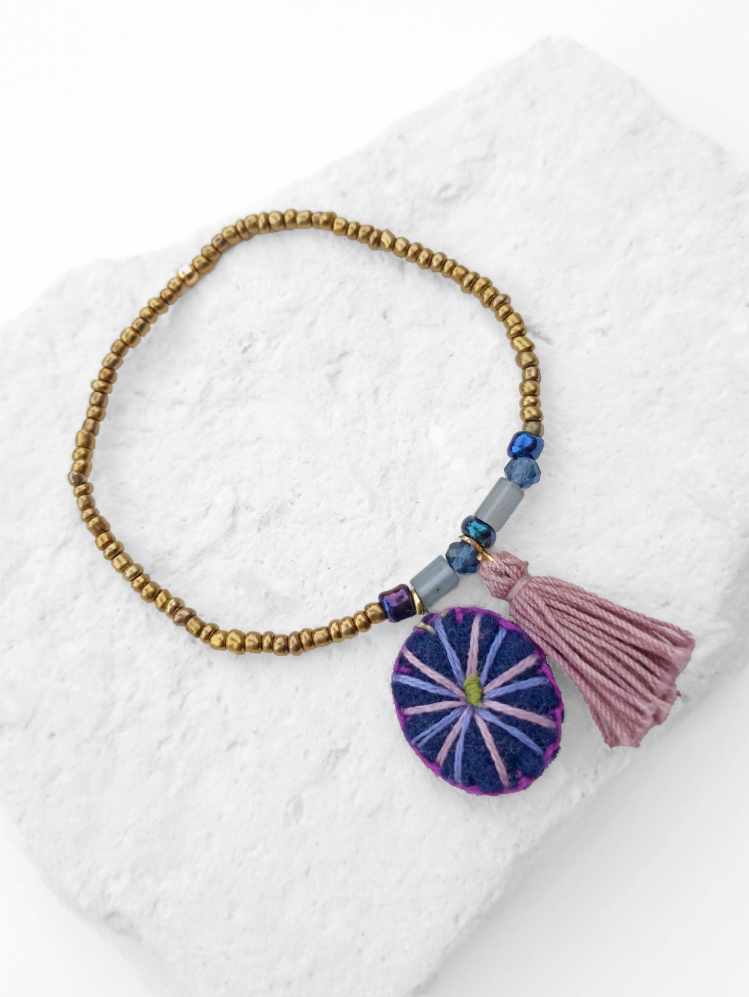 Pulsera con cuentas de vidrio color oro viejo y diferentes cuentas en tonos azules engarzadas en hilo elástico, con dije en forma redondo, bordado a mano con hilo de algodón color rosa, lila, morado y verde sobre fieltro azul. Pompón pintado a mano en tonos violetas.