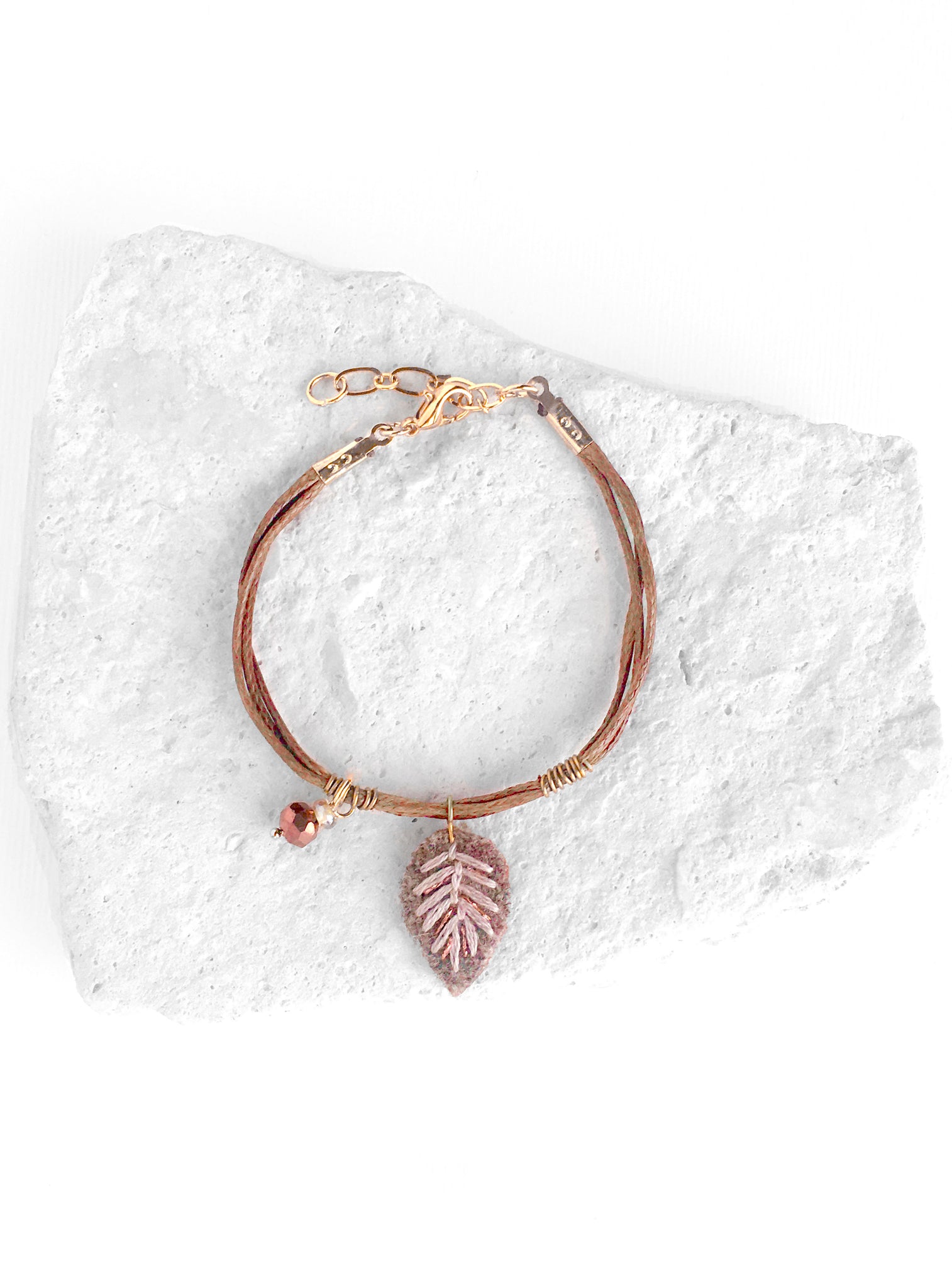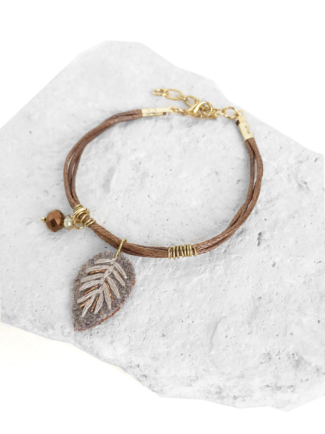 Pulsera de cordón con dije en forma de hoja, bordado con hilo de algodón color beige e hilo metálico color cobre, en tela de lana natural color gris. Cadena y componentes de chapa de oro.
