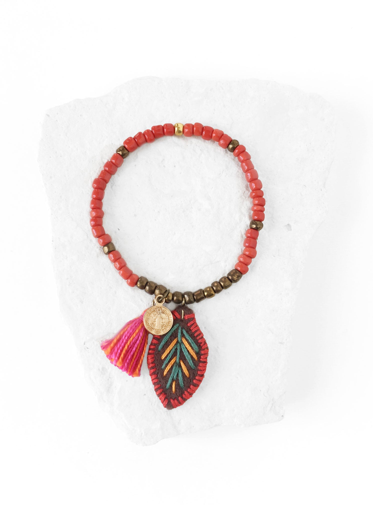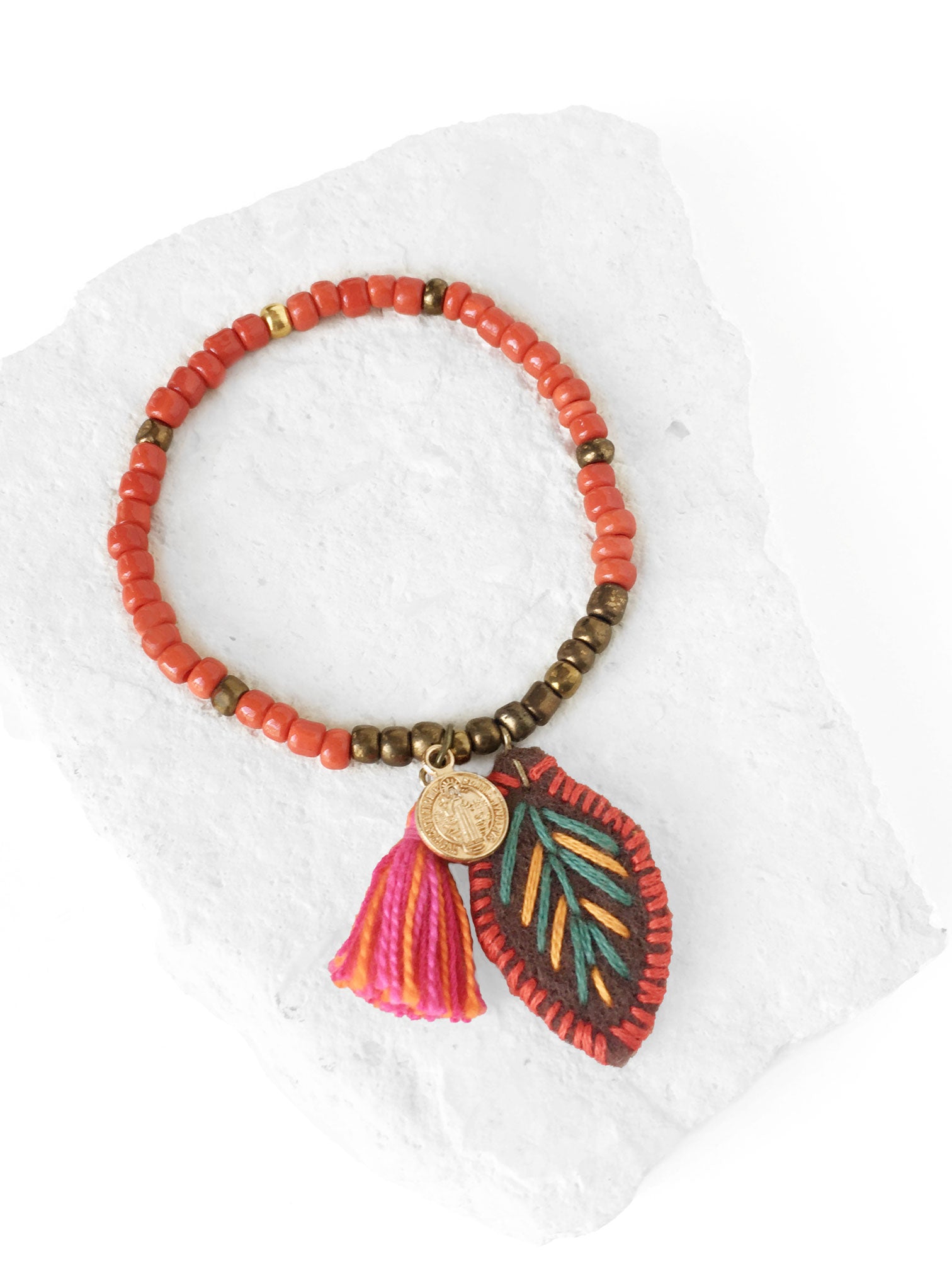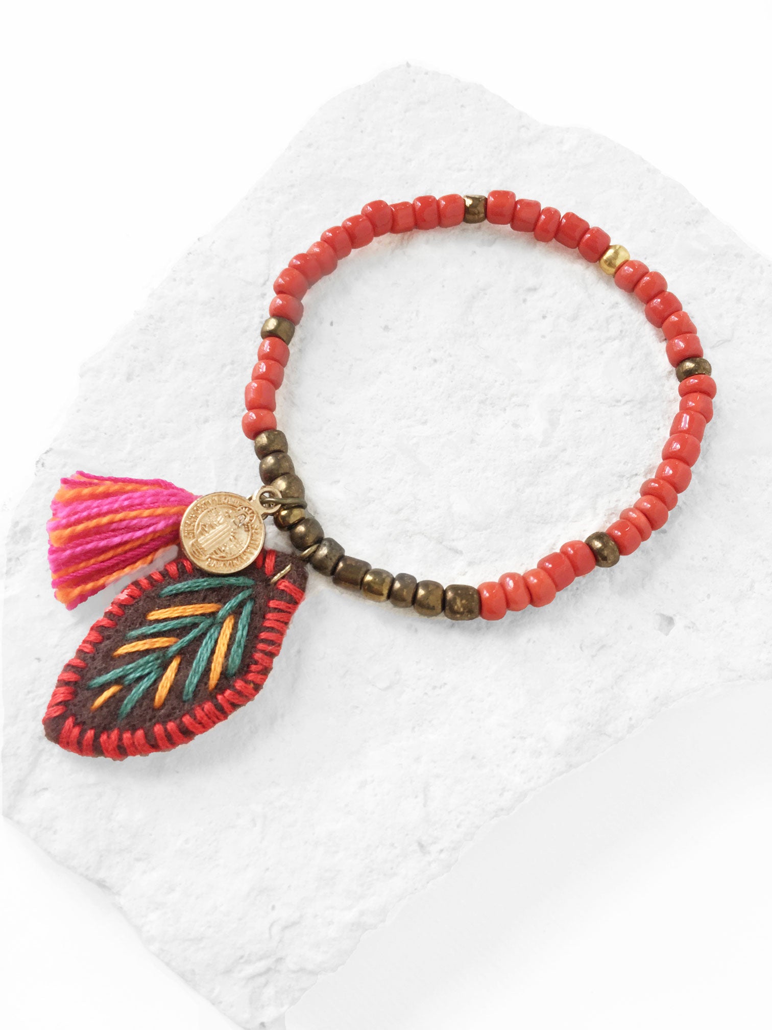 Pulsera con cuentas de vidrio color naranja, dije de metal y pieza en forma de hoja bordada a mano en fieltro café con hilo de algodón en tonos verde, turquesa, naranja y rojo.
