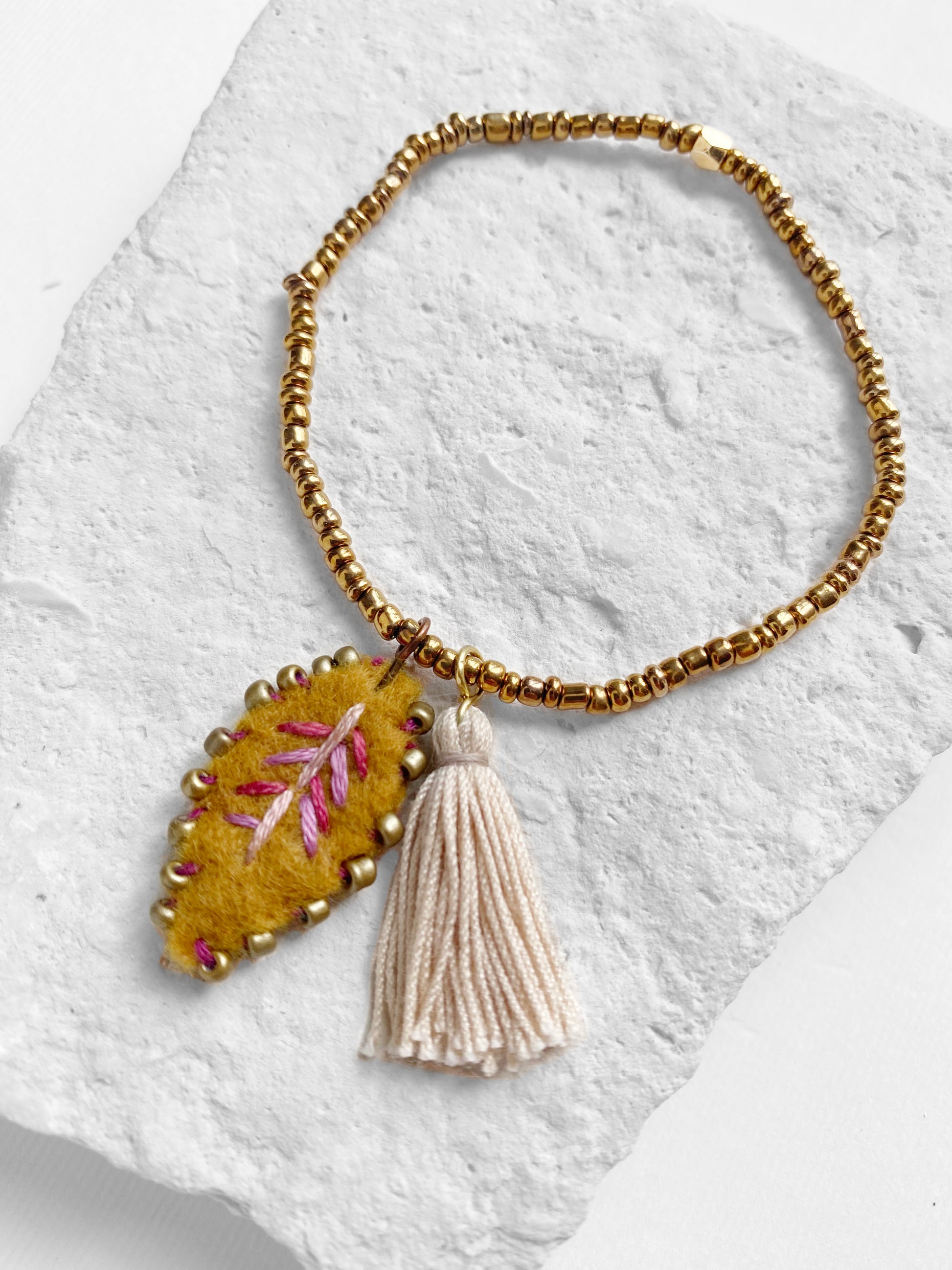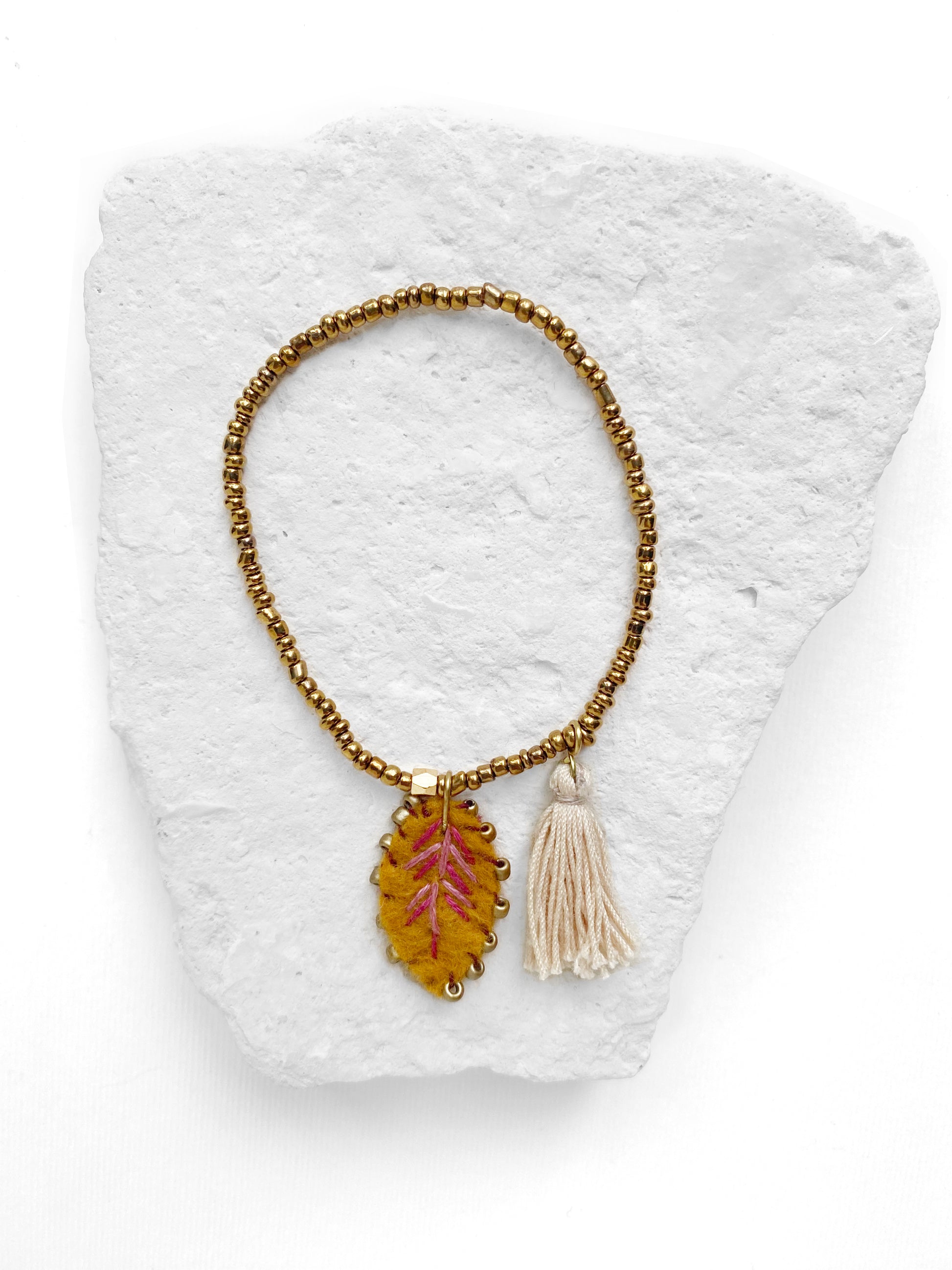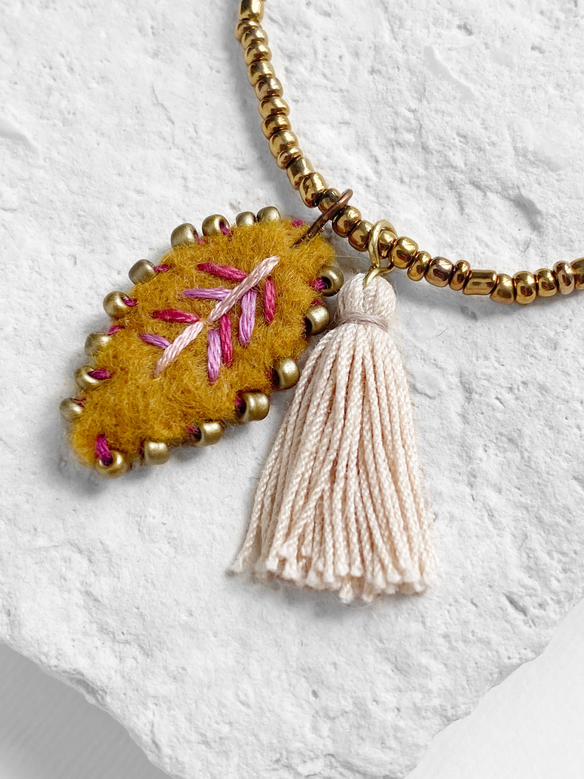 Pulsera con cuentas de vidrio color oro viejo y dije colgante en forma de hoja bordado a mano con hilo de algodón rosa sobre fieltro color mostaza y pompón beige.