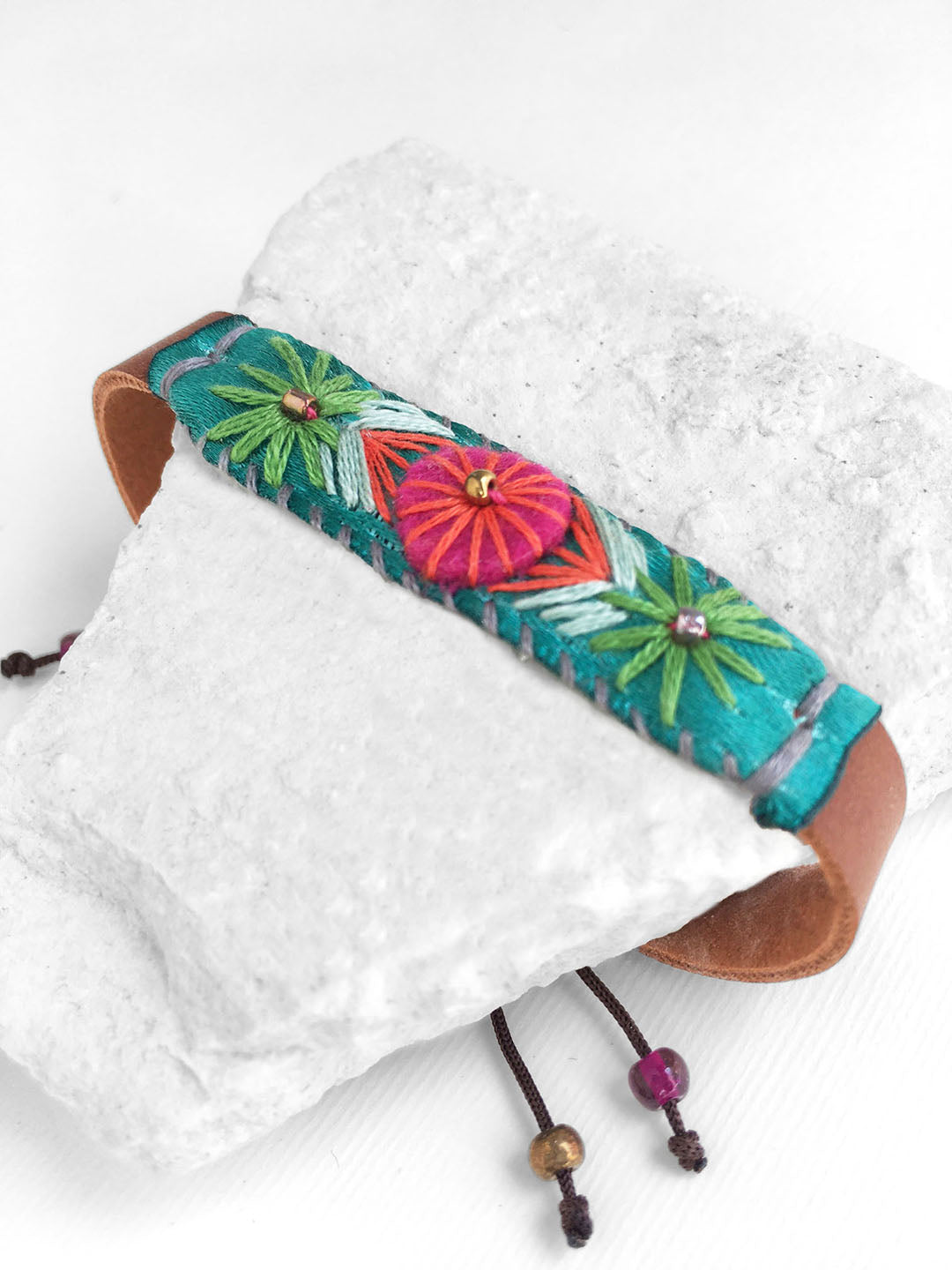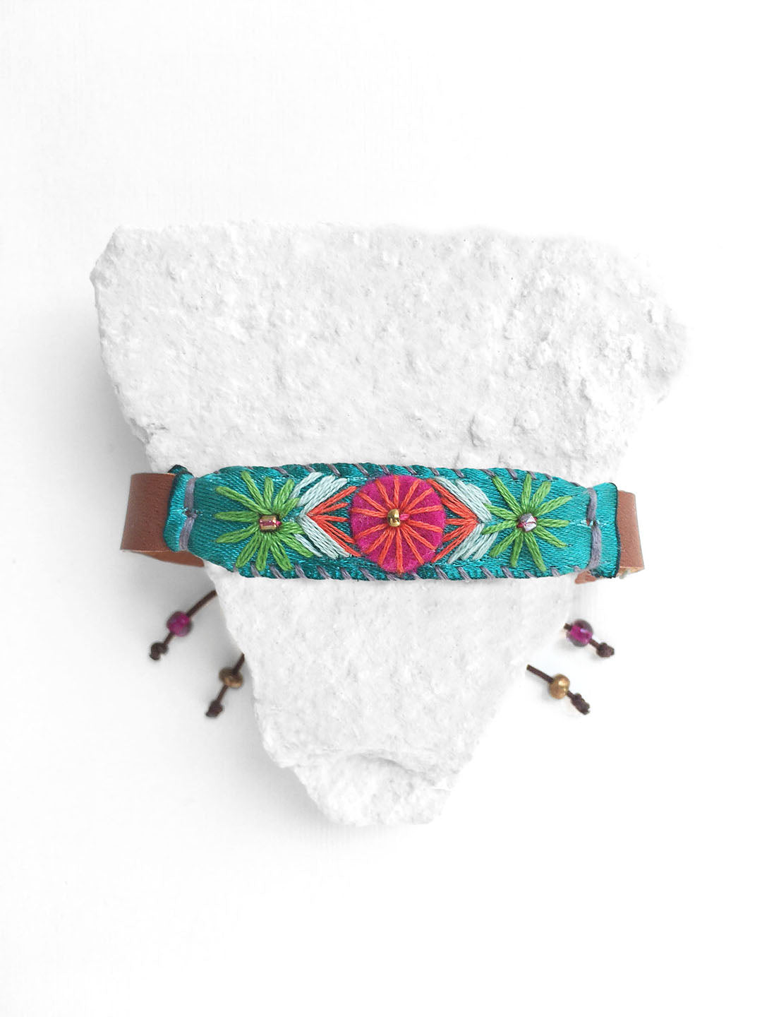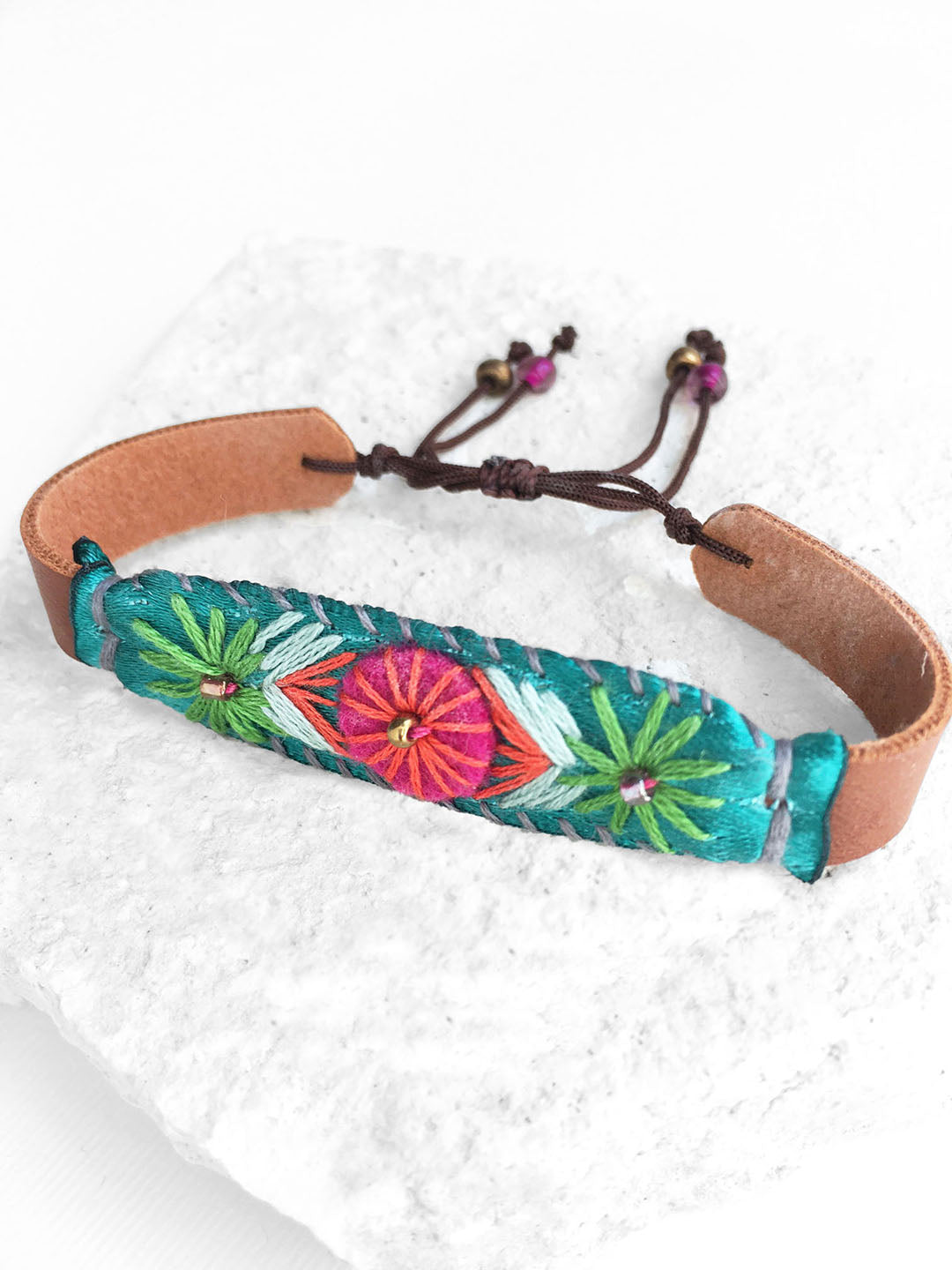 Pulsera bordada a mano con hilo de algodón en tonos naranja, verde y azul, sobre listón verde turquesa, fieltro rosa y vinipiel café, con broche ajustable de cordón café.