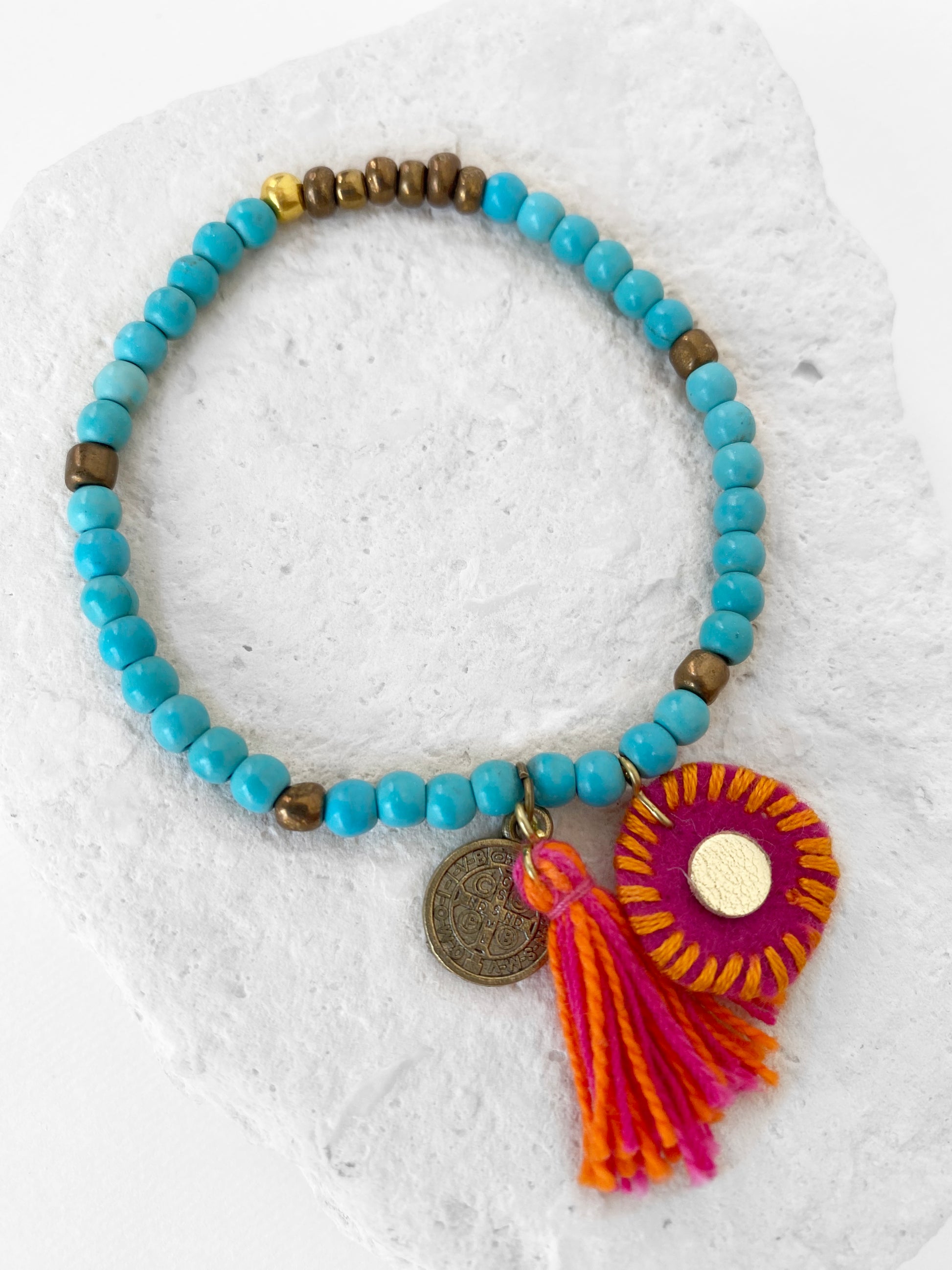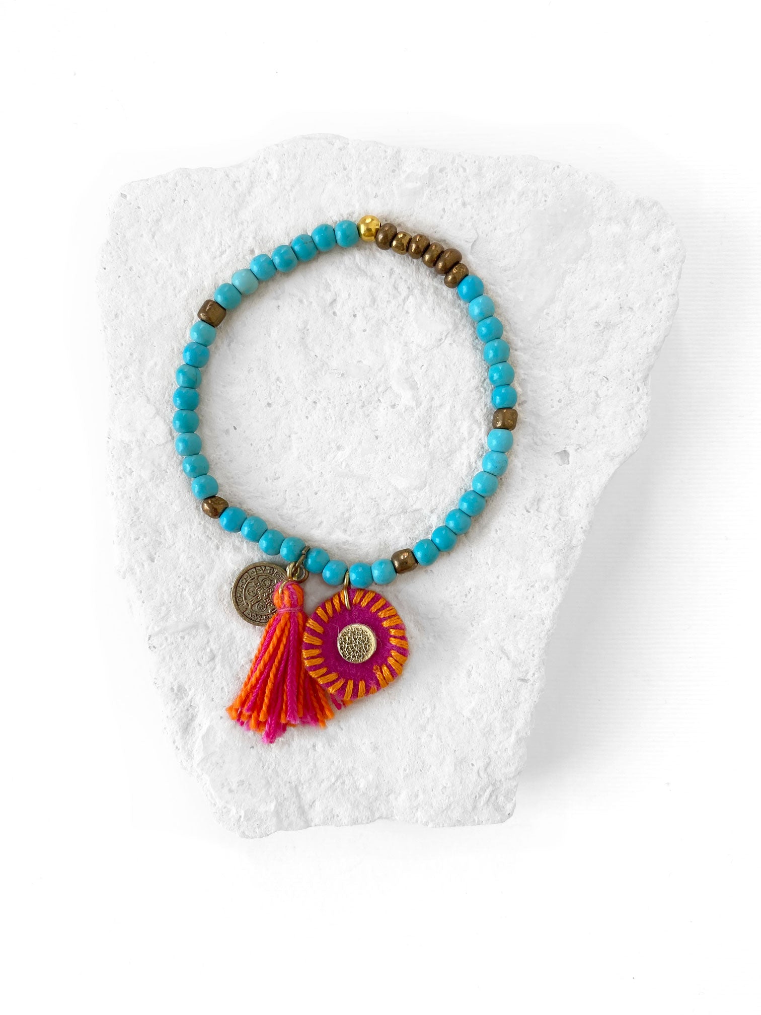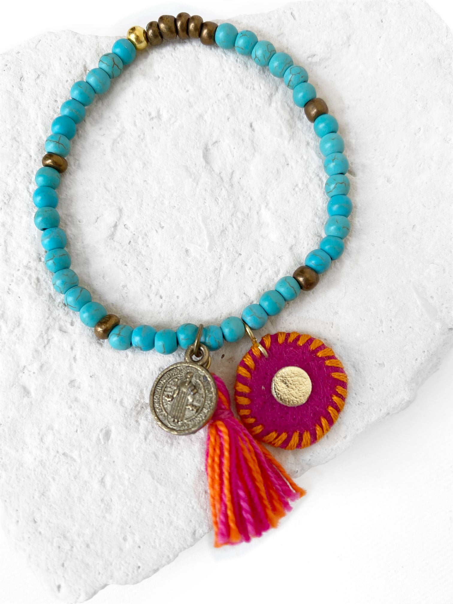 Pulsera con cuentas de turquesina color turquesa y cuentas de vidrio color oro viejo, con dije redondo, bordado a mano con hilo de algodón naranja sobre vinipiel dorada y fieltro naranja. Dije de metal y pompón de varios colores.
