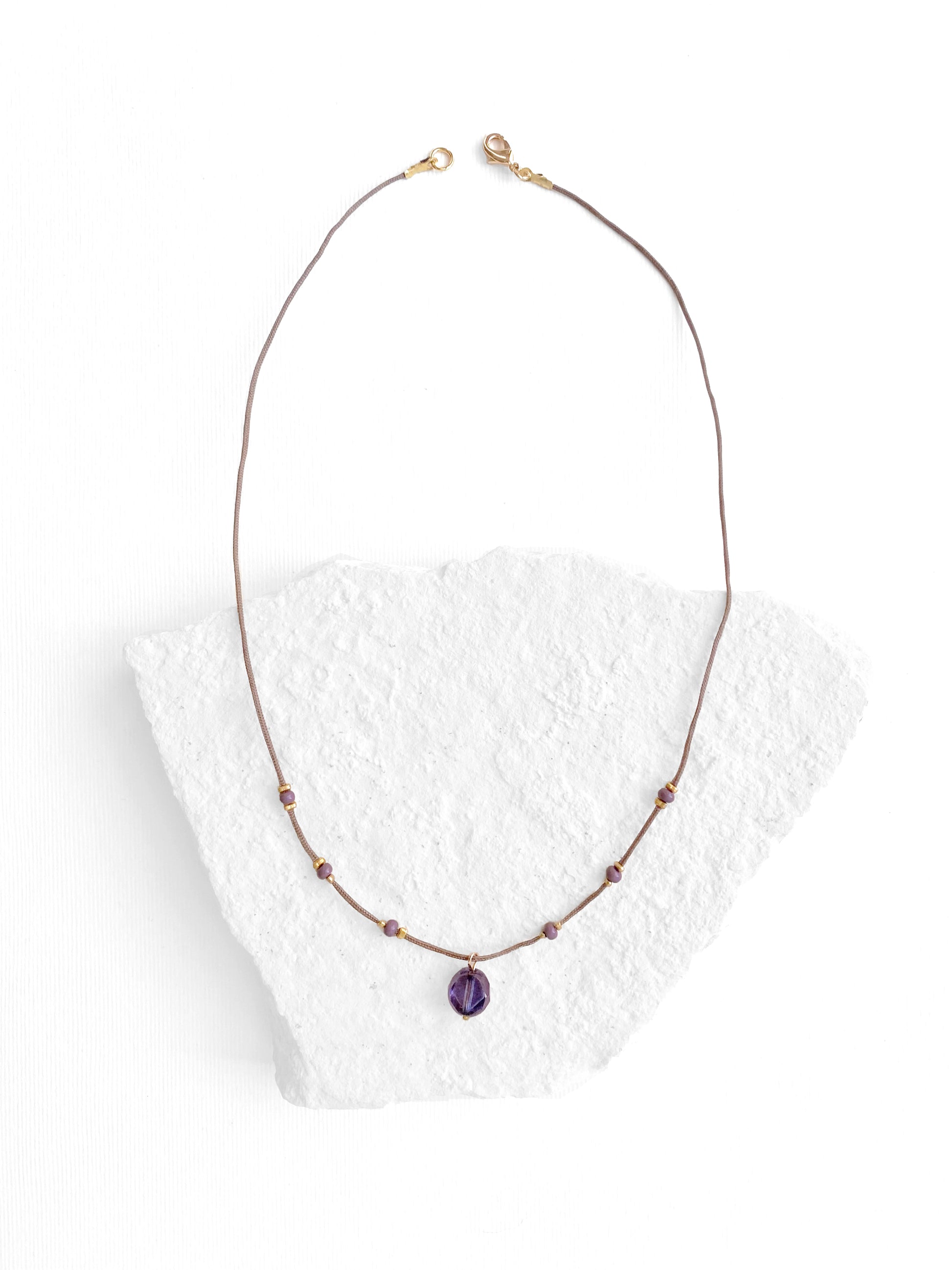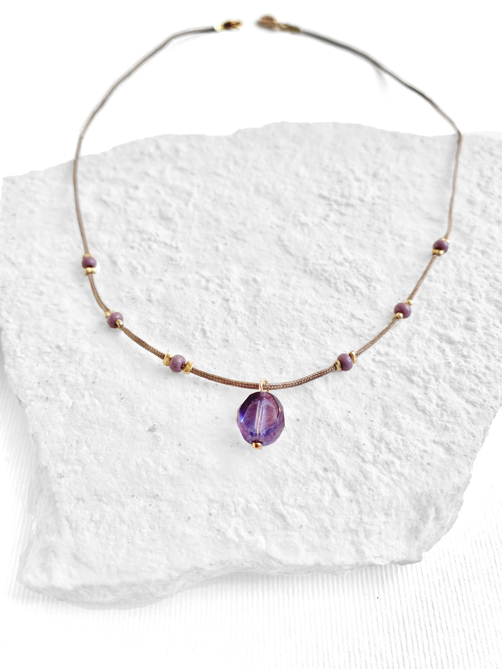 Collar de hilo sintético con cuentas de vidrio color lila y dije de cristal checo color morado. Broche de chapa de oro.